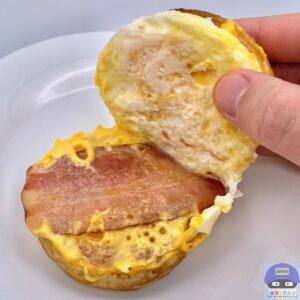 肉肉しいスモークベーコンの香ばしい旨みと塩気、ぷるぷるたまごのやさしい味わい、チェダースライスチーズのまろやかなコクもたまりません。