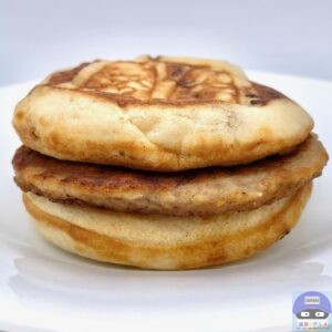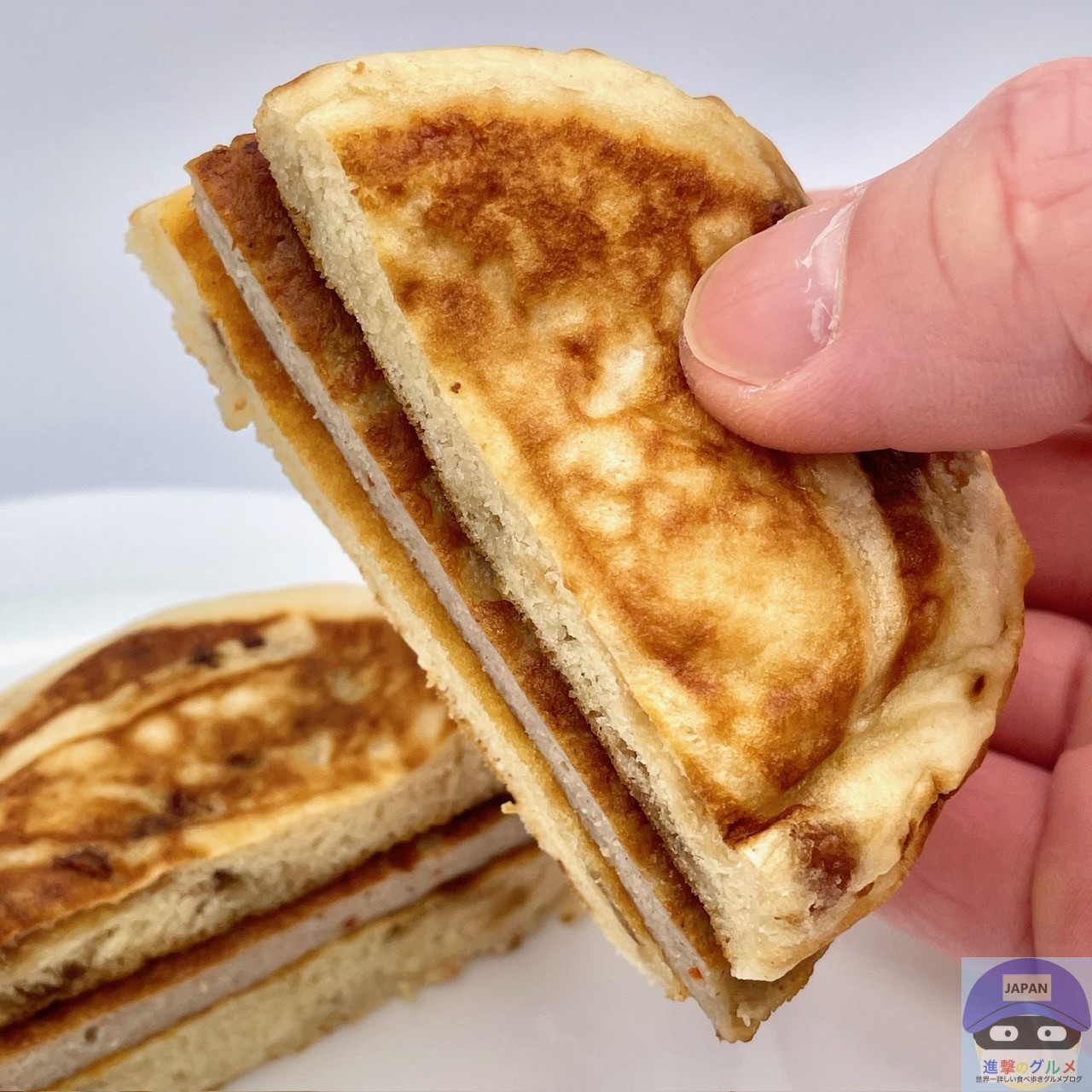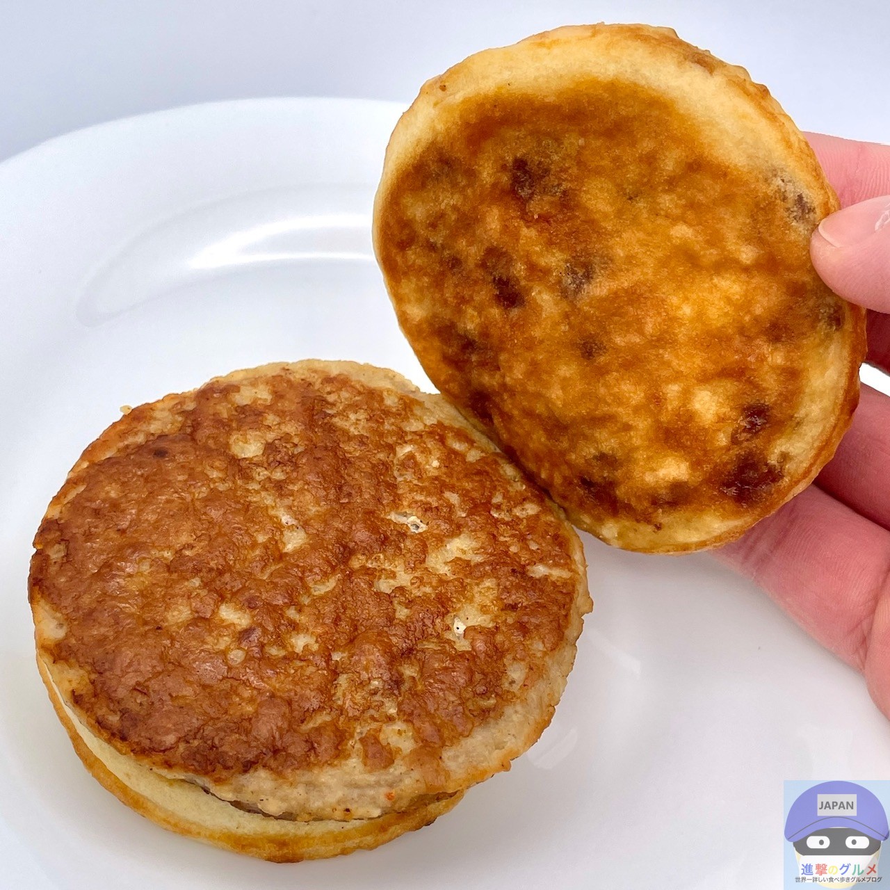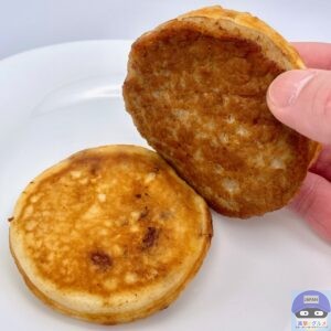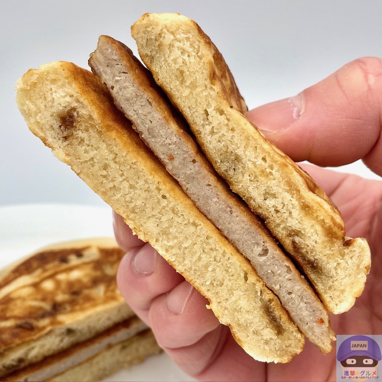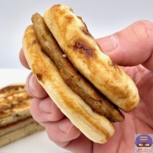 ソーセージパティをメイプル風シロップ入りのグリドルケーキで挟んでいます。