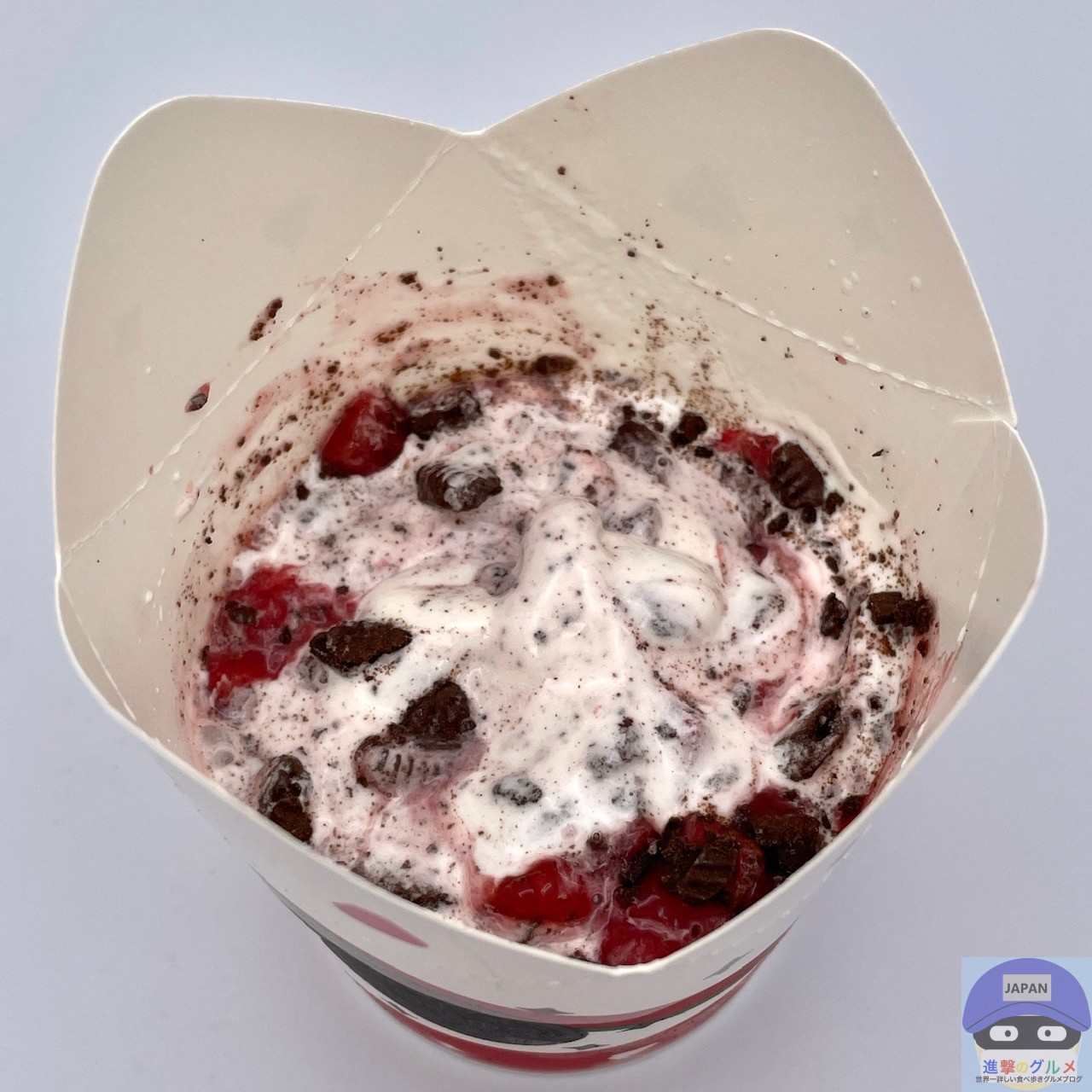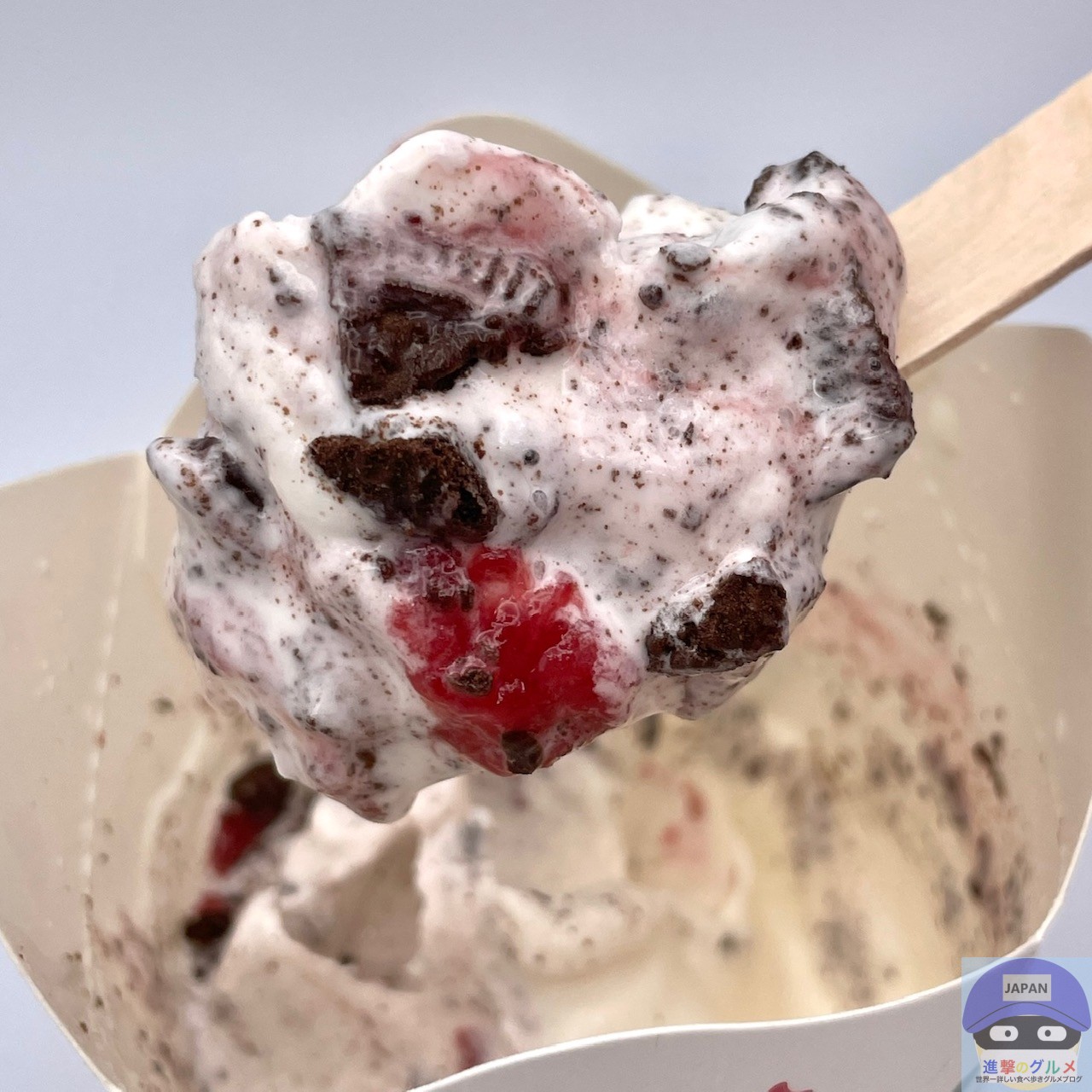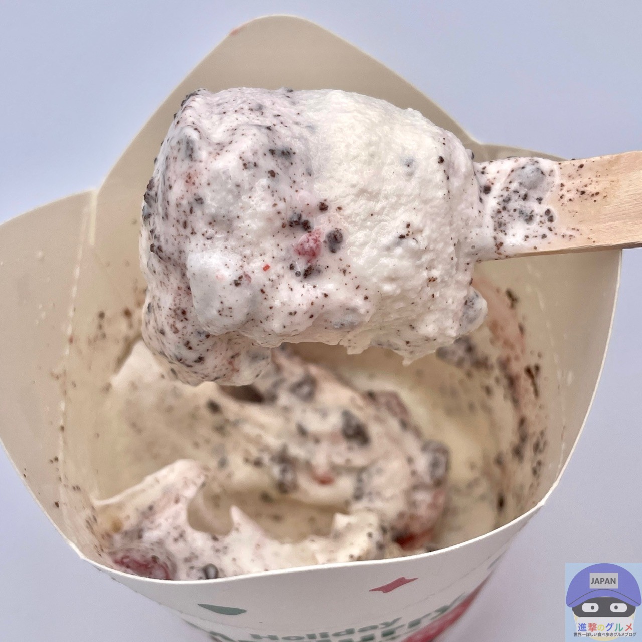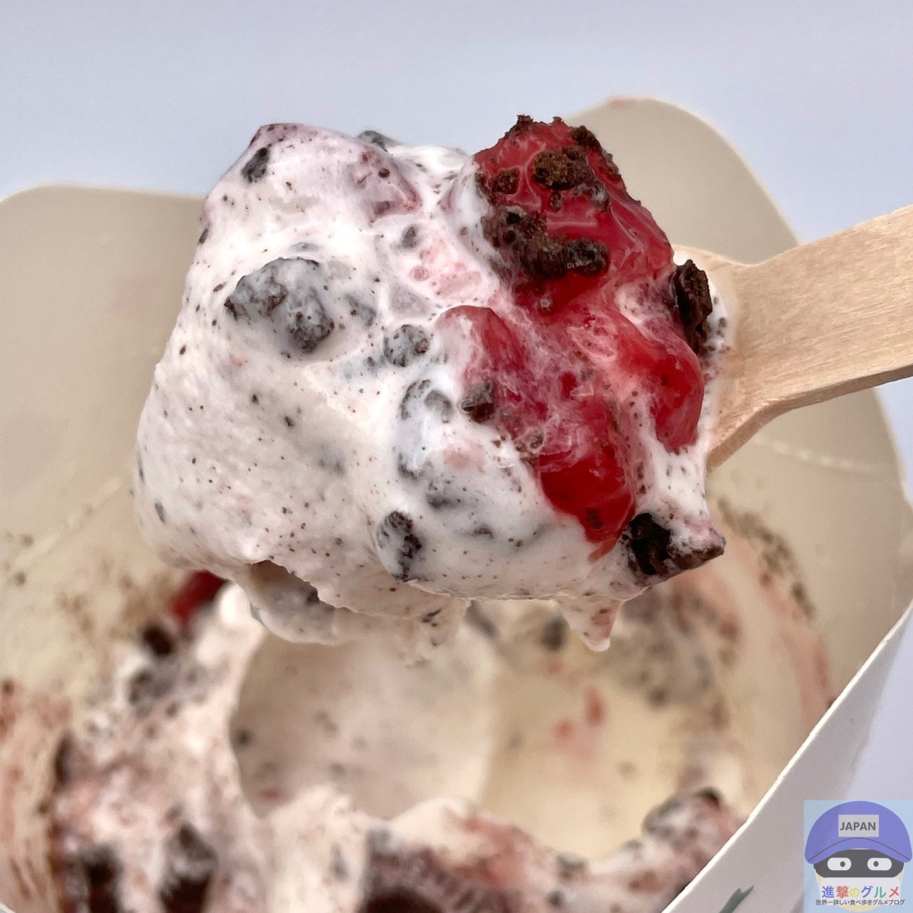 ザクザクしたオレオクッキーの香ばしさとほろ苦さ、ストロベリーソースの果肉感と甘酸っぱさがクセになります。