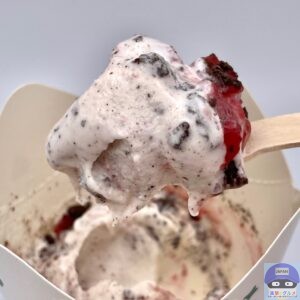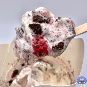 ソフトクリームに、オレオクッキーと果肉入りストロベリーソースを混ぜ込んでいます。
