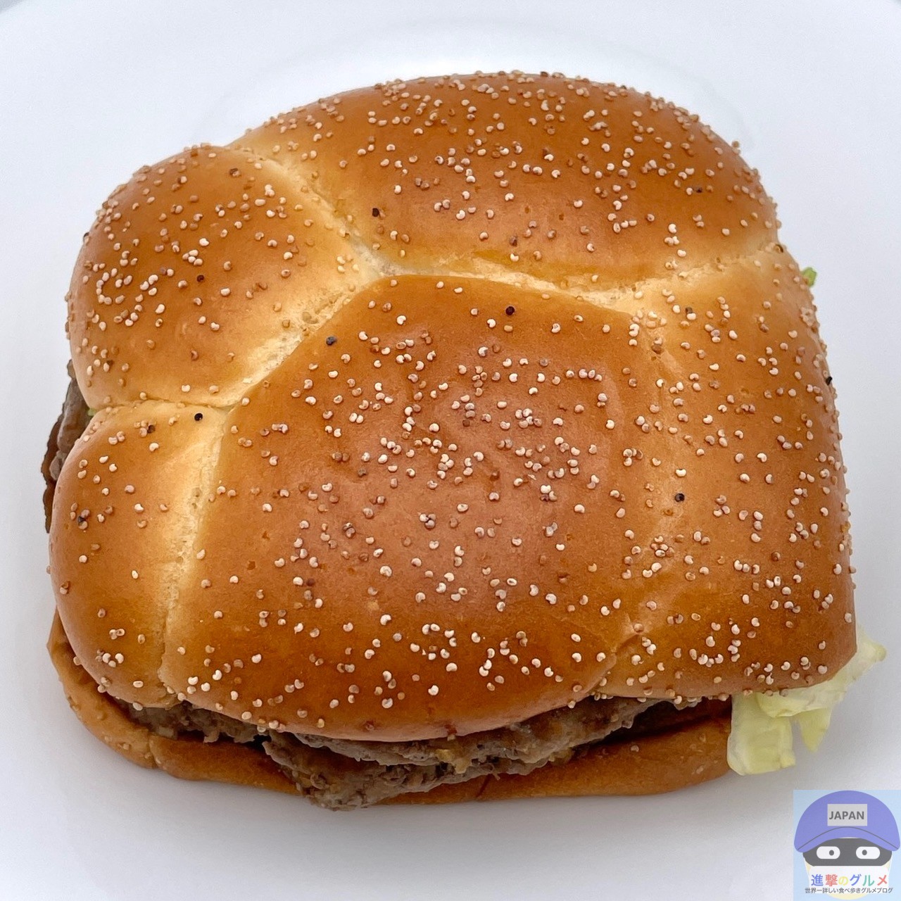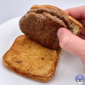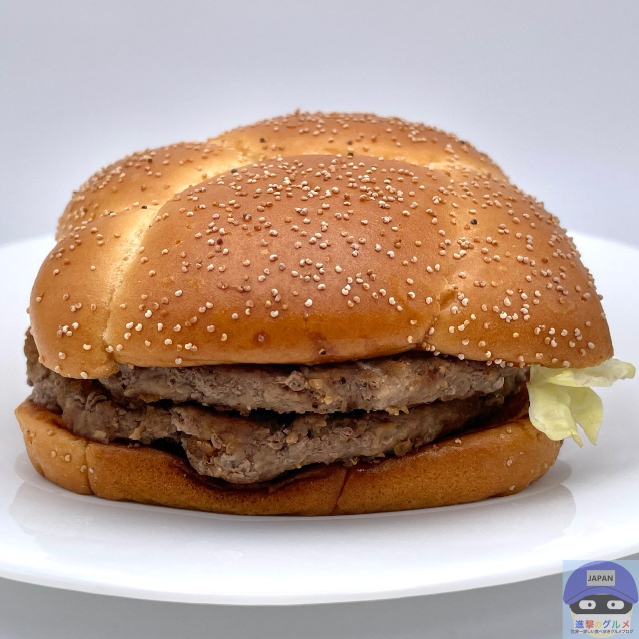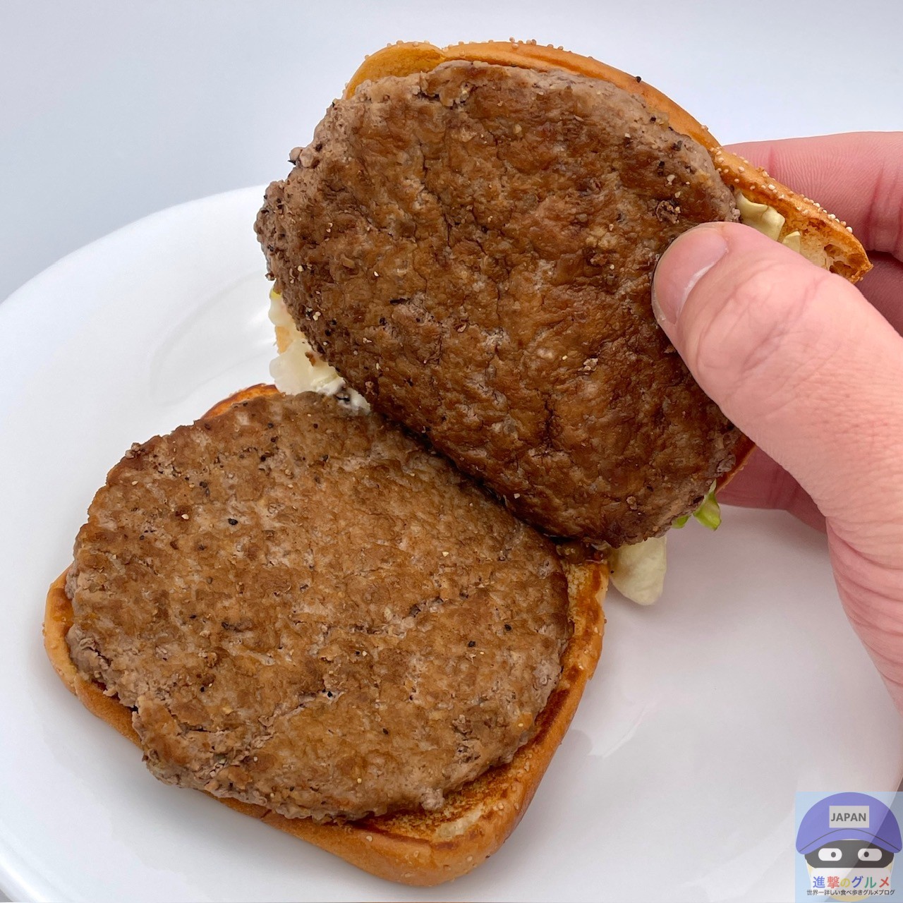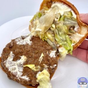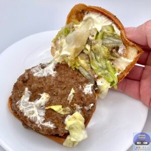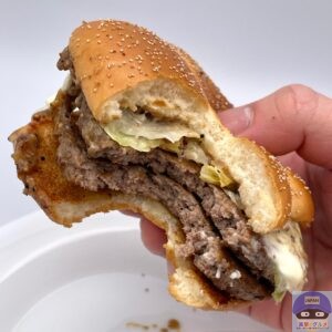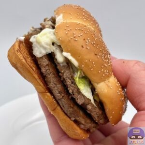 少しボソッとする歯触りで肉肉しさのある肉厚ビーフパティ2枚の香ばしい旨みが印象的、特製バンズのパサつきが気になります。