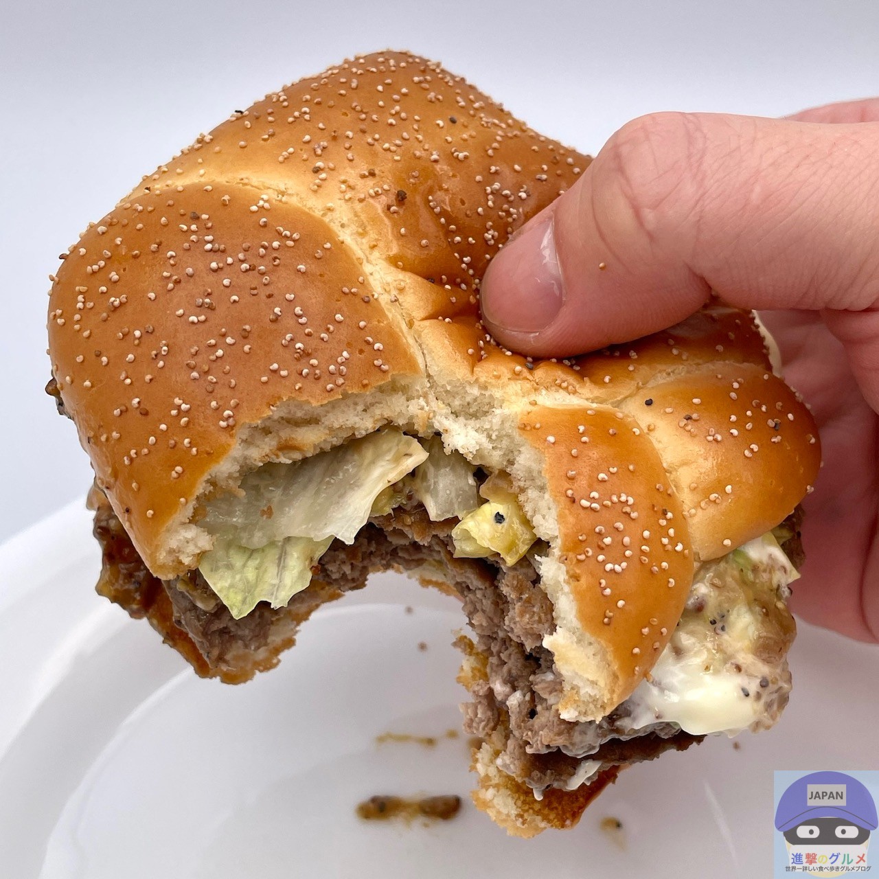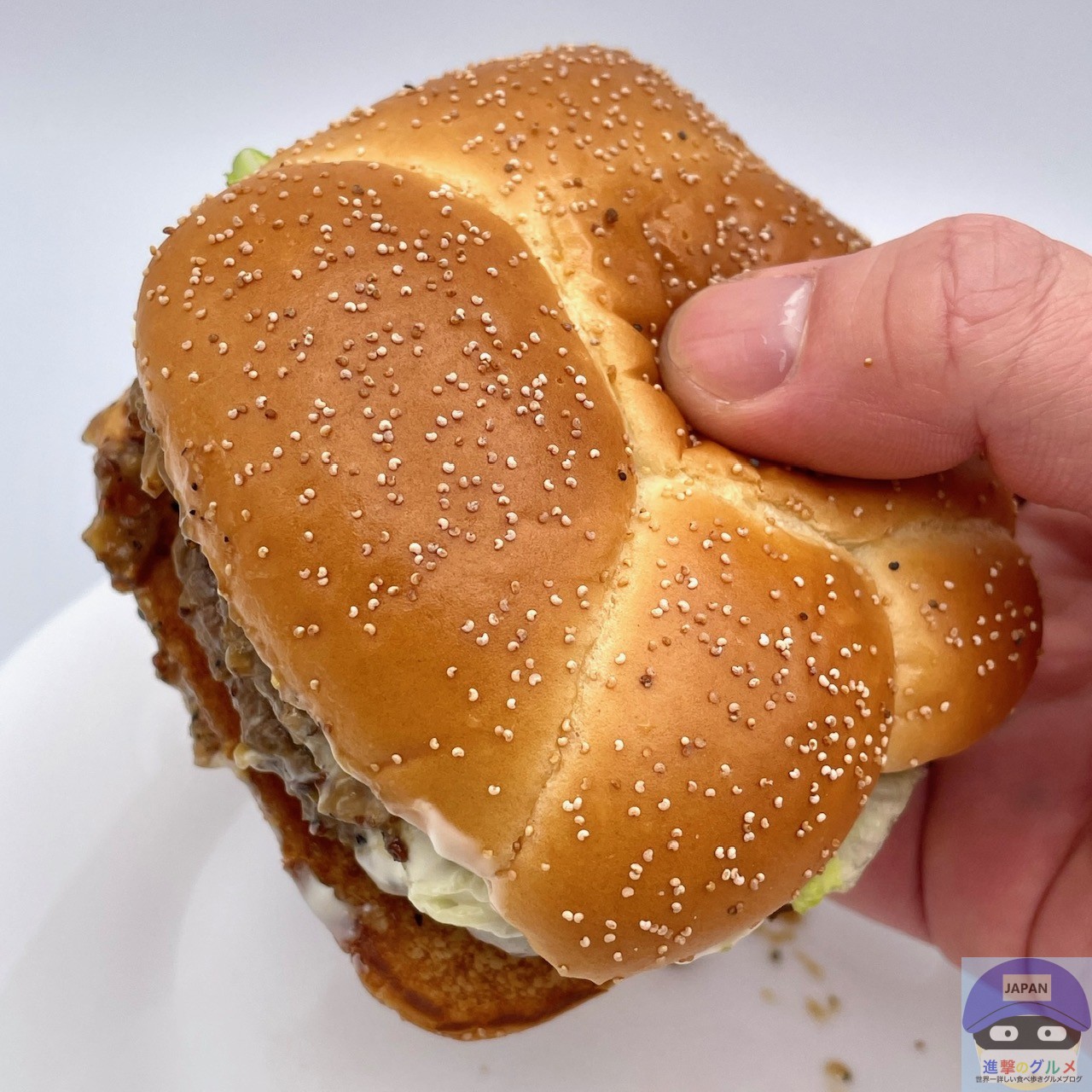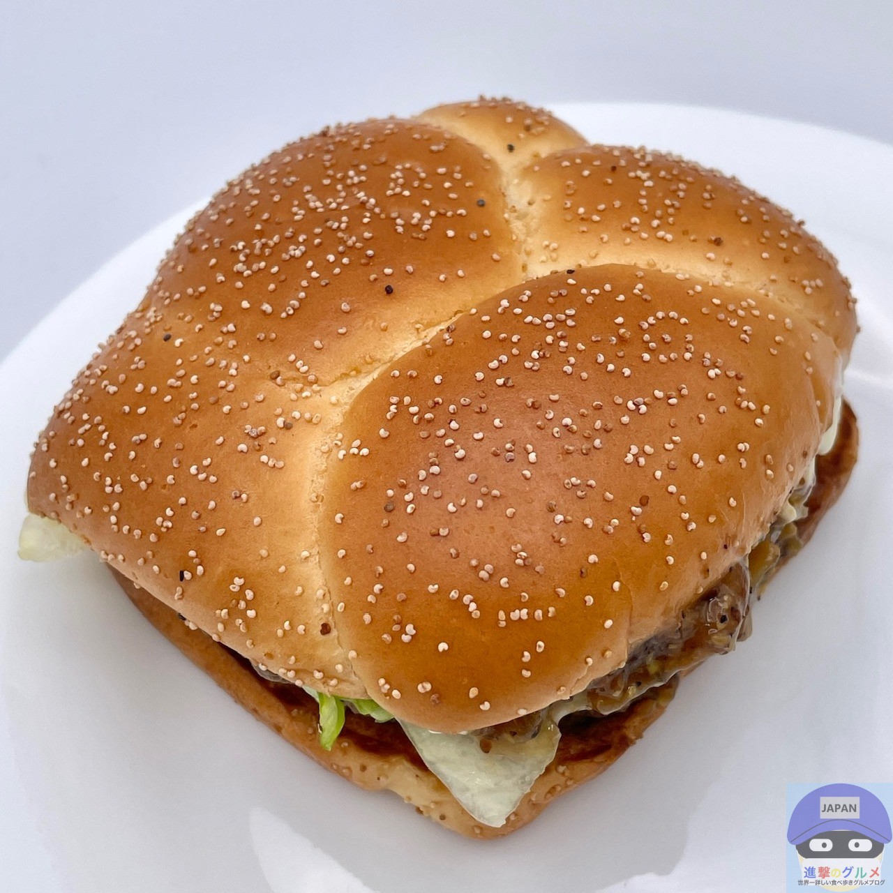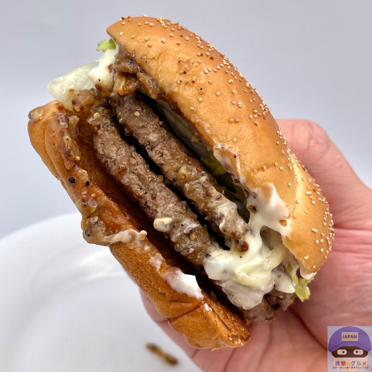 少しボソッとする歯触りで肉肉しさのある肉厚ビーフパティ2枚の香ばしい旨みが印象的、特製バンズのパサつきが気になります。