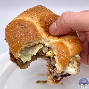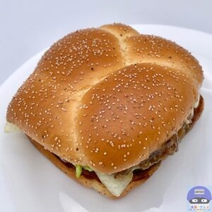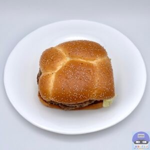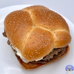 肉厚100%ビーフパティ2枚とでこぼこのバンズで厚みがあり、ユニークな見た目のハンバーガーです。