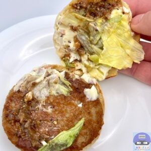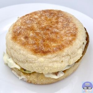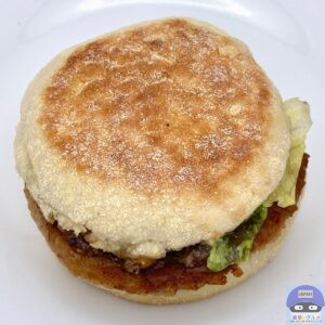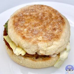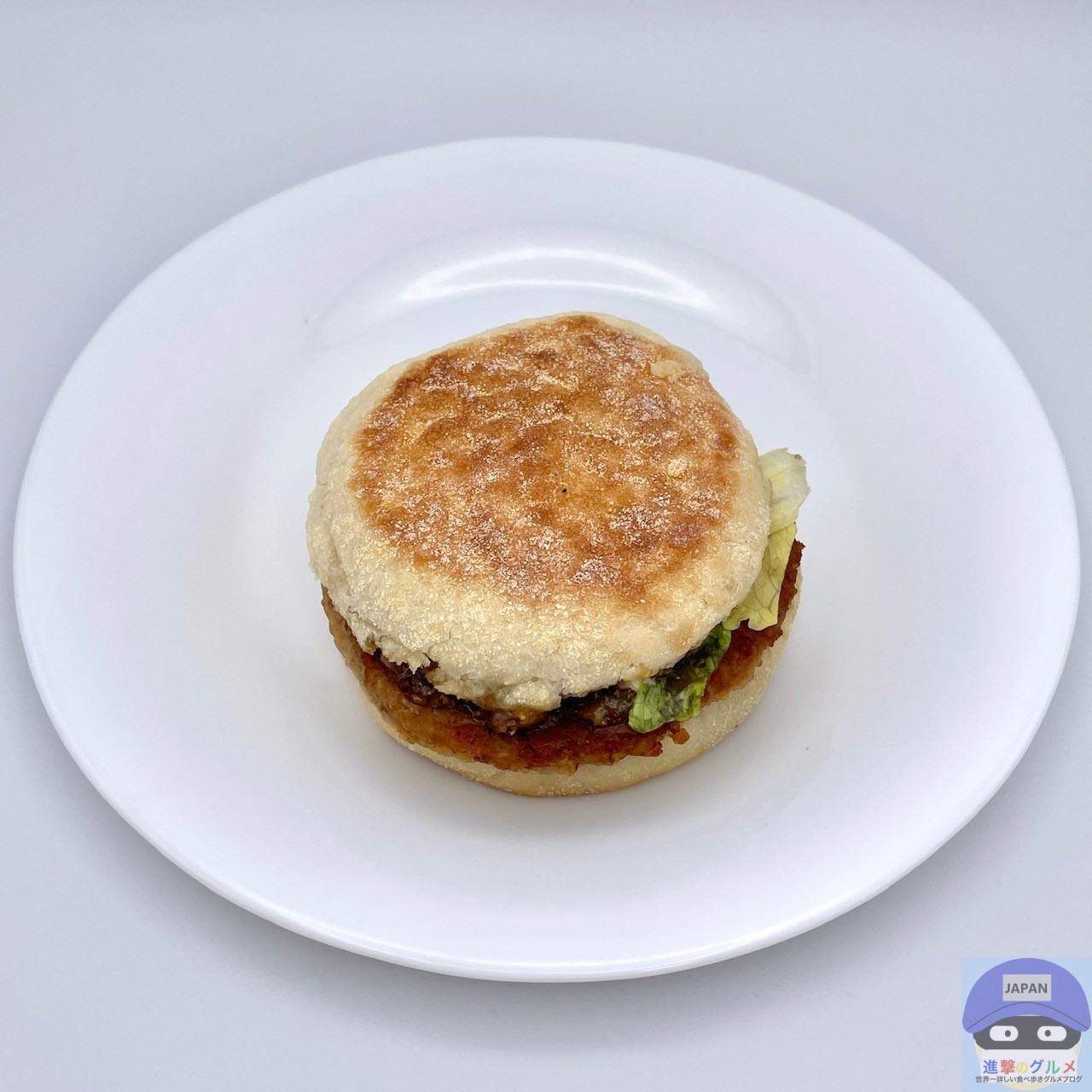イングリッシュマフィンが香ばしく焼かれ、具材やソースが少しはみ出たシンプルな見た目です。