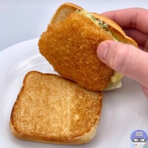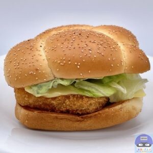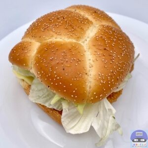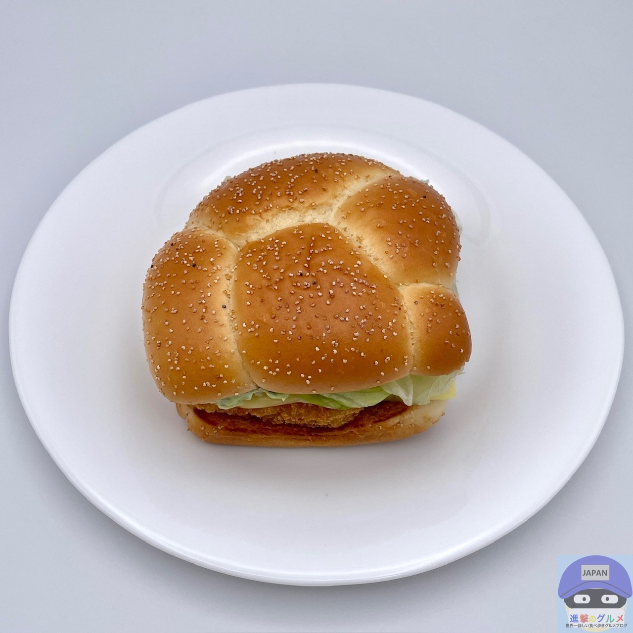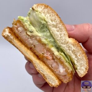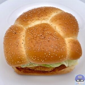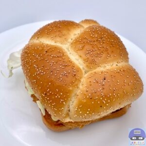 えびカツとでこぼこのバンズで厚みがあり、ユニークな見た目のハンバーガーです。
