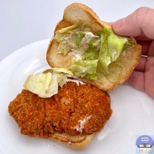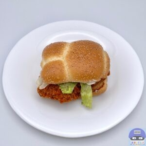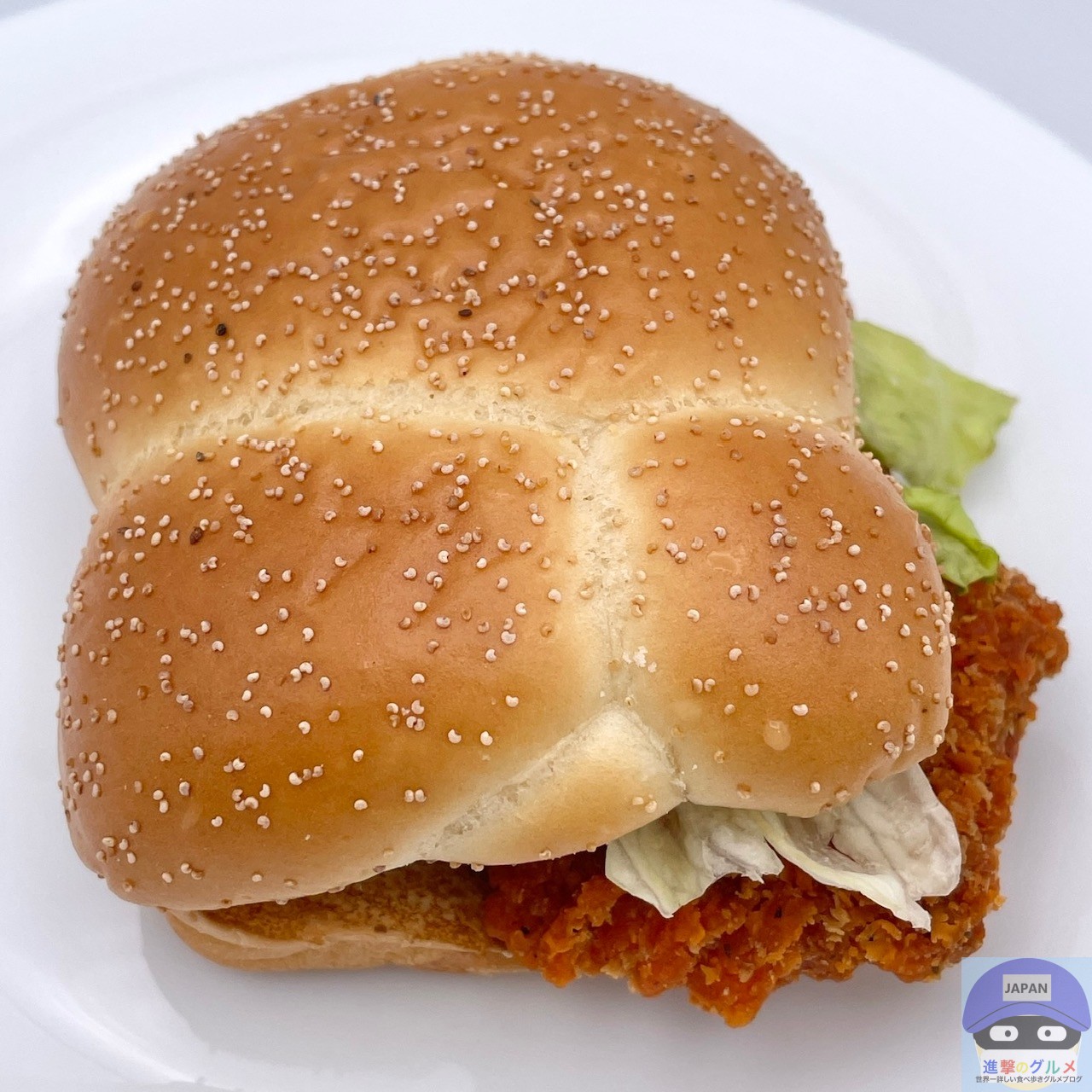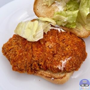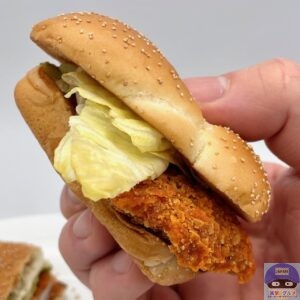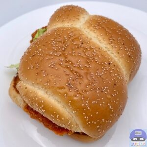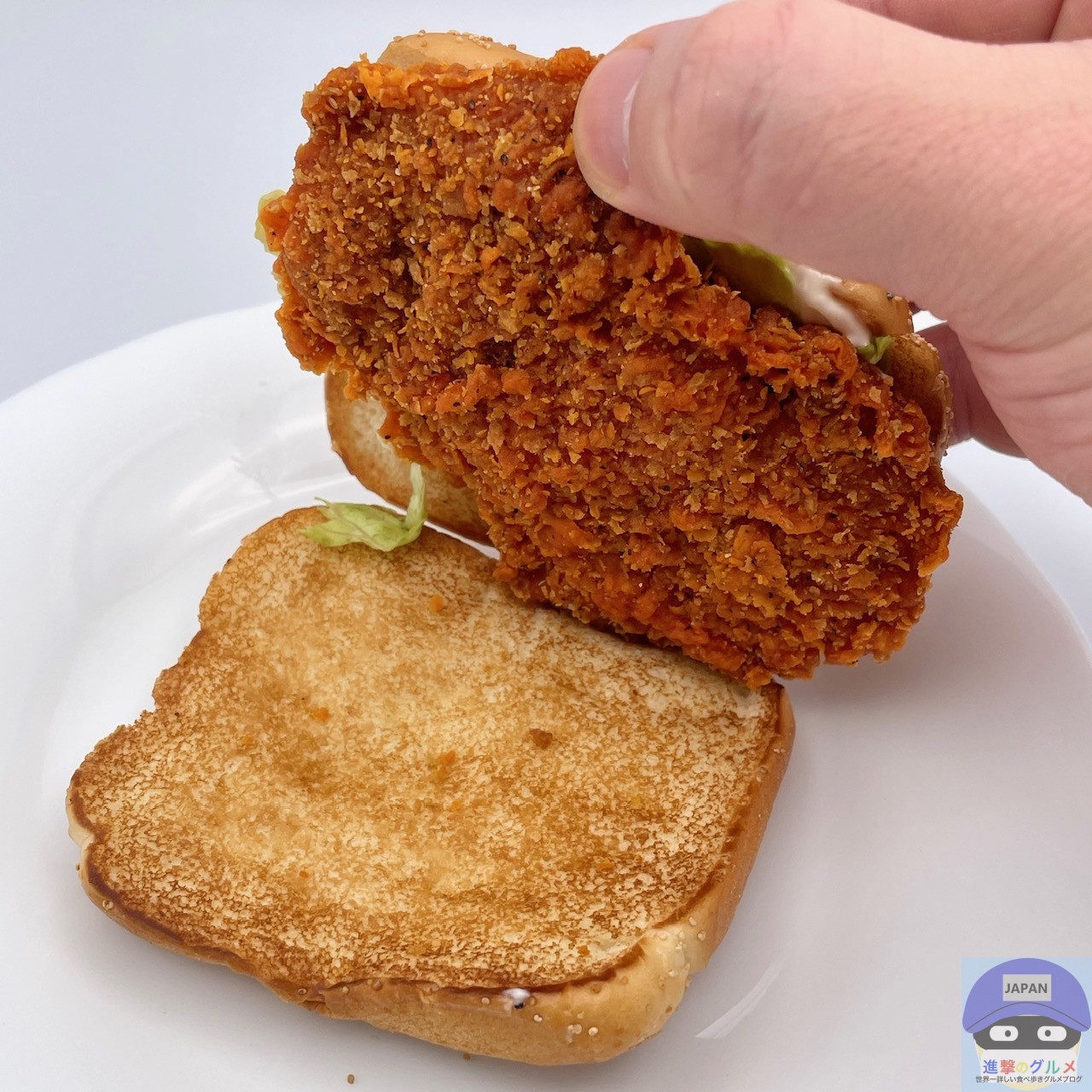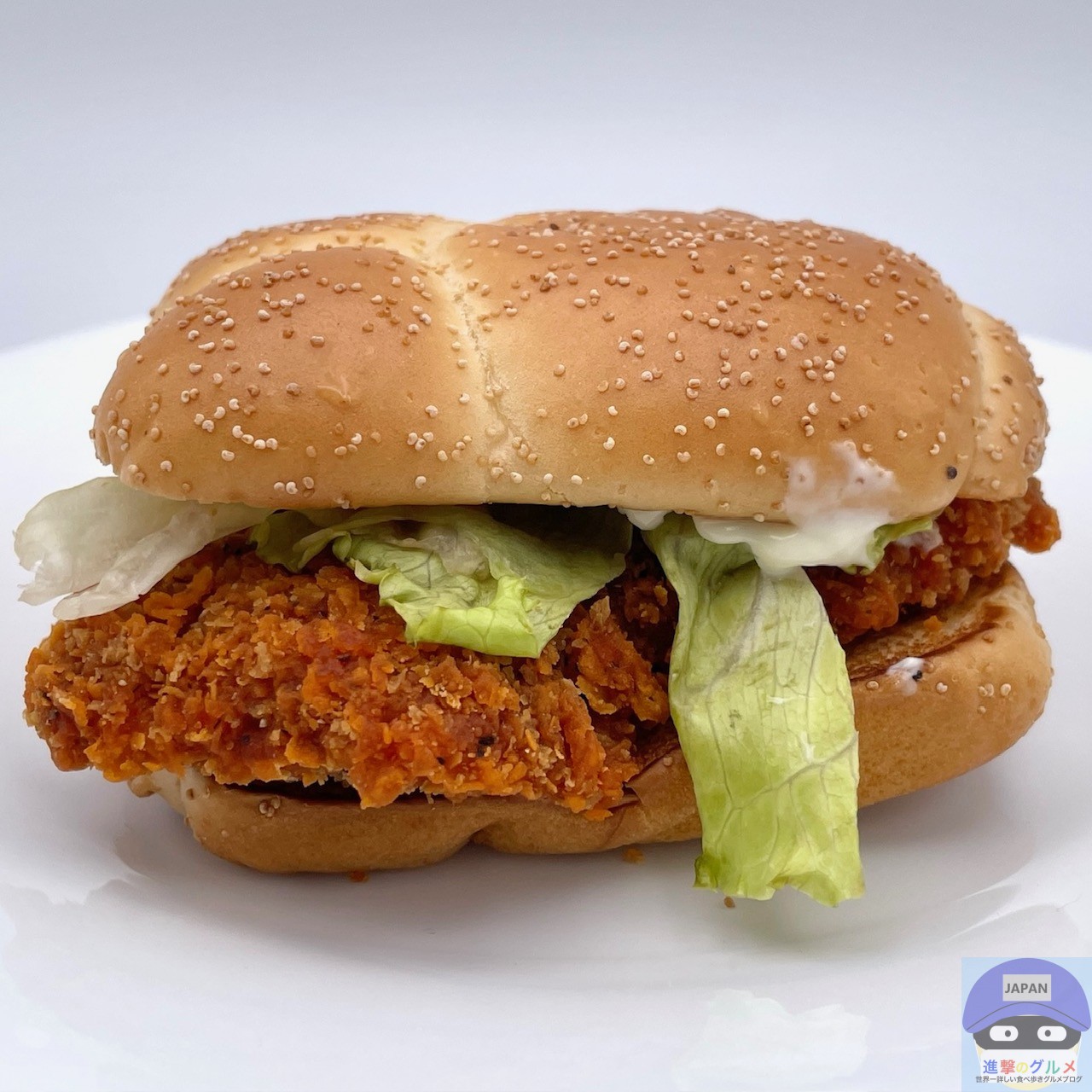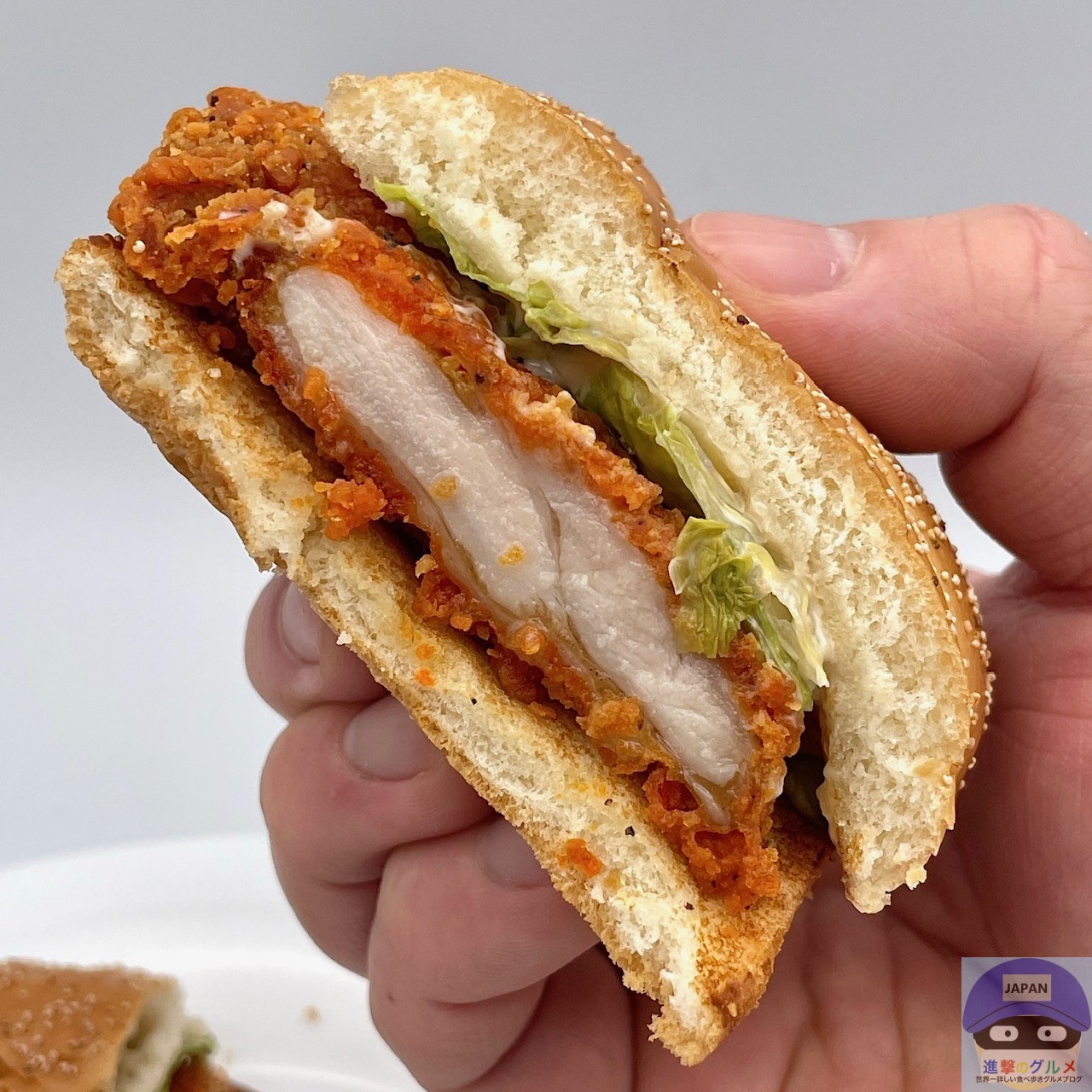 分厚いチキンとパサつきが気になる特製バンズで食べごたえがあり、全体としては、辛味とパサつきで水分が欲しくなります。
