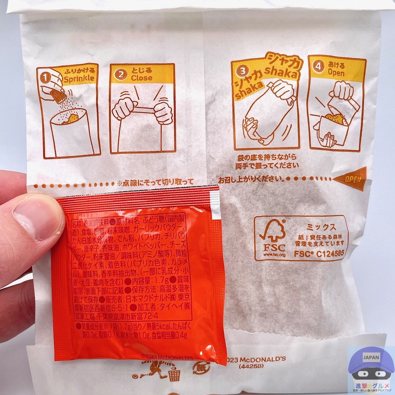 専用の紙袋にレッドペッパー味シーズニングを入れて、シャカシャカ振ります。