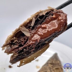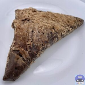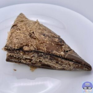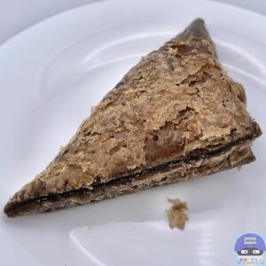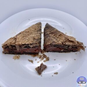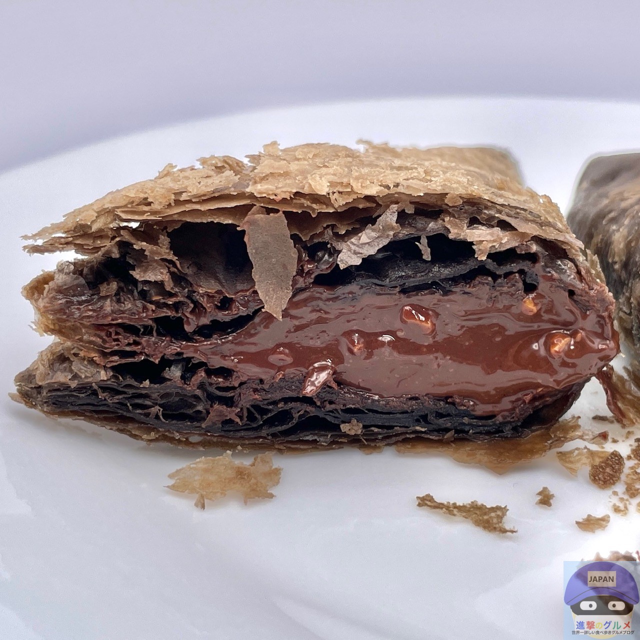 ほろ苦いチョコのコクと濃い風味、香ばしいパイ生地の味わいがクセになる大人な味わい、濃厚さで水分が欲しくなります。