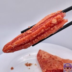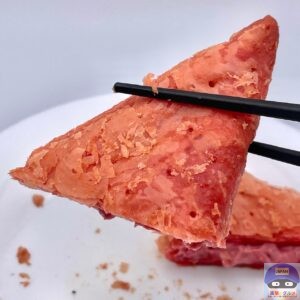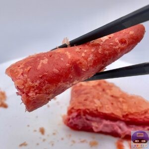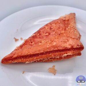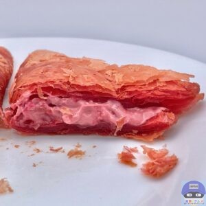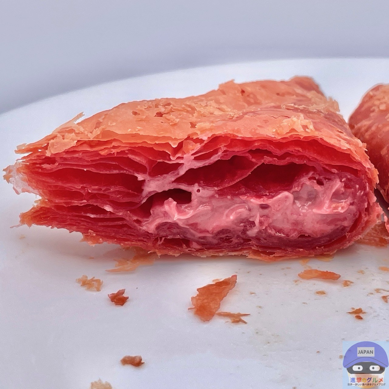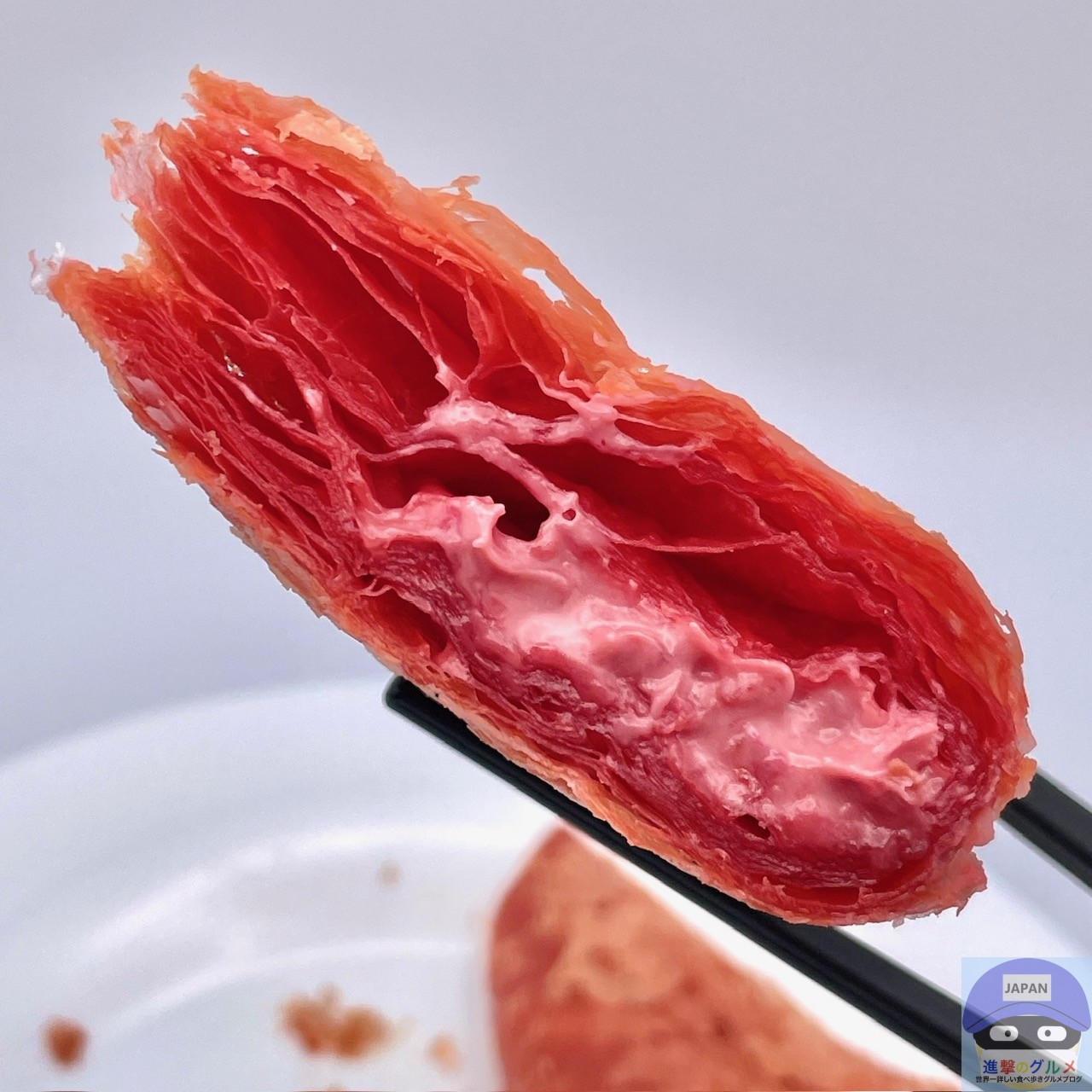何層にも重ねたピンク色のパイ生地に、ストロベリーコーンクラッシュ入りのいちごチョコクリームが入っています。