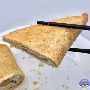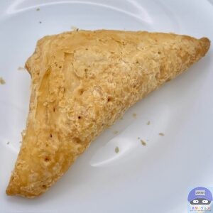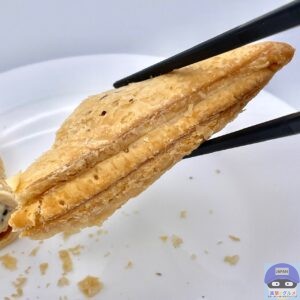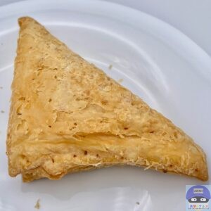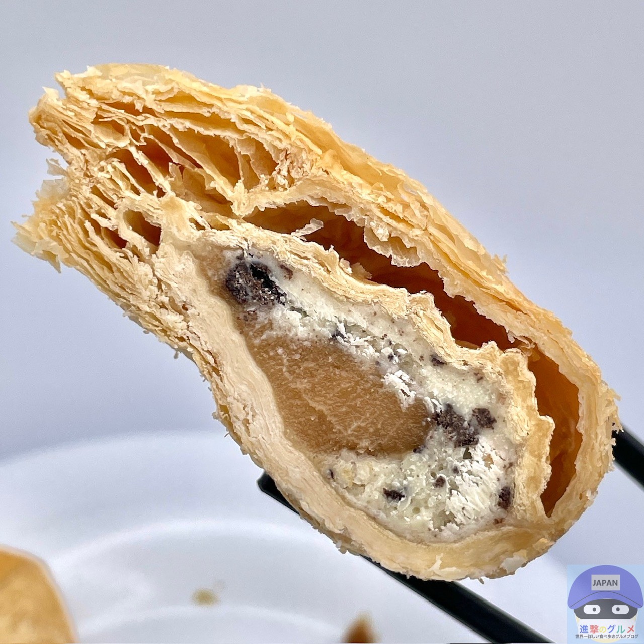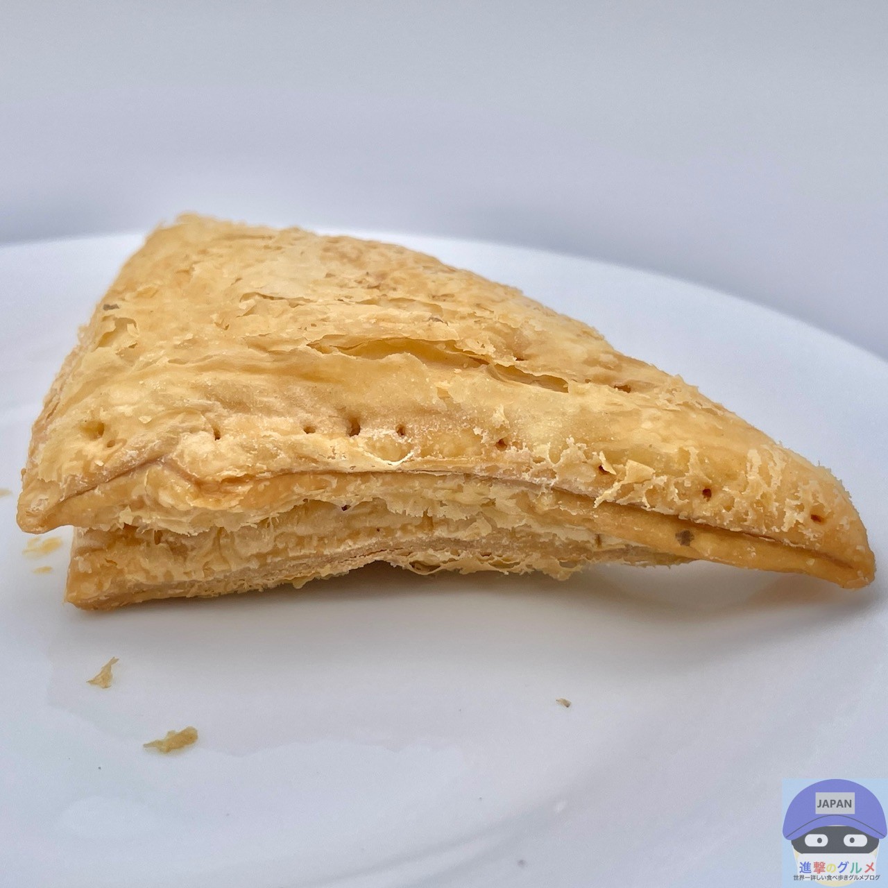 パイ生地の端の部分がサクッとしっとり、ひんやりしてコーンクラッシュが少しザクッと、2種類のクリームの甘みを感じます。