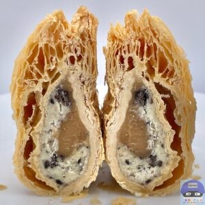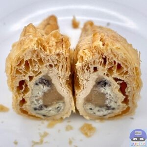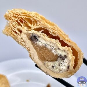 何層にも重ねたパイ生地に、マスカルポーネチーズやココアクッキーを使用したチーズチョコクリームと、コーヒークリーム、コーンクラッシュが入っています。