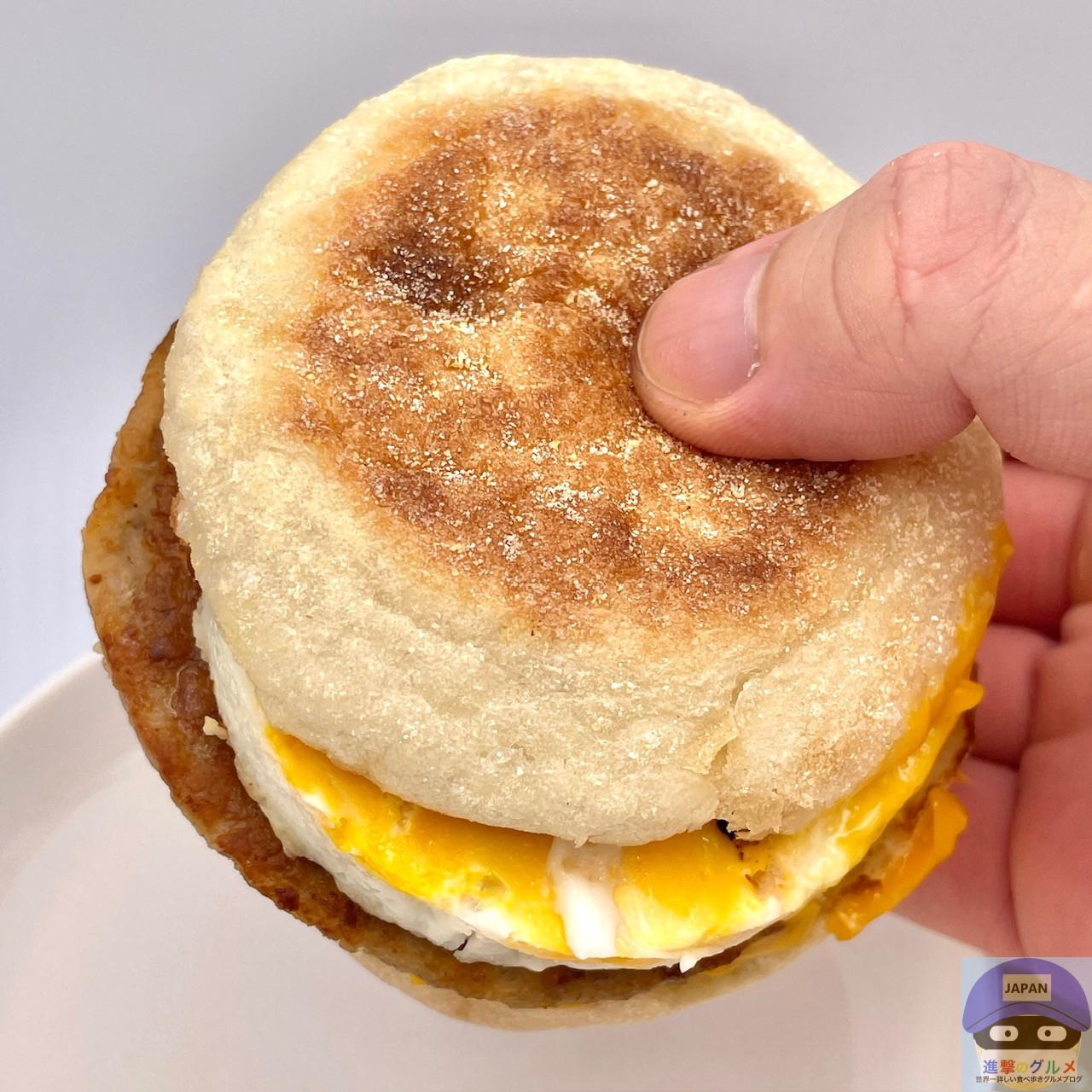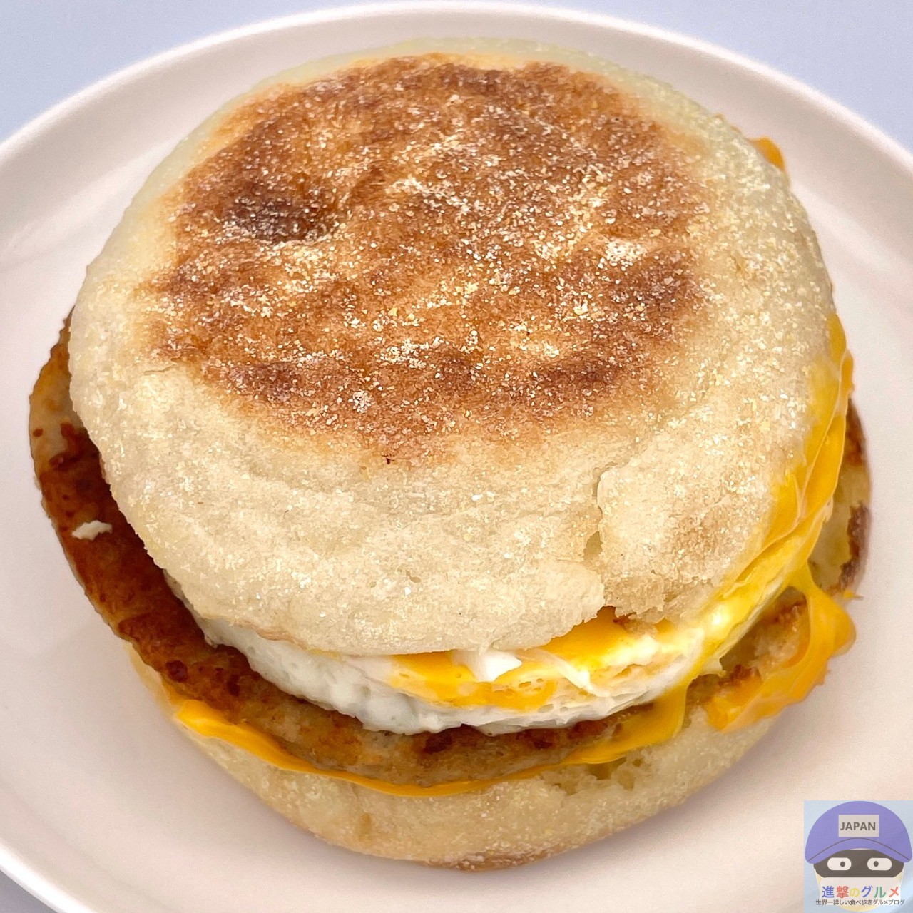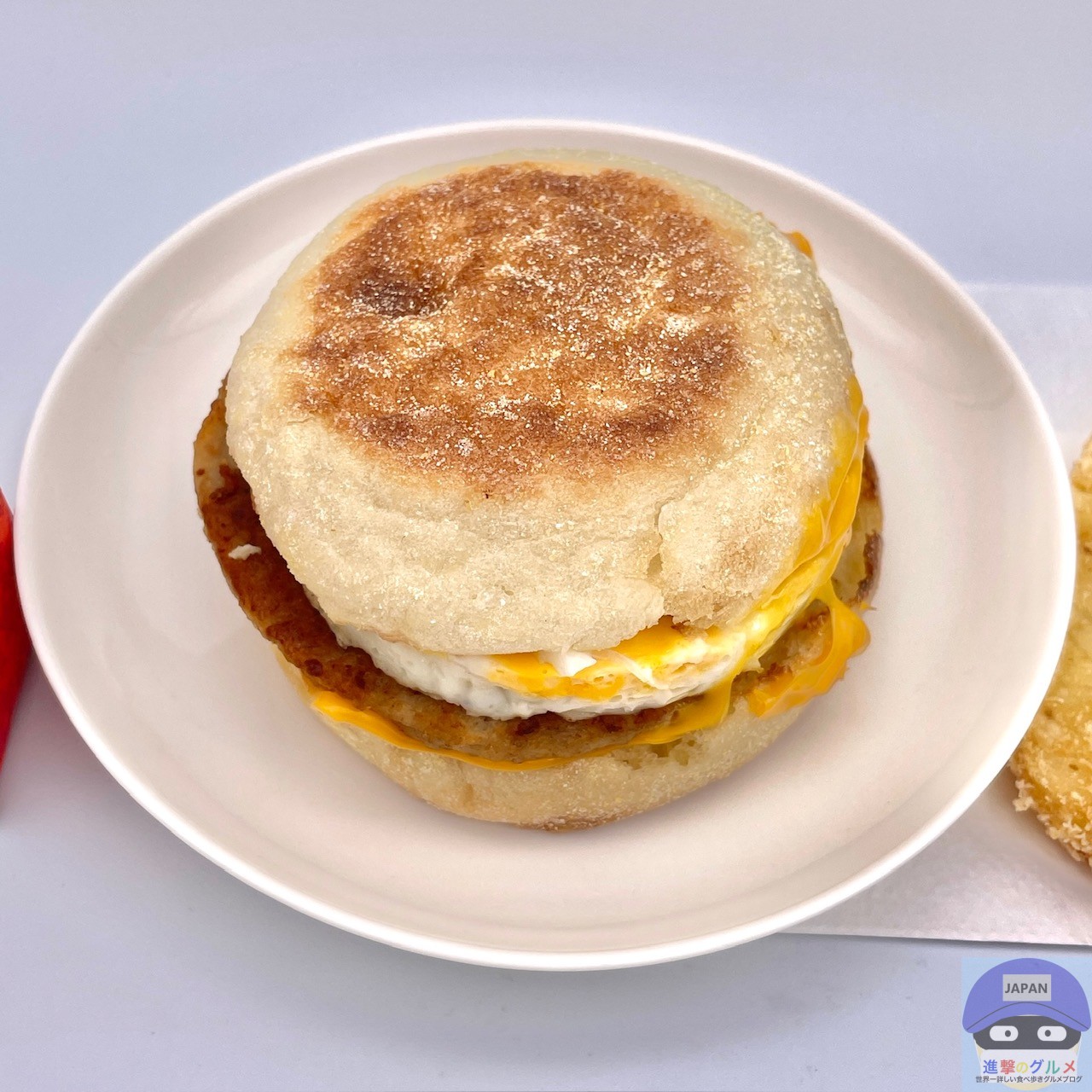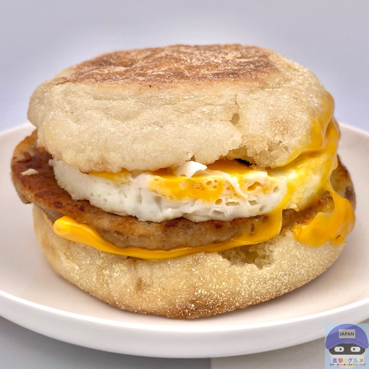 ソーセージパティ・たまご・チェダースライスチーズを、イングリッシュマフィンで挟んでいます。