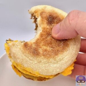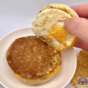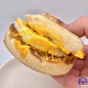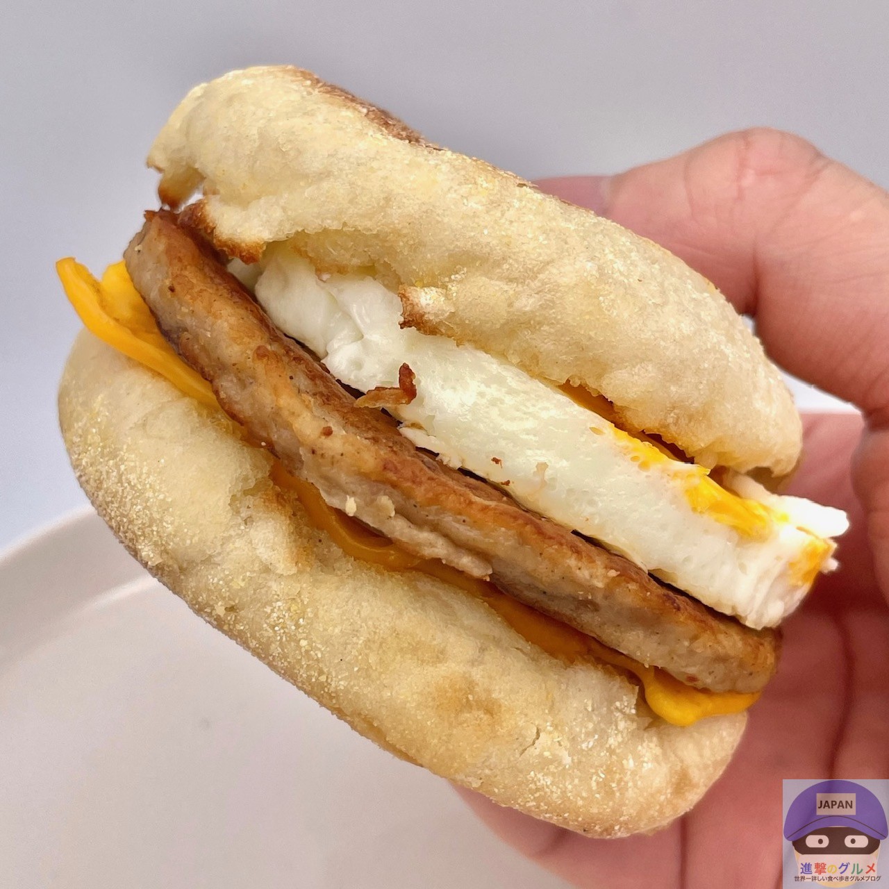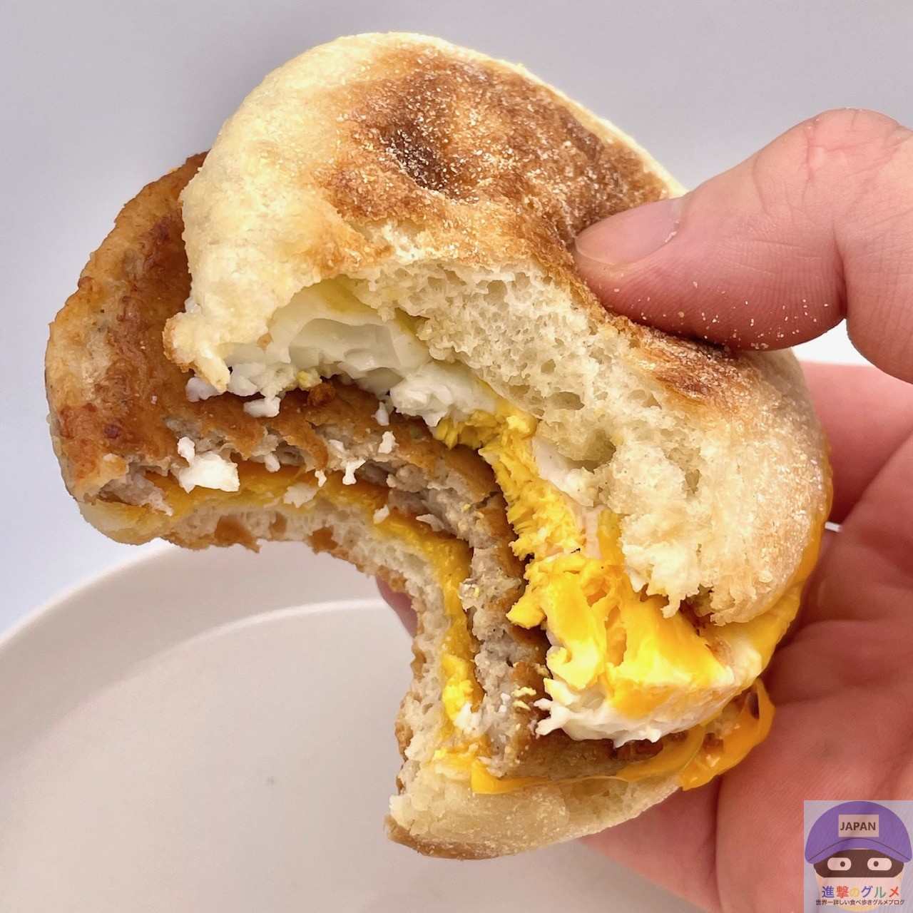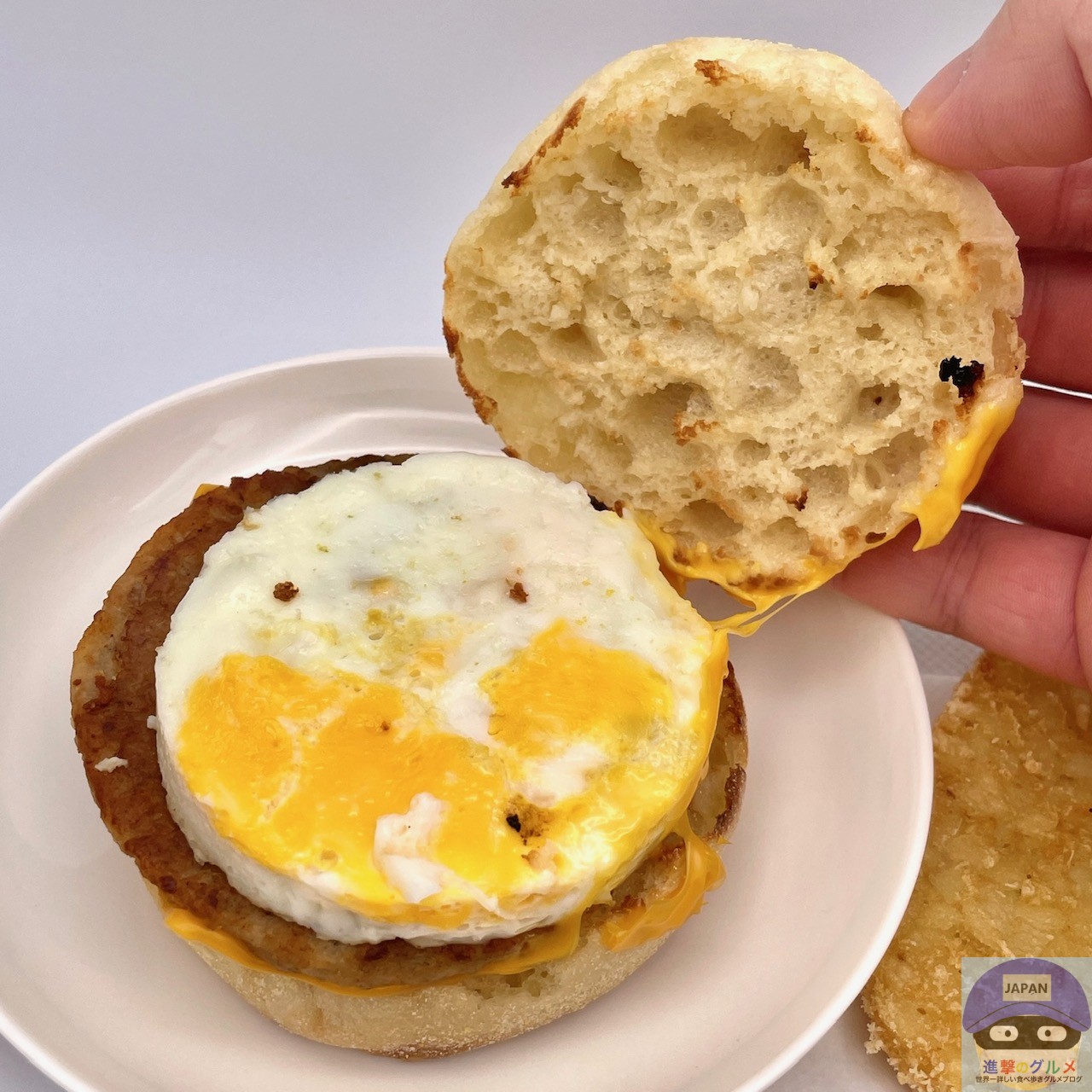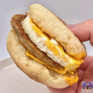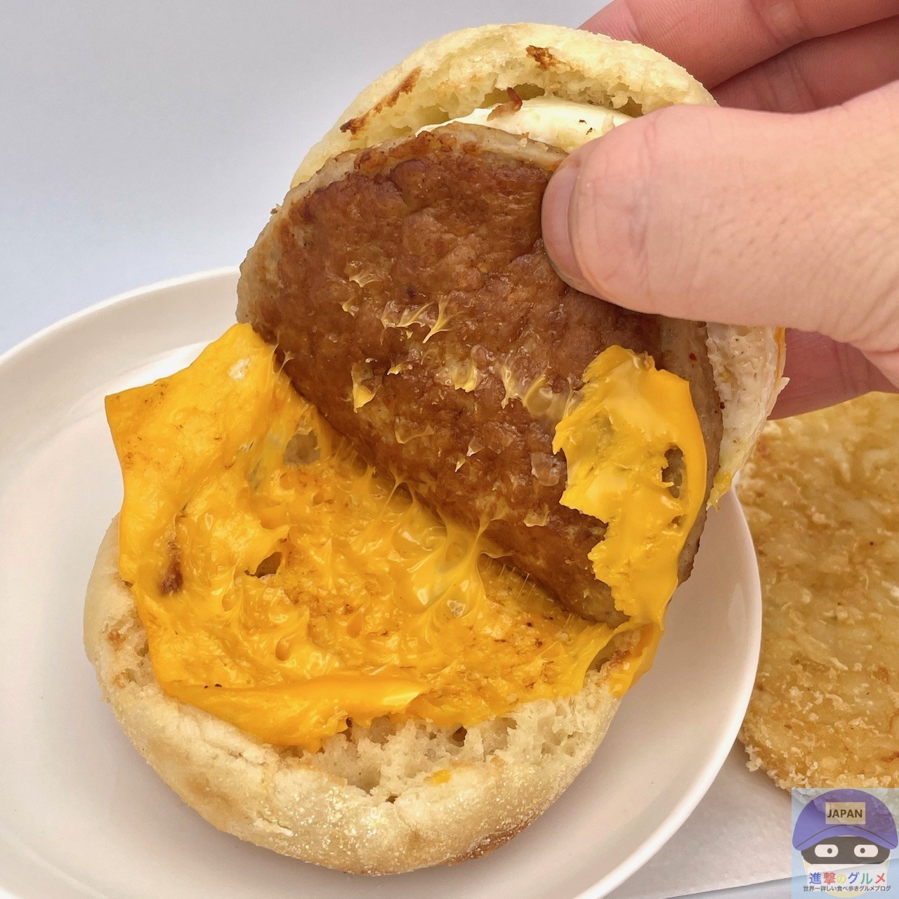 ソーセージパティ・たまご・チェダースライスチーズを、イングリッシュマフィンで挟んでいます。