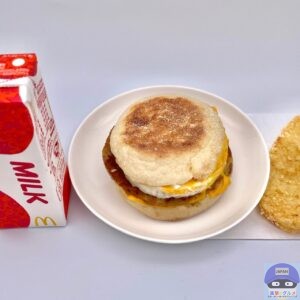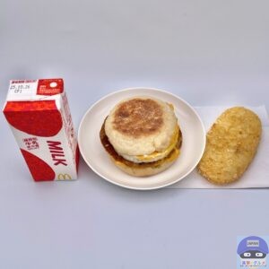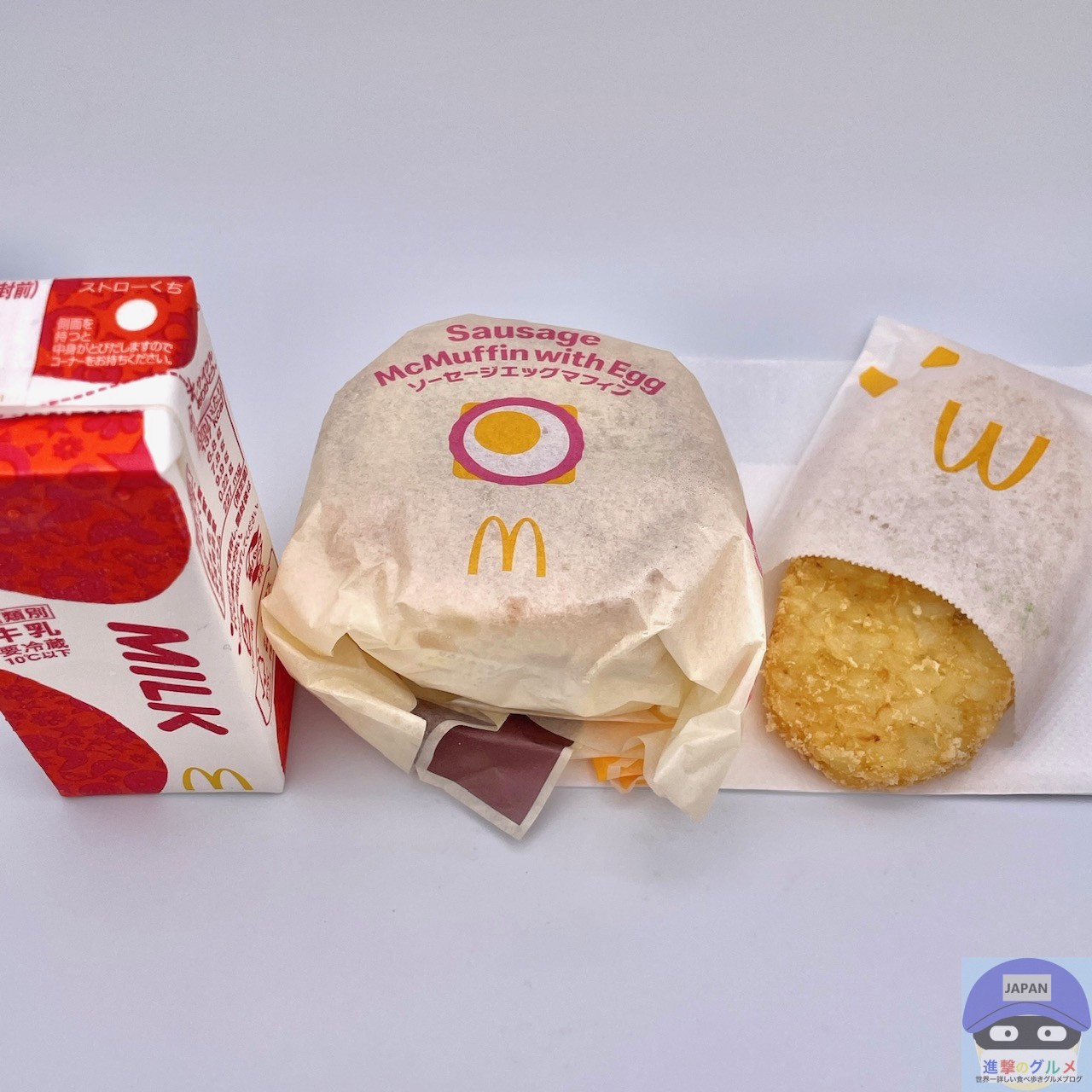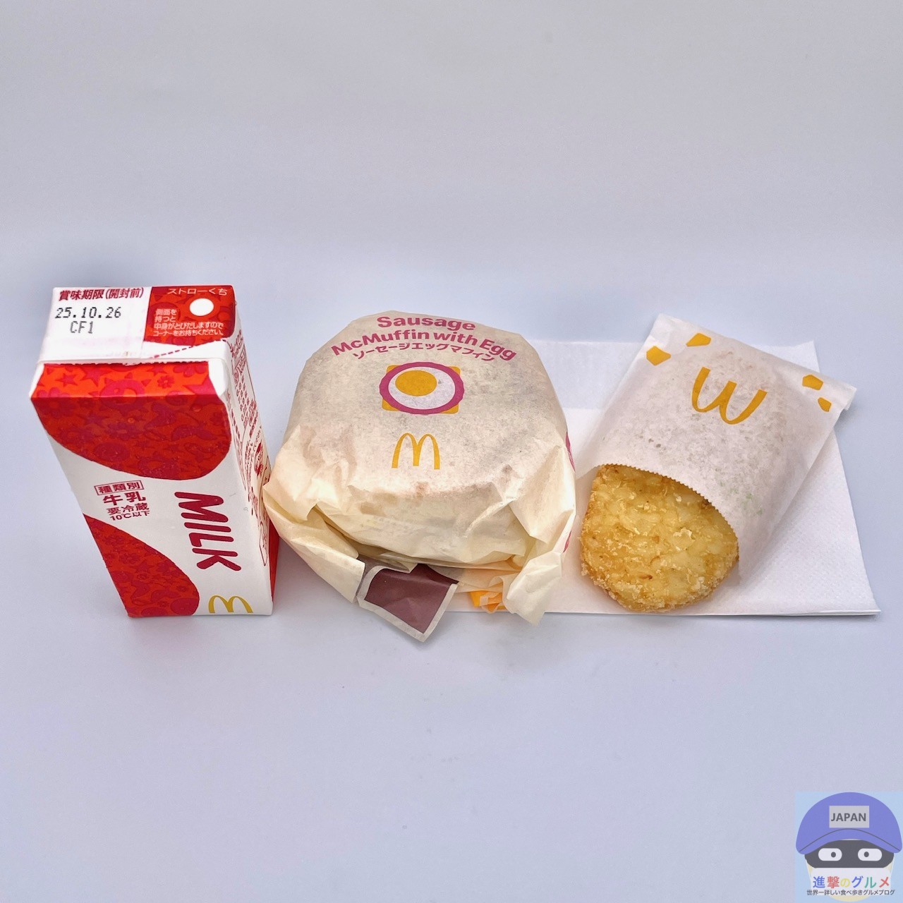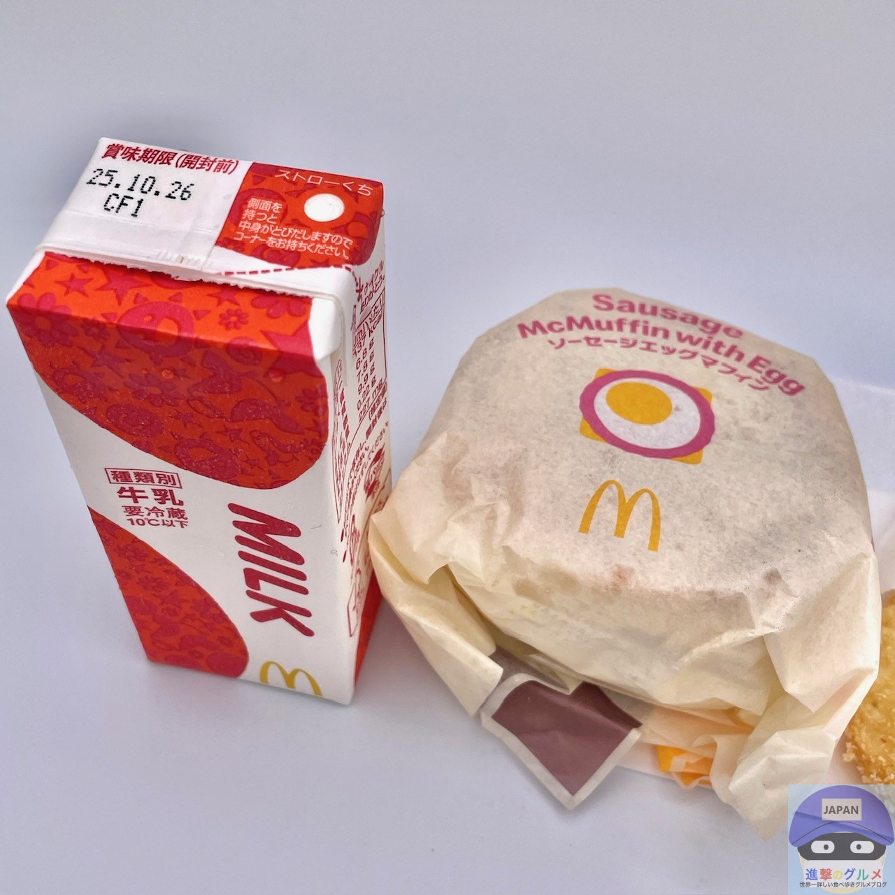 ソーセージエッグマフィン、ハッシュポテト、ミルクです。