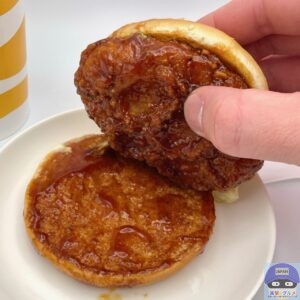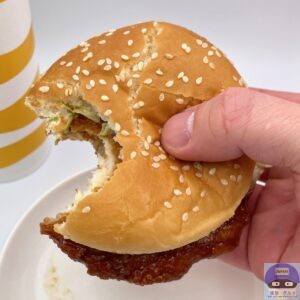 さっくり食感のチキンパティがしっとり柔らかい肉質で食べごたえがあり、辛味のないスパイスが効いて味付けされています。