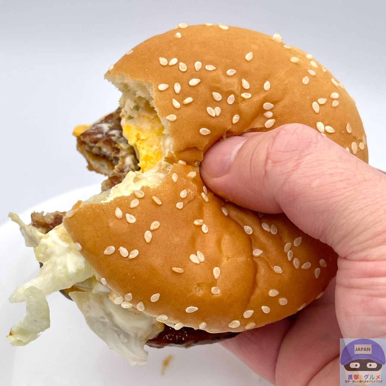 てりやきポークパティ・てりやきソース・たまご・チェダースライスチーズ・レタス・スイートレモンソースを、ゴマ付きバンズで挟んでいます。