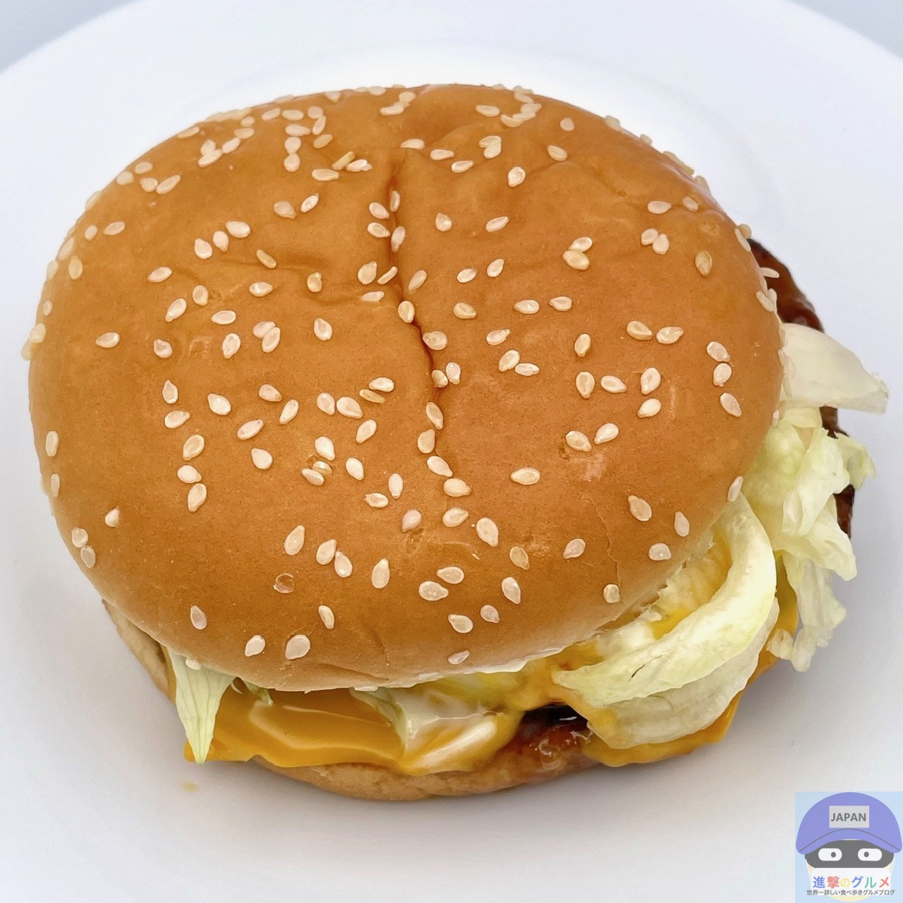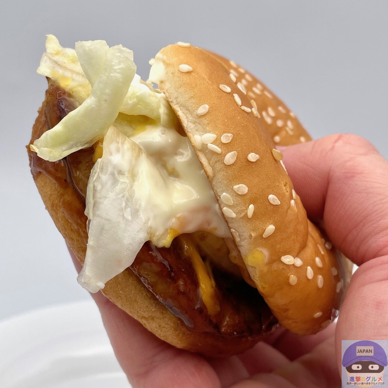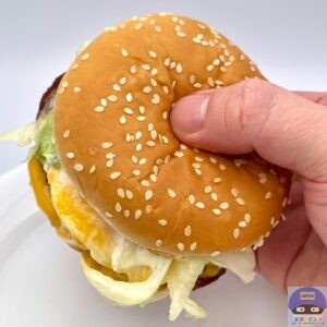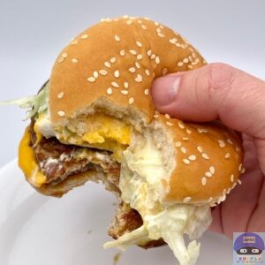 たっぷりのソースにより全体的にジューシー、ゴマ付きバンズと一体感があります。