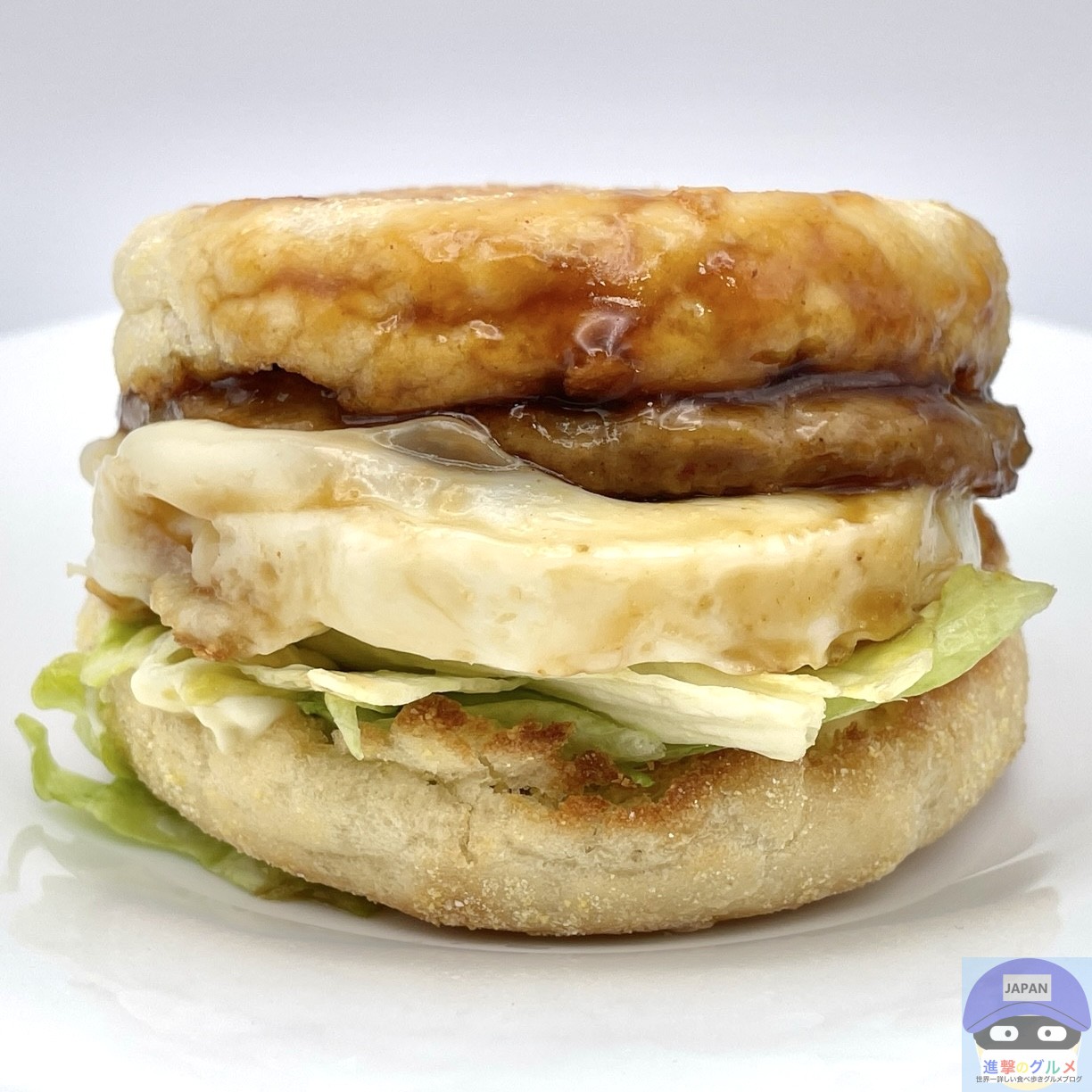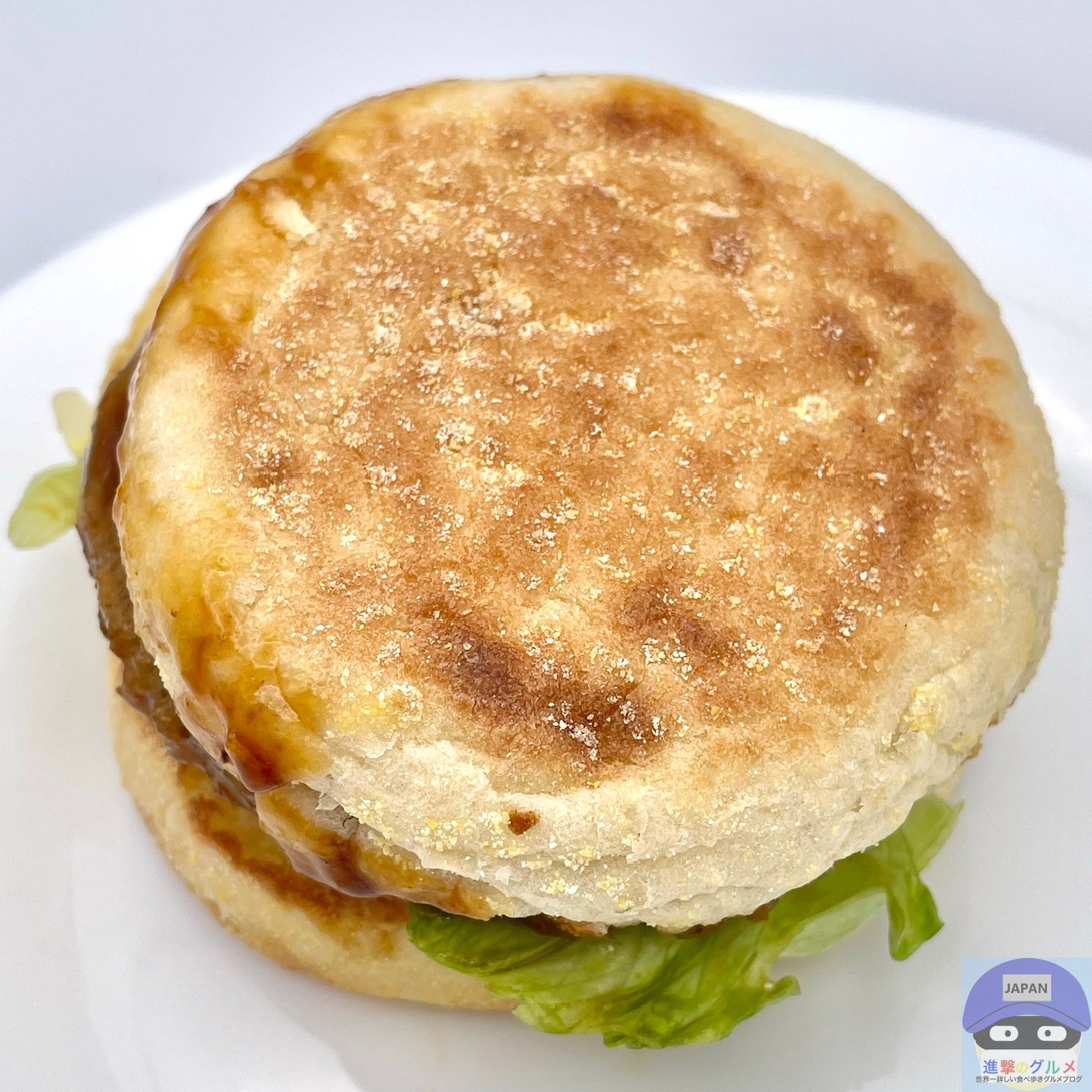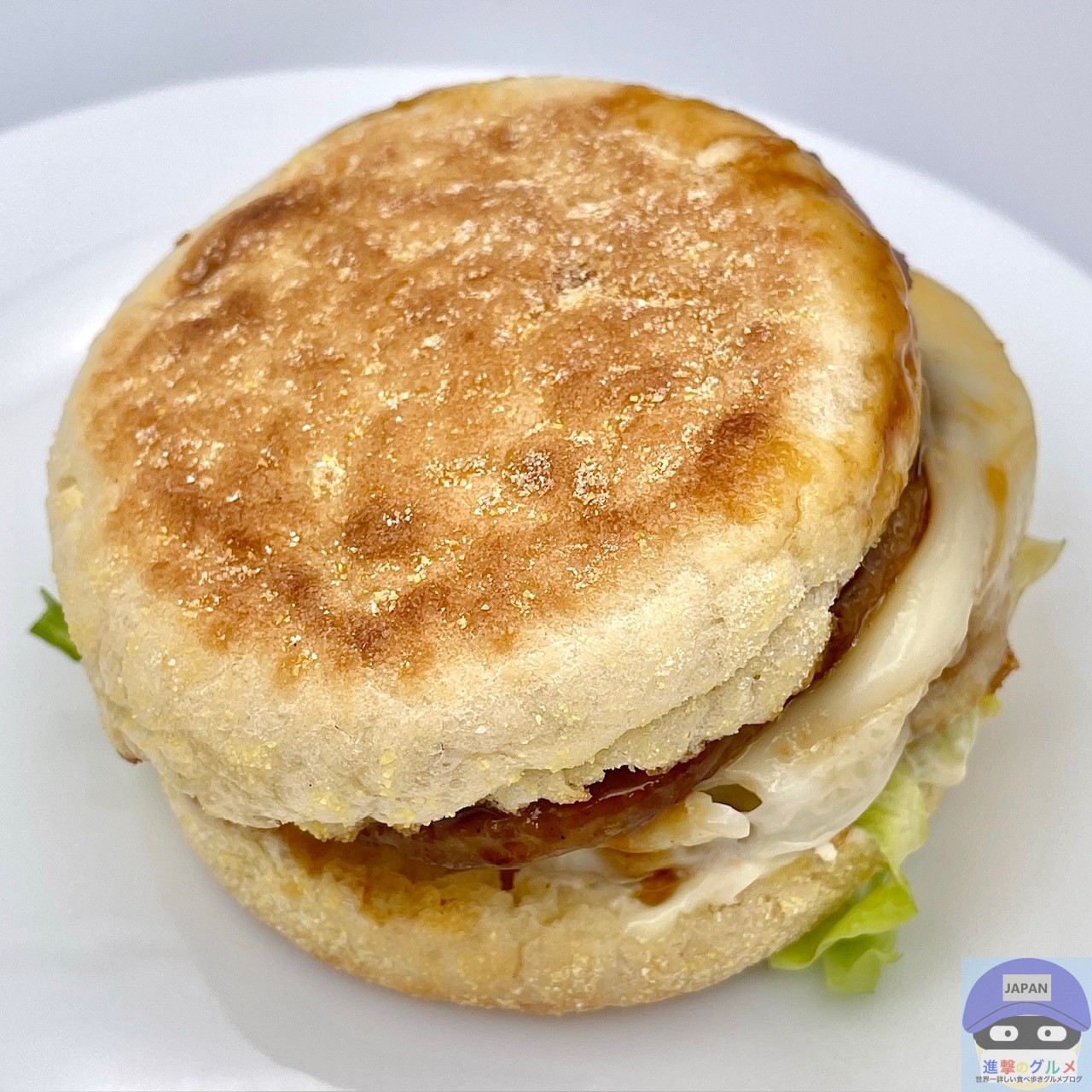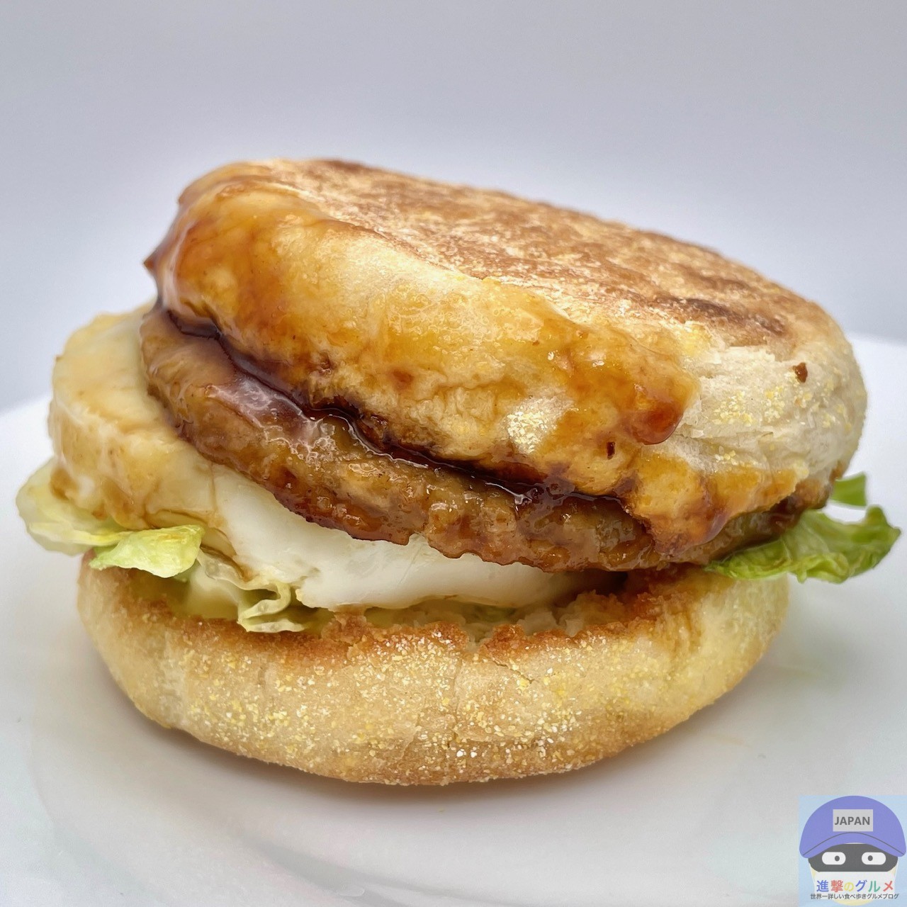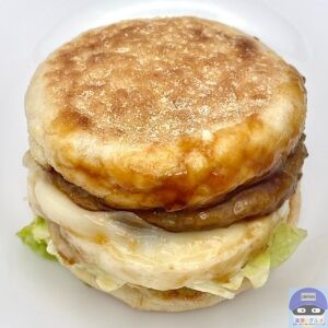ソーセージパティ・てりやきソース・たまご・レタス・スイートレモンソースをイングリッシュマフィンで挟んでいます。