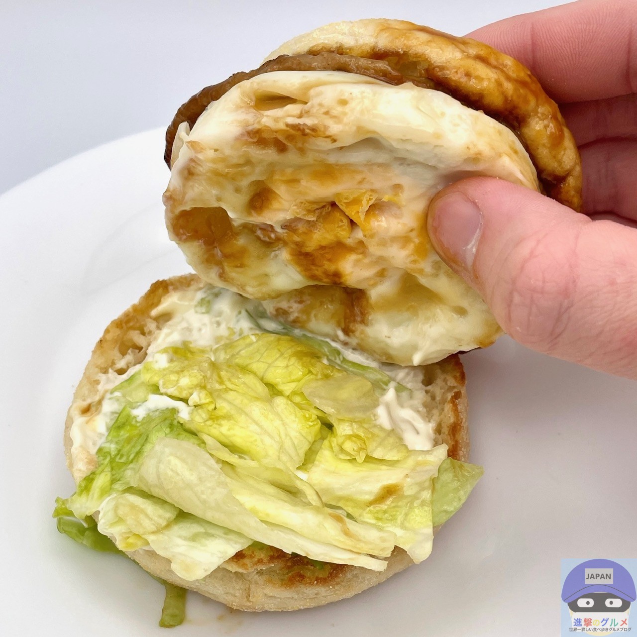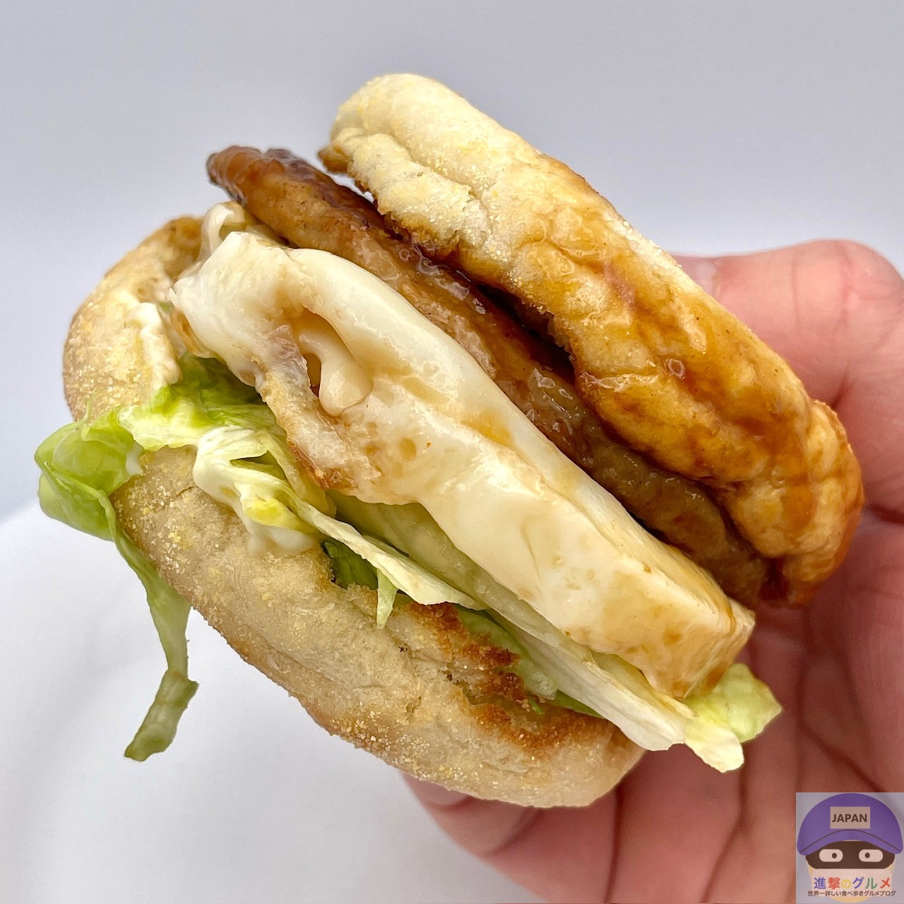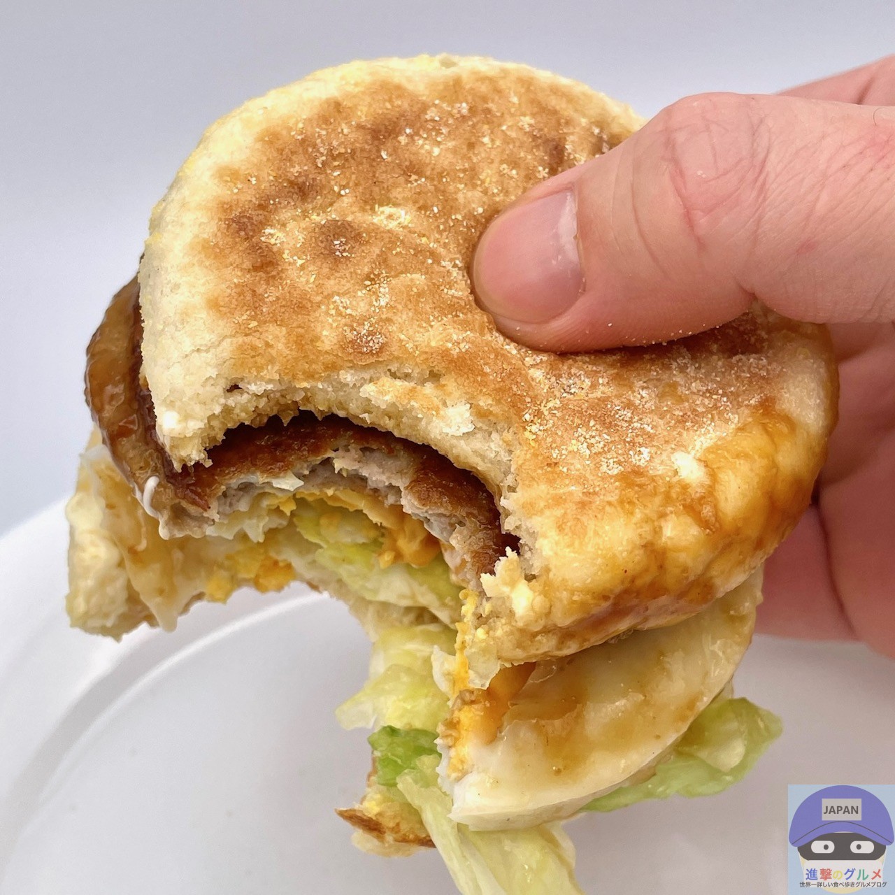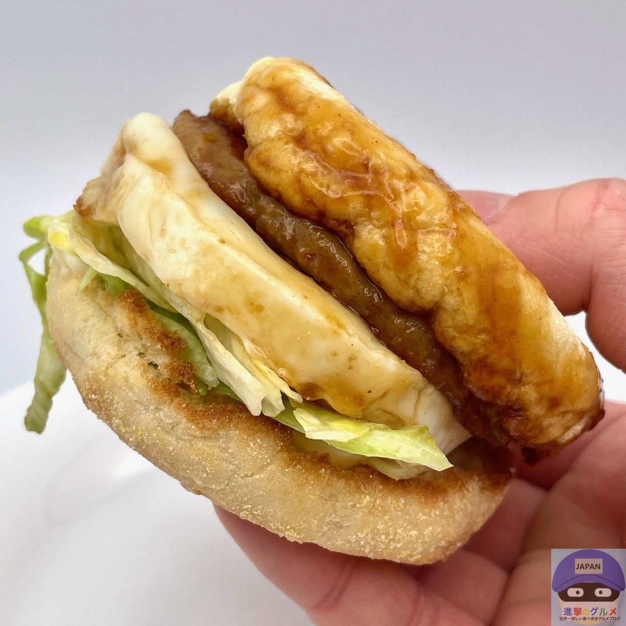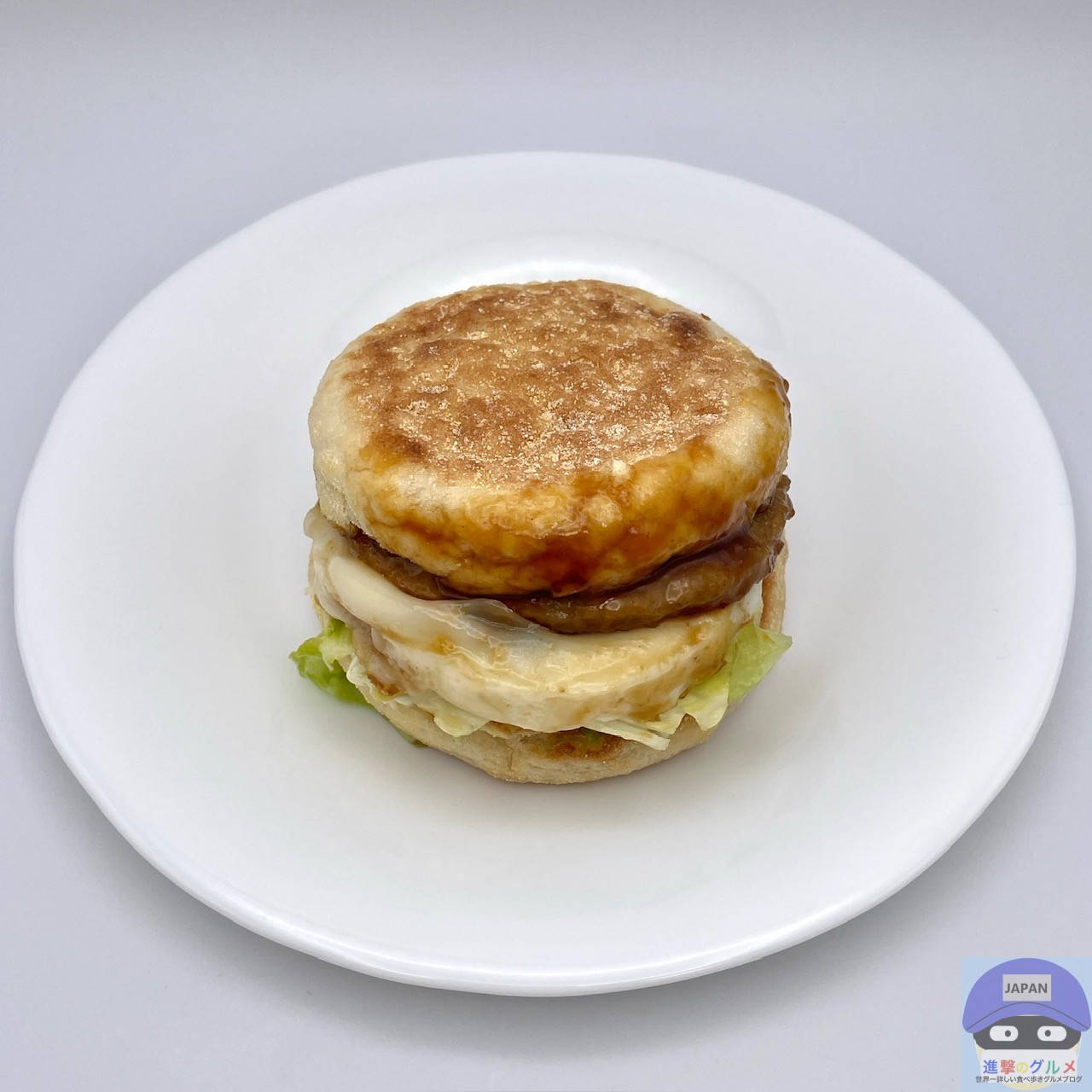 ソーセージパティ・てりやきソース・たまご・レタス・スイートレモンソースをイングリッシュマフィンで挟んでいます。
