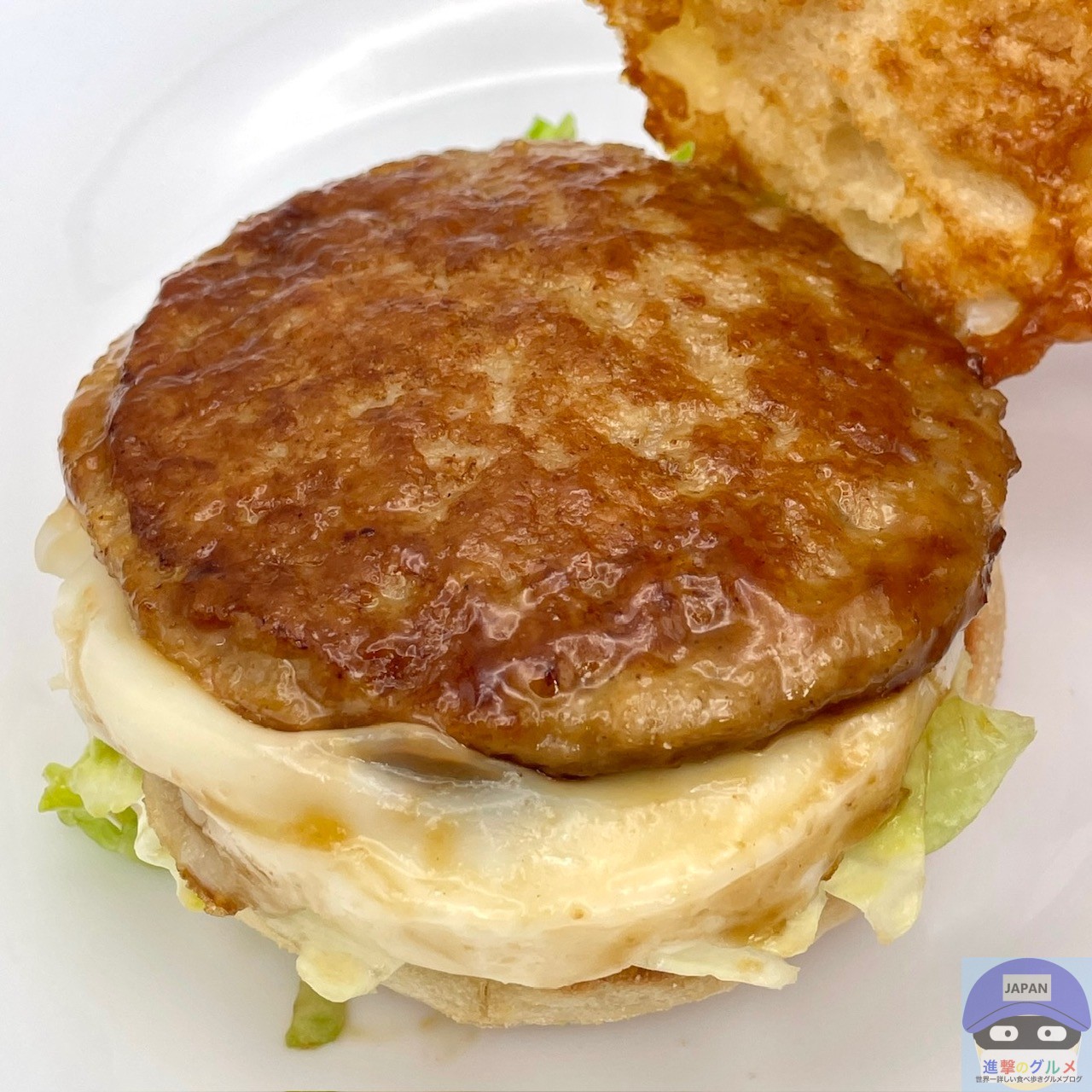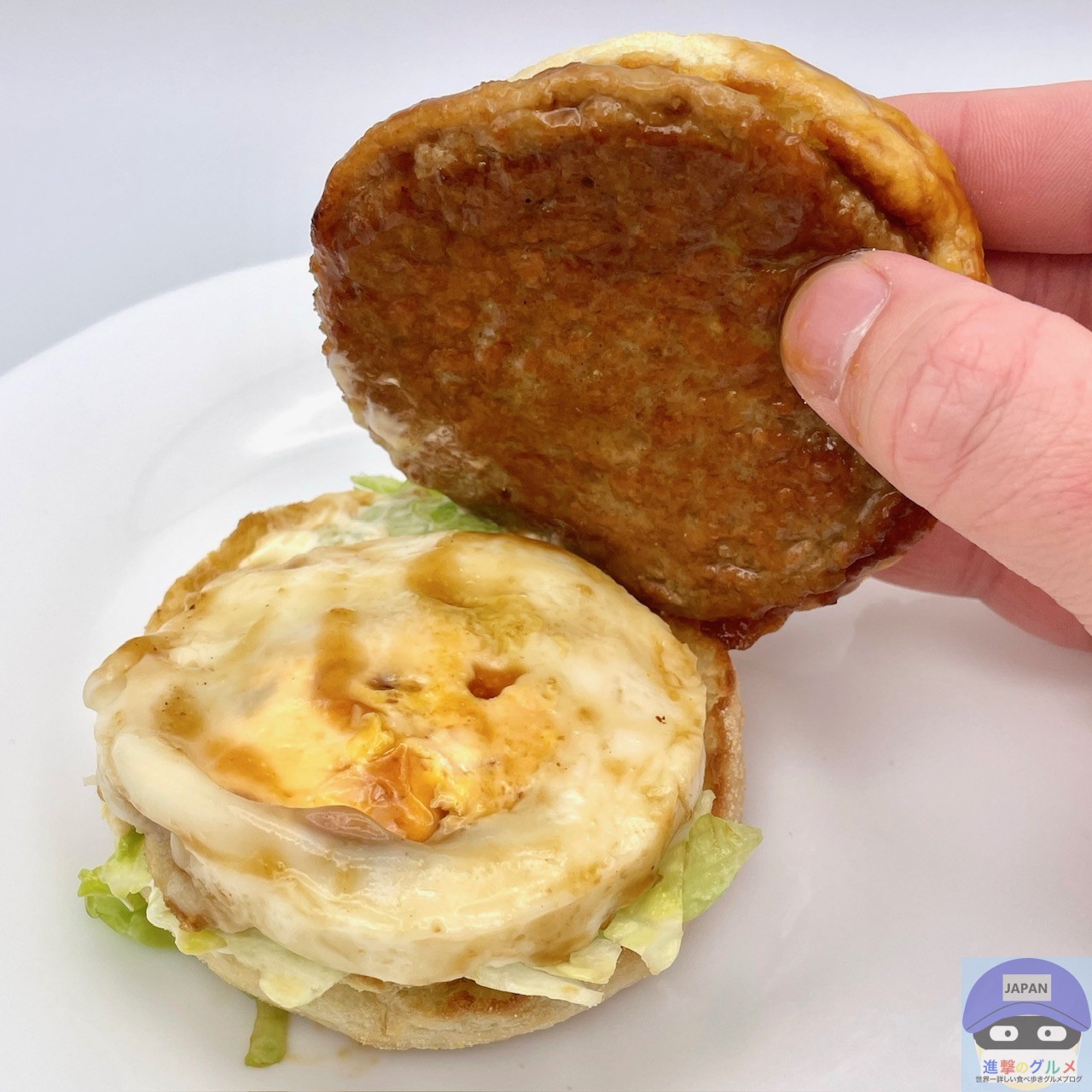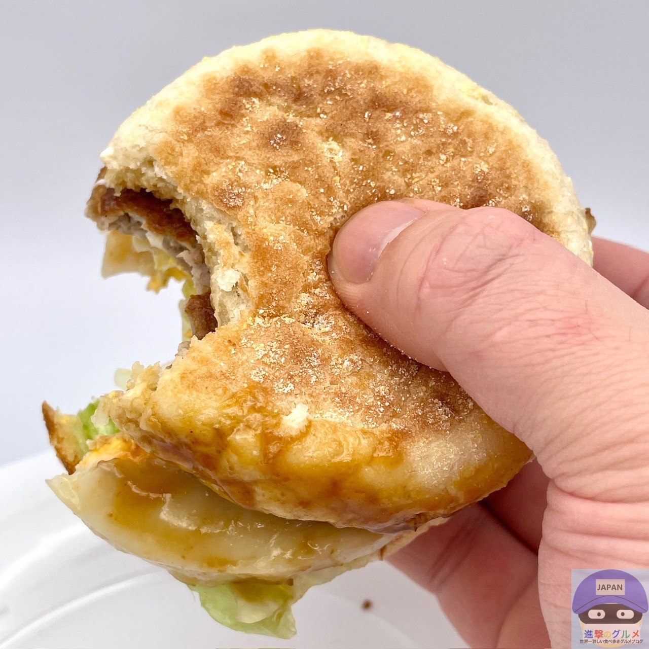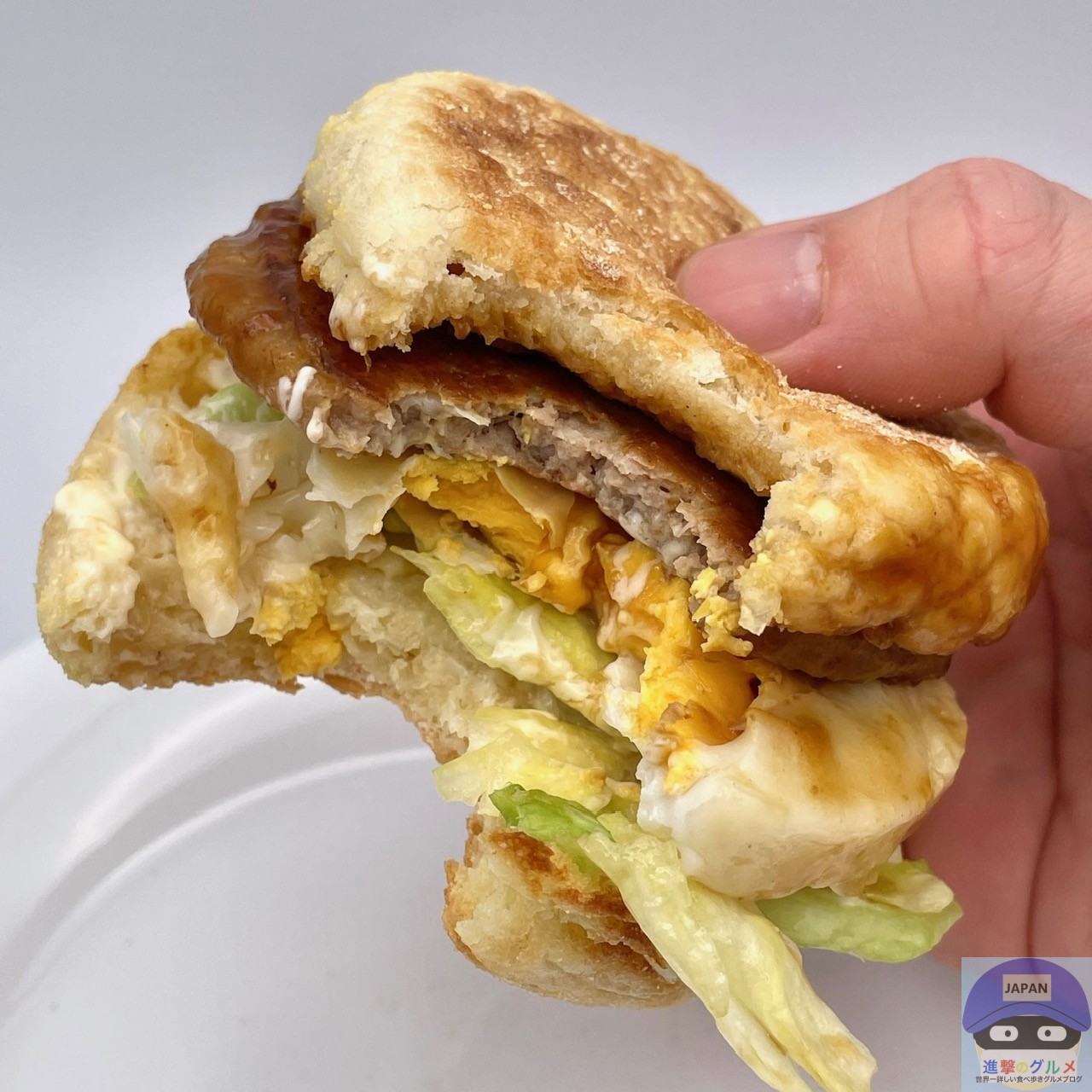 ソーセージパティ・てりやきソース・たまご・レタス・スイートレモンソースをイングリッシュマフィンで挟んでいます。