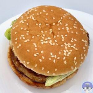 てりやきポークパティ・てりやきソース・たまご・レタス・甘辛カルビフィリングを、ゴマ付きバンズで挟んでいます。