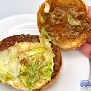 甘辛カルビフィリングは、少量の牛肉の旨みと甘じょっぱい味付けを少し感じ、甘いてりやきソースと似た系統のため、味や食感へのアクセントは弱いです。