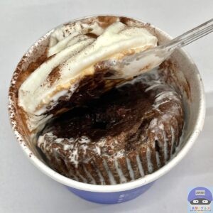 フォンダンショコラの熱さに注意し、ソフトクリームが溶けやすいため、すぐに食べましょう。