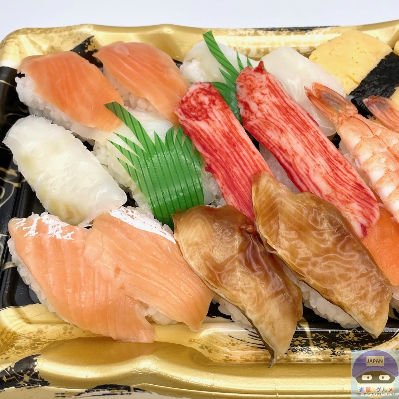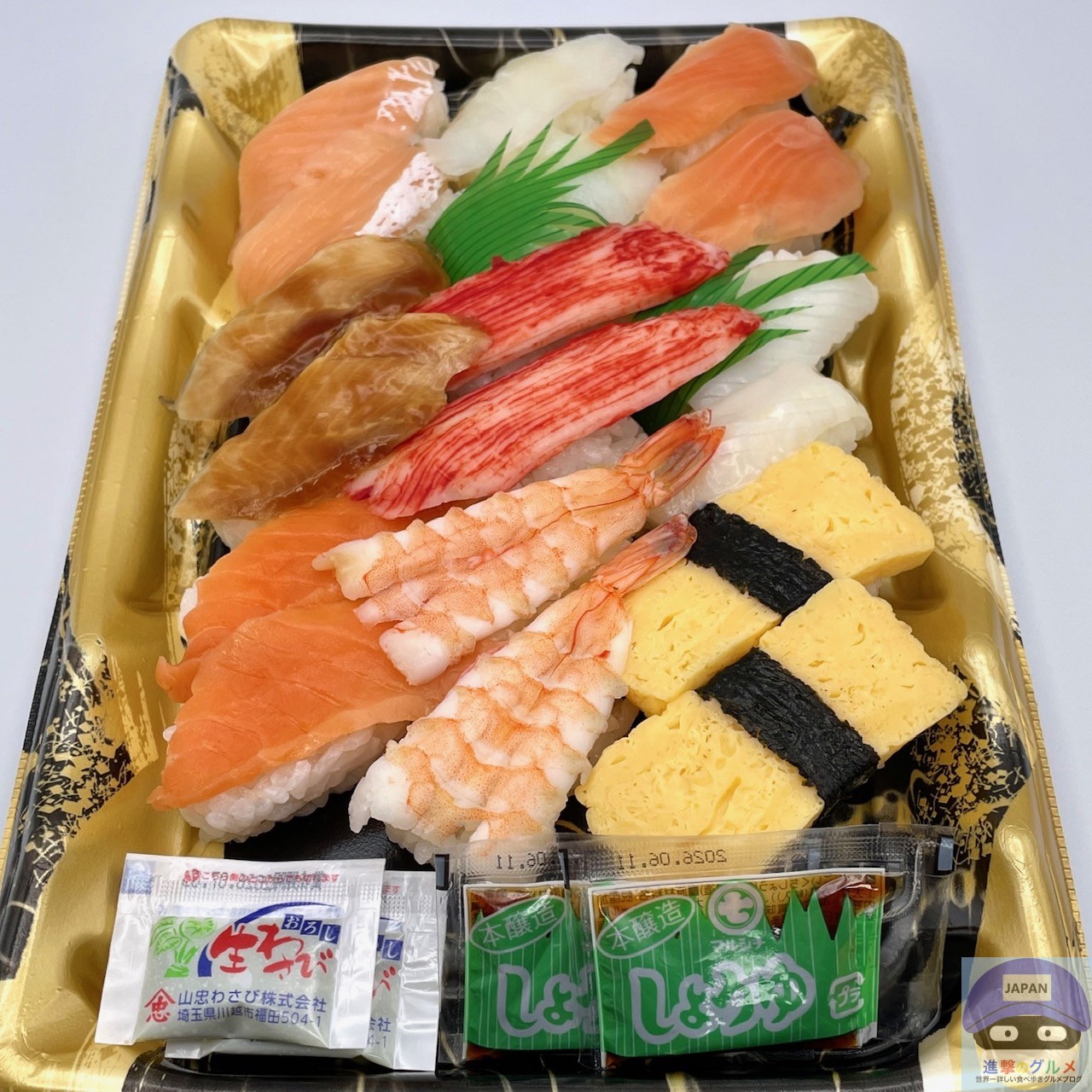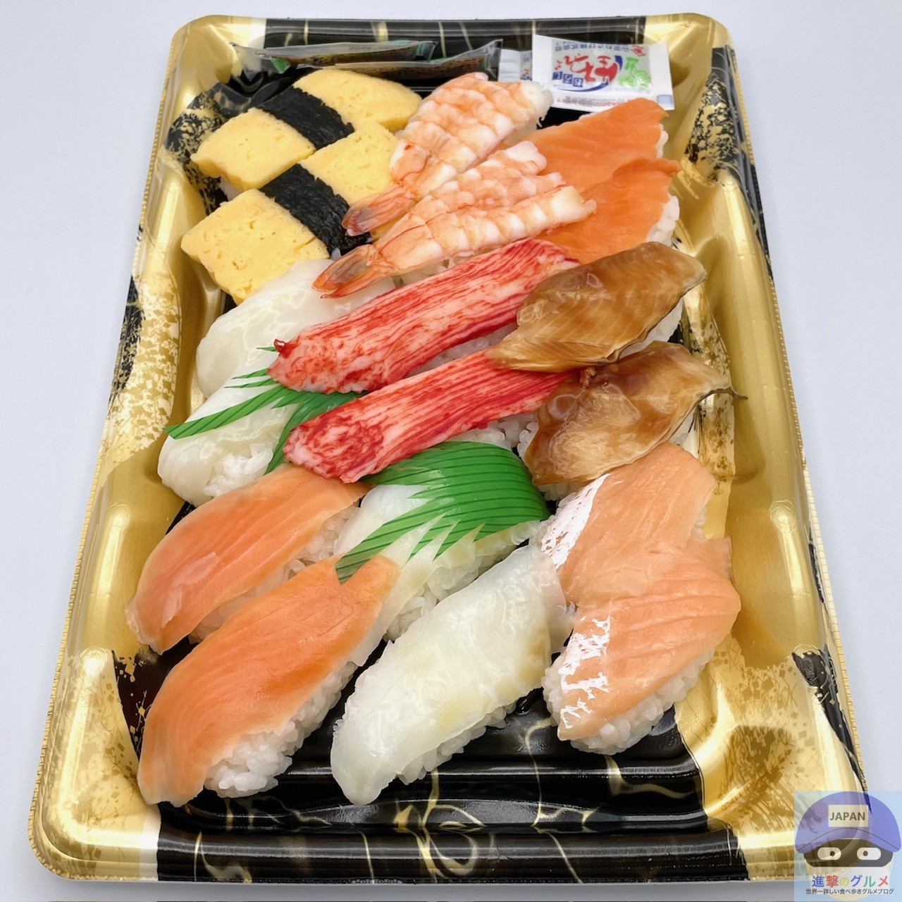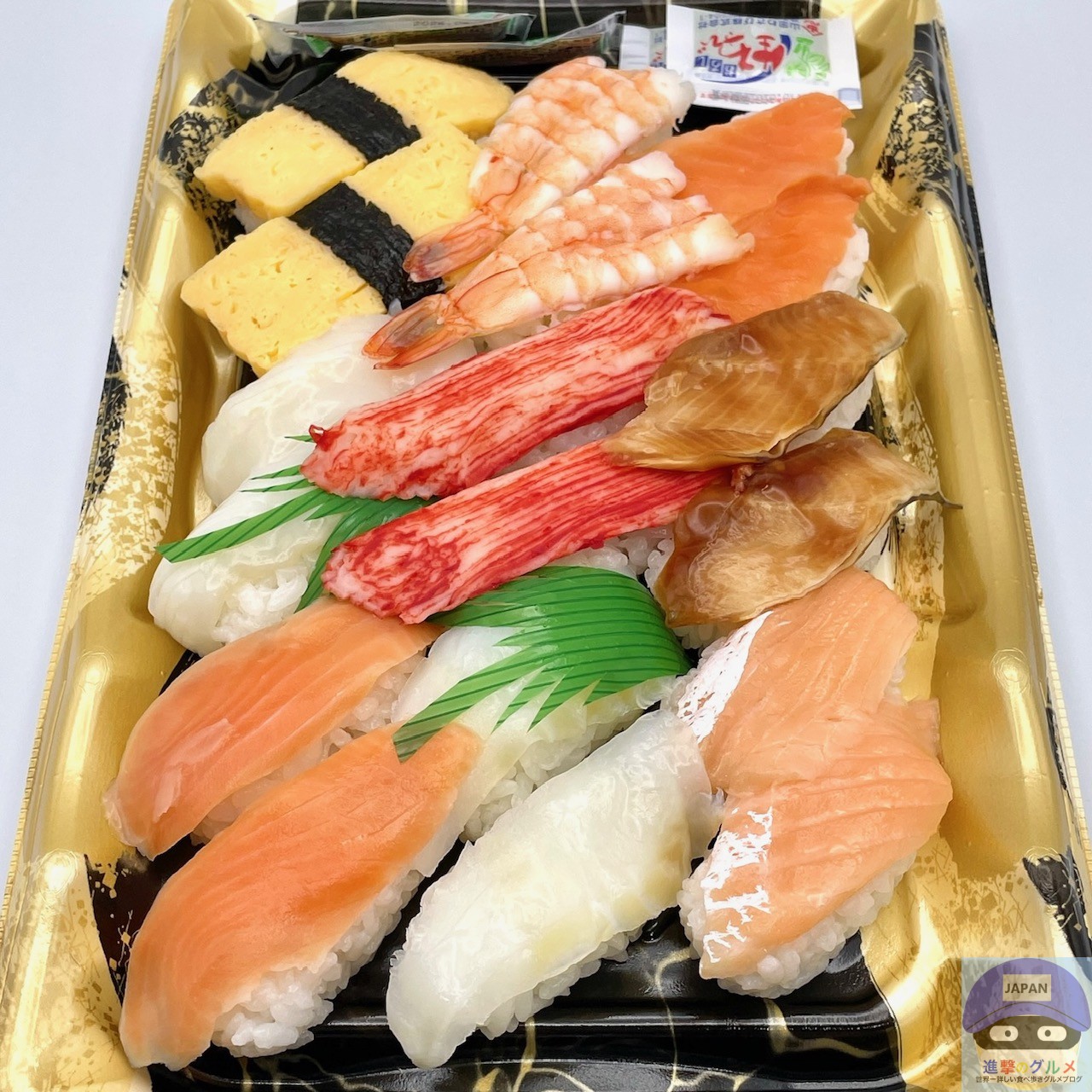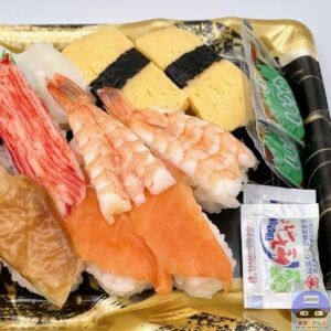 サーモン4貫、サーモンハラス2貫、えび2貫、いか2貫、玉子2貫、かに風味かまぼこ2貫、アブラカレイ2貫、煮穴子2貫、醤油小袋2袋、わさび小袋2袋の組み合わせです。