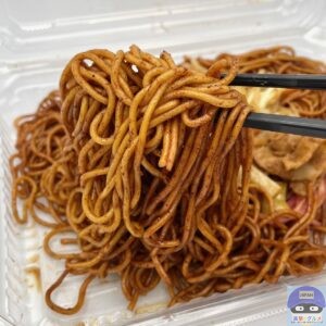 粉っぽいソースで味付けされた麺は、油のこってり感が比較的弱め、程よい塩気とスパイスの風味でピリ辛です。