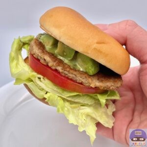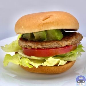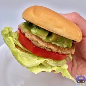 ハンバーガーパティ・アボカドダイス・オリジナルワカモレ風ソース・トマト・レタス・カロリーハーフマヨネーズタイプを、シンプルなバンズで挟んでいます。