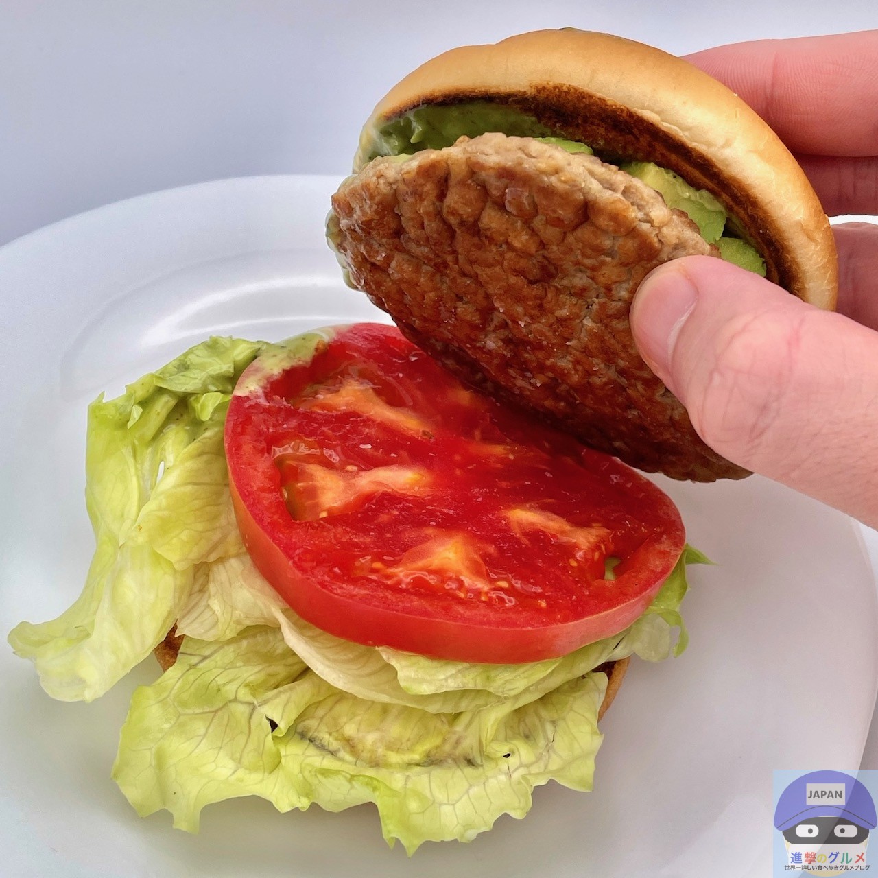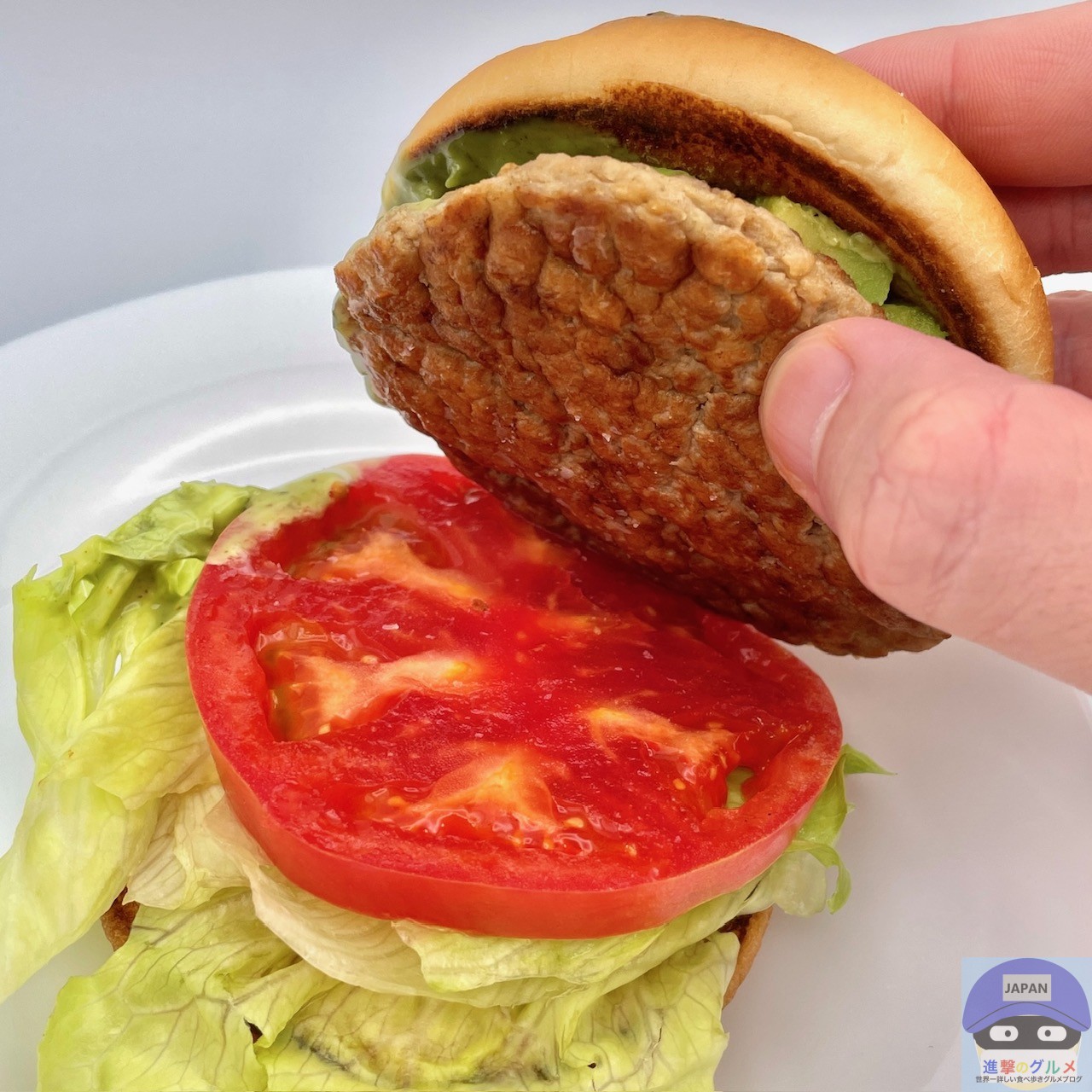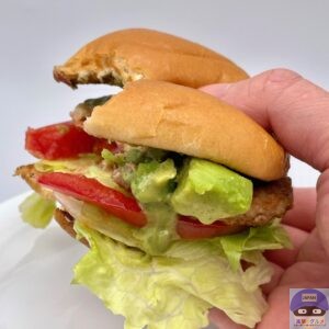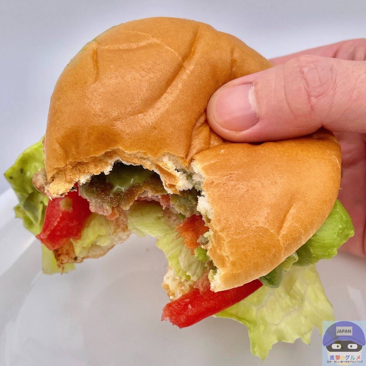 少しふんわりしたバンズで口どけは普通、やわらかいアボカドダイスの味わい、オリジナルワカモレ風ソースのドレッシングのような酸味を感じます。