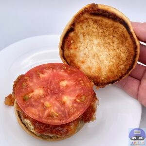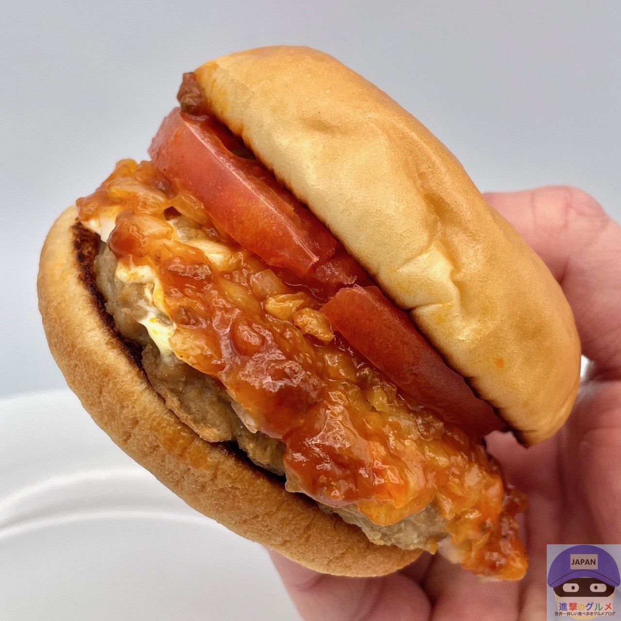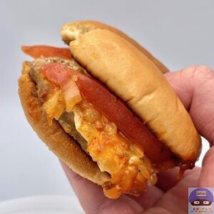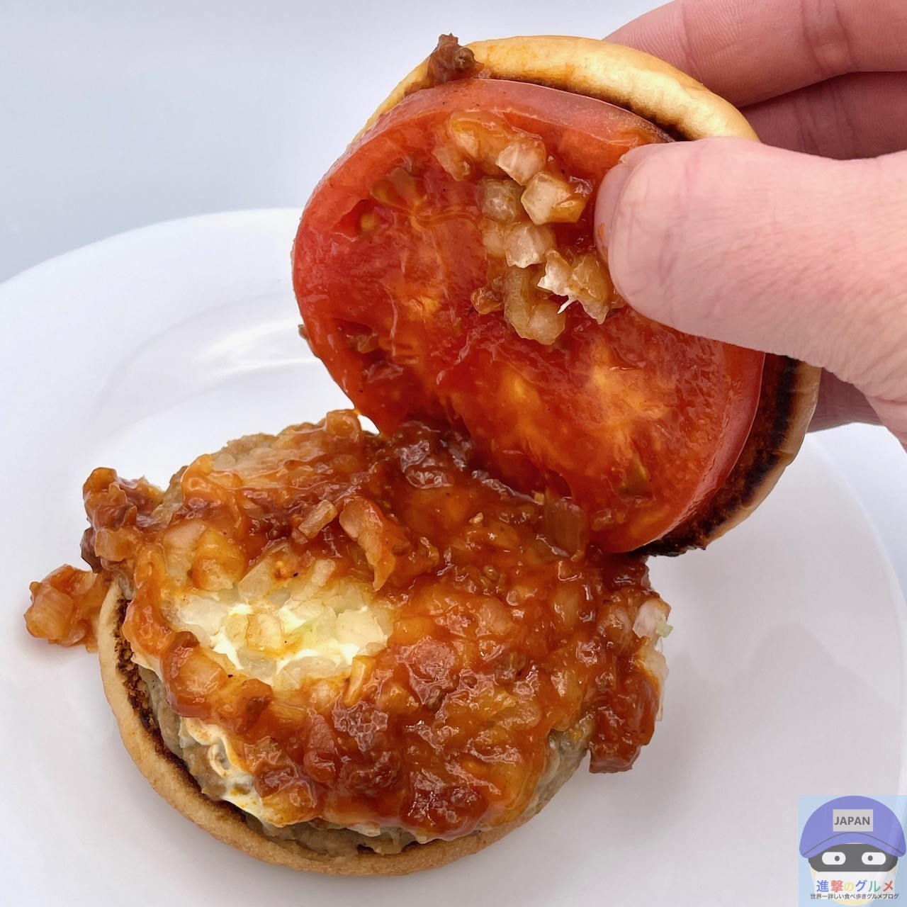 ハンバーガーパティ・トマト・オニオン・特製ミートソース・カロリーハーフマヨネーズタイプ・アメリカンマスタードを、シンプルなバンズで挟んでいます。