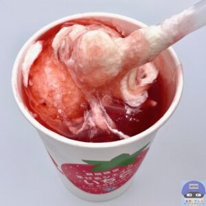 フタをはずすと、バニラシェイクに、栃木県産「とちあいか」を使用したいちごソースを合わせたシンプルな見た目です。