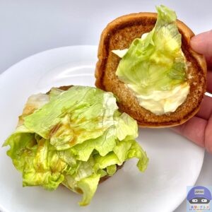 ハンバーガーパティ・テリヤキソース・レタス・カロリーハーフマヨネーズタイプを、シンプルなバンズで挟んでいます。