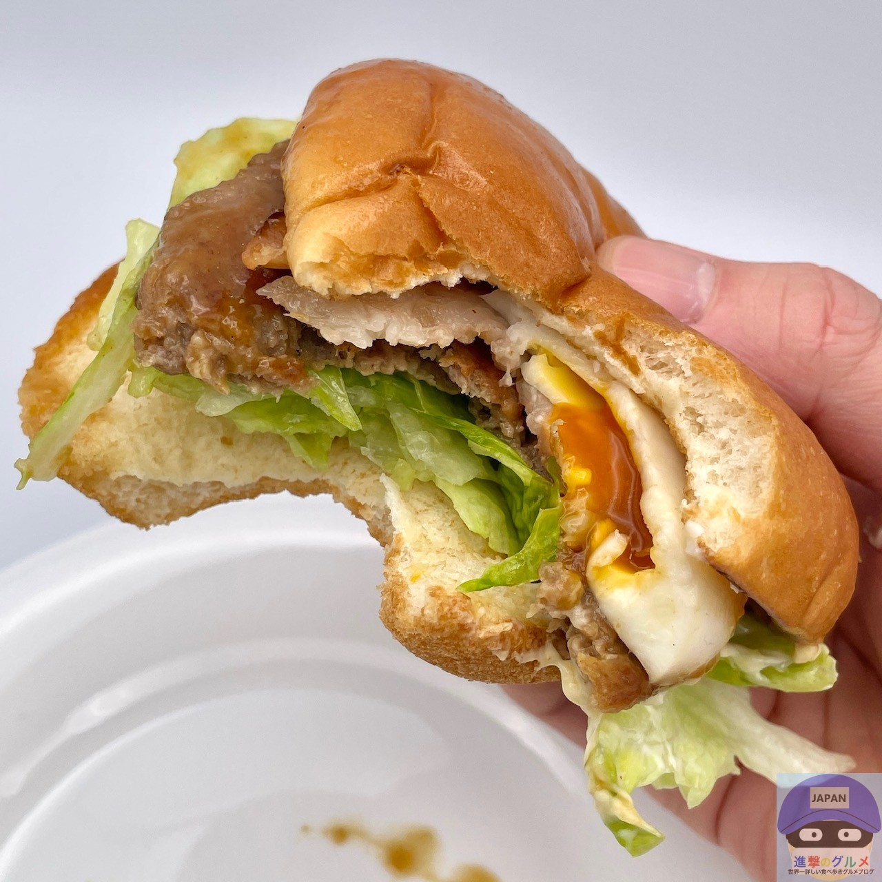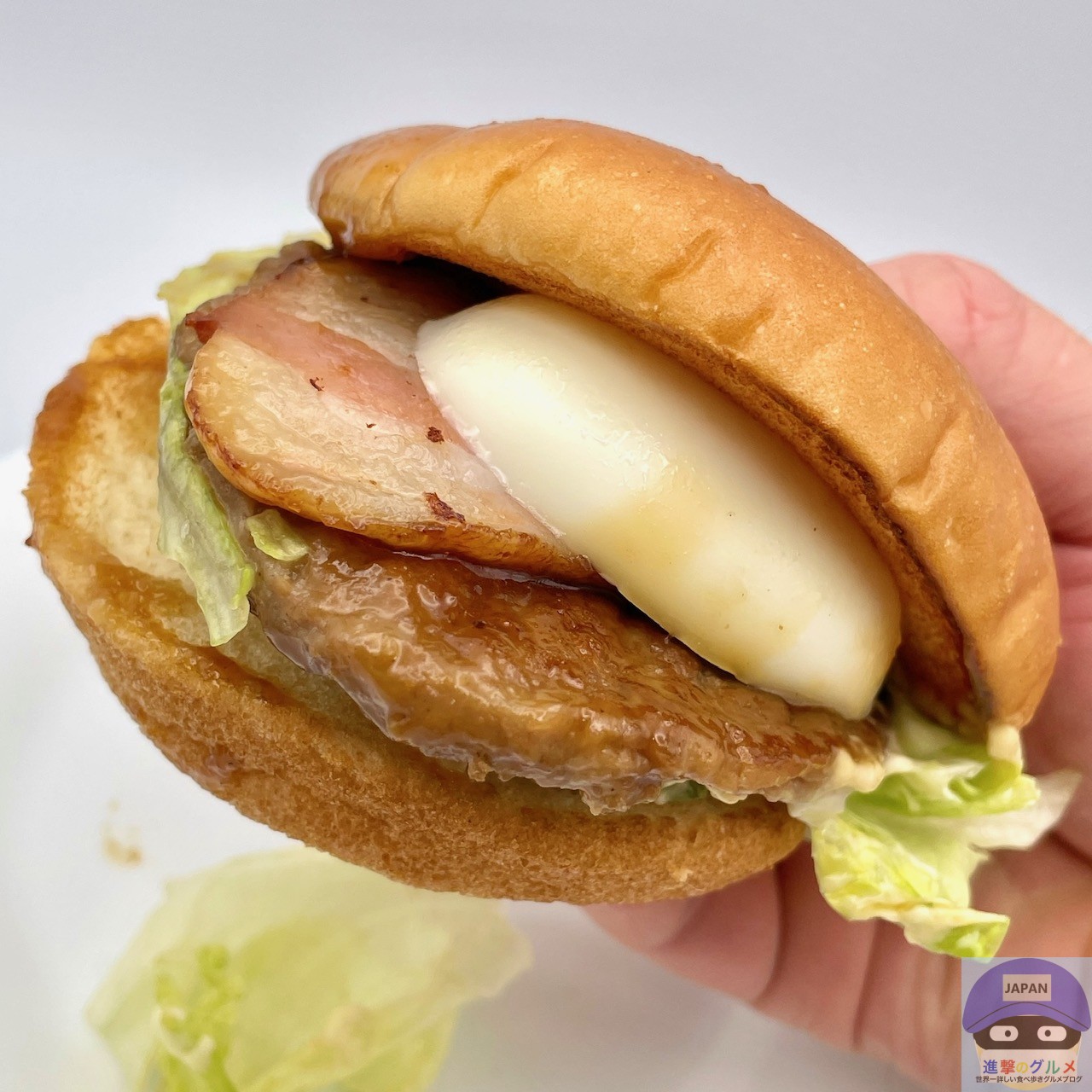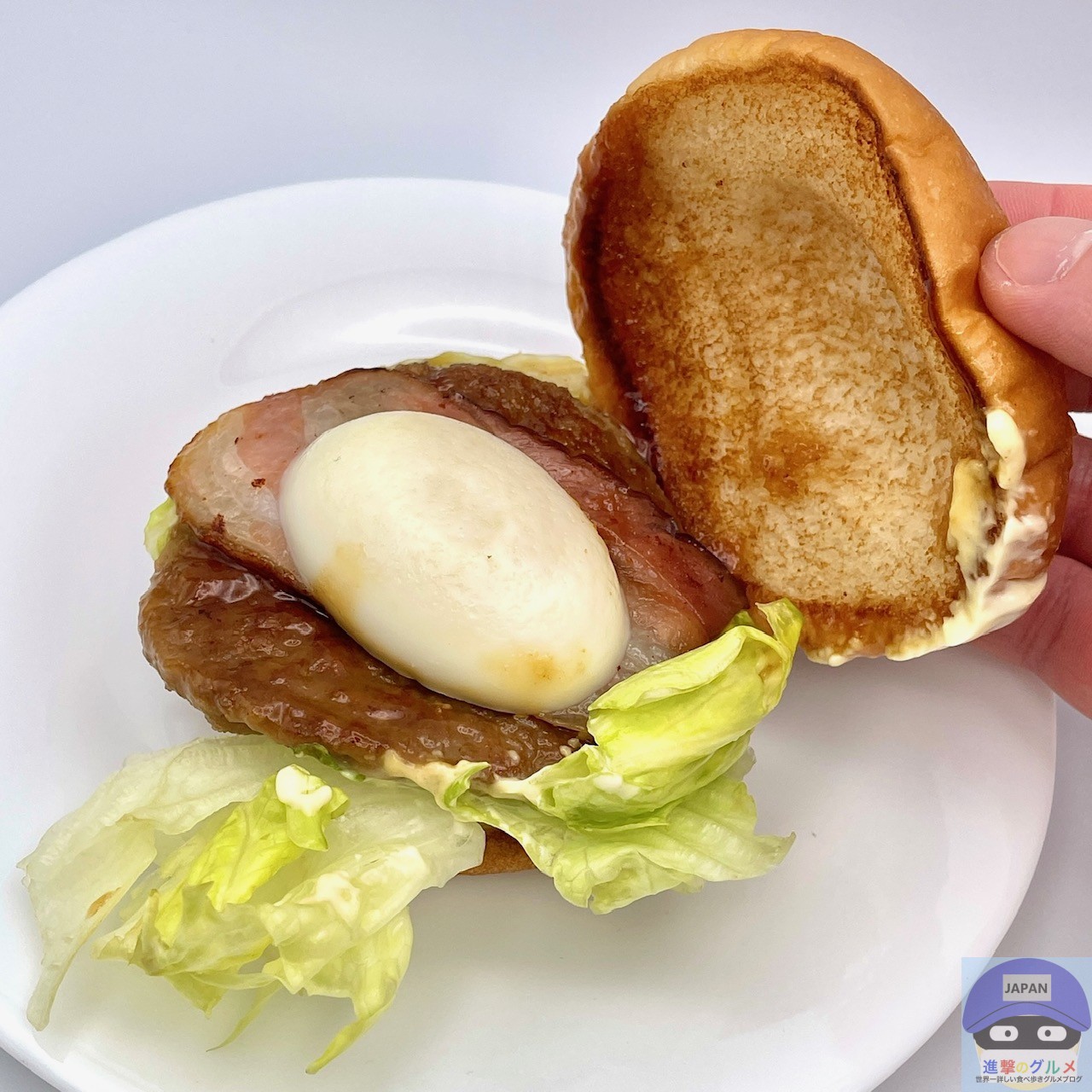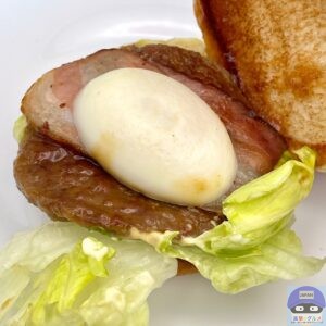 肉肉しいスライスベーコンが香ばしくて脂身の甘みも感じ、半熟風たまご(加工品)は中の卵黄風ソースがとろけ出します。