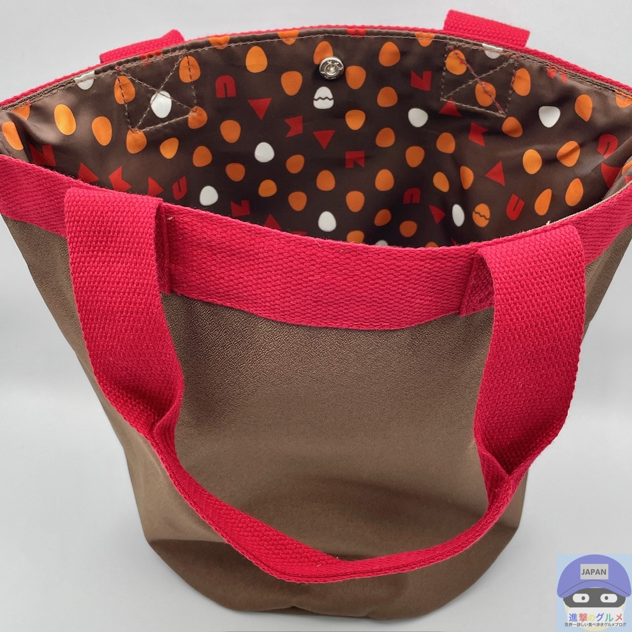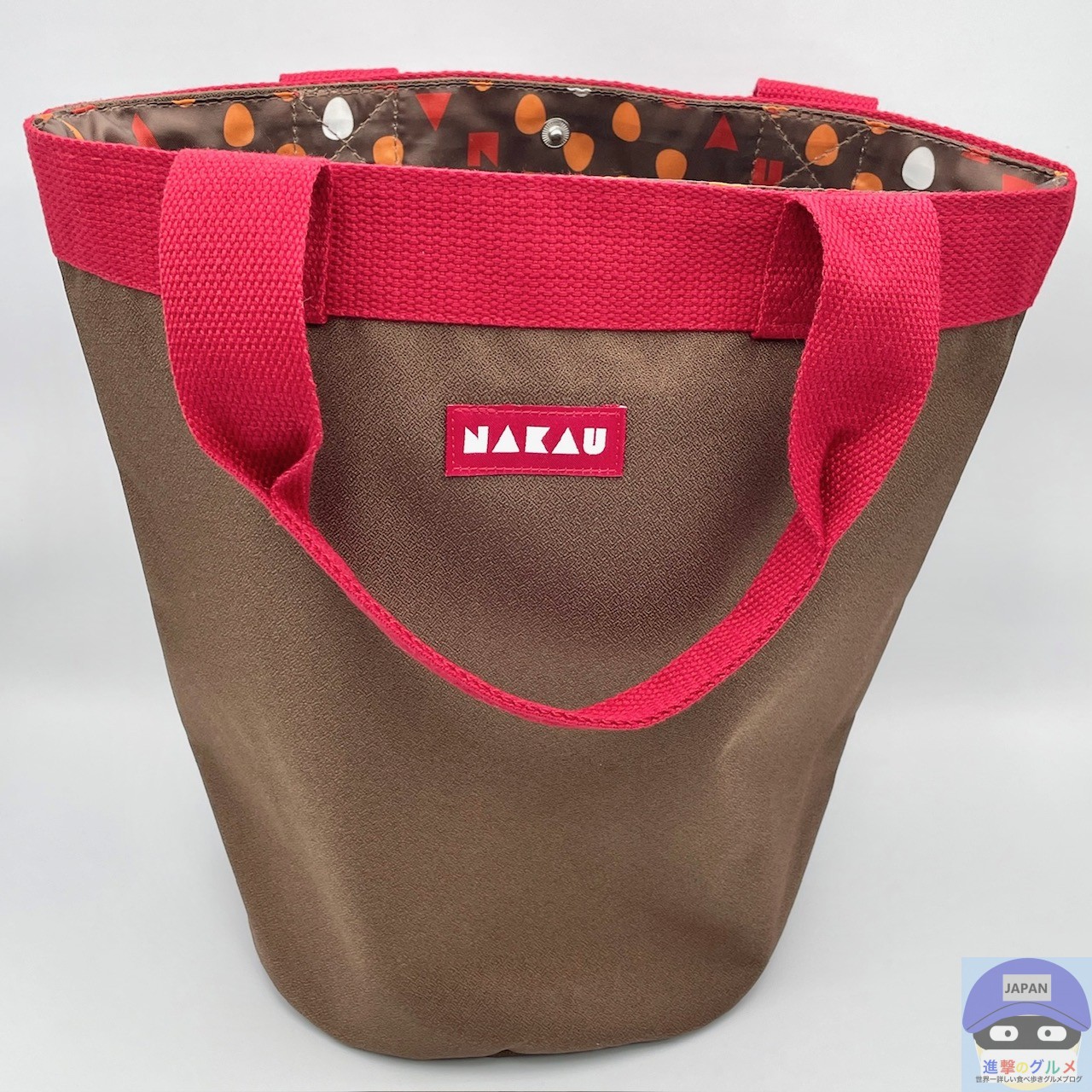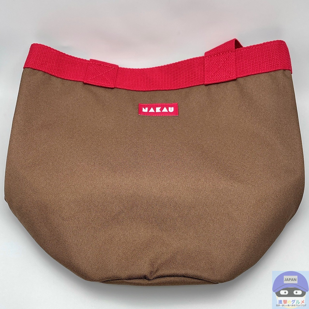 約タテ28.5×ヨコ34.5×マチ21cm、なか卯の赤いワッペンがポイント、落ち着いた色合いです。