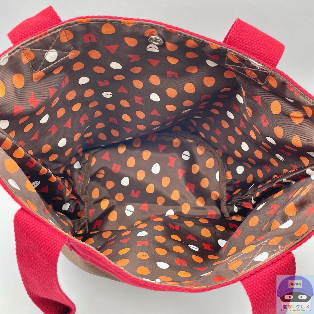 ボタン付きで閉じられ、裏地には、なか卯の”こだわり卵”をモチーフにしたたまごデザインをあしらっています。