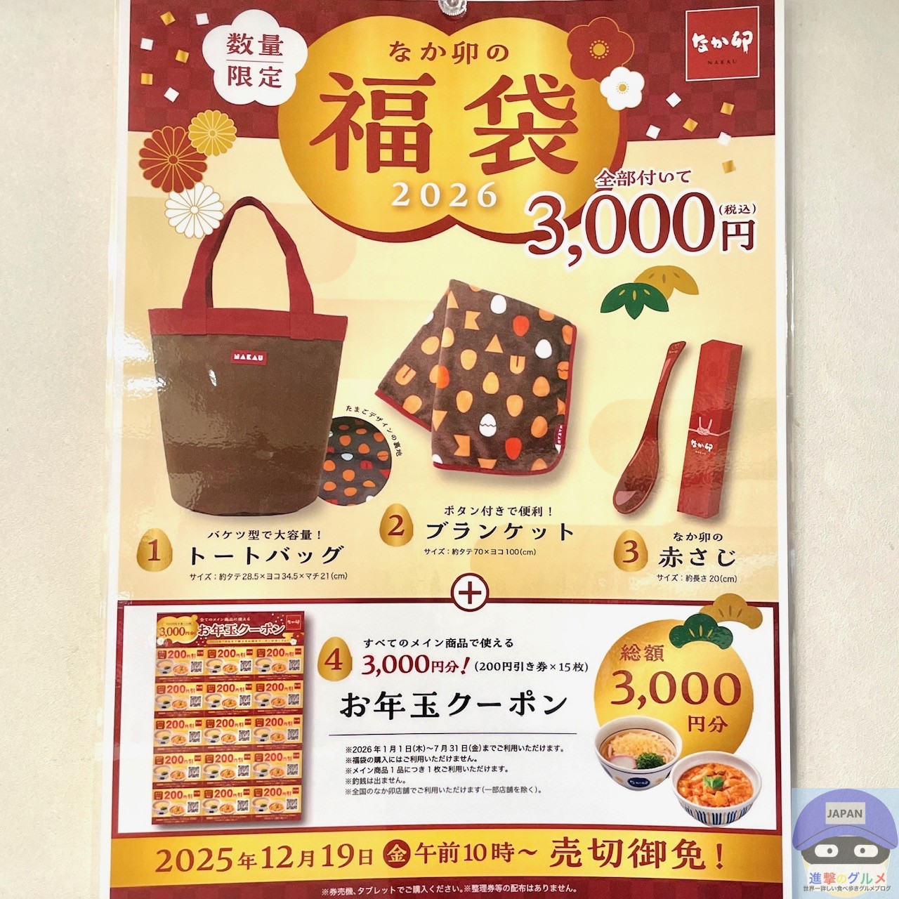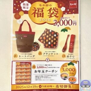 2025年12月19日10時より、「なか卯」が新メニュー「なか卯の福袋(3000円)」を数量限定で発売しました。