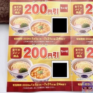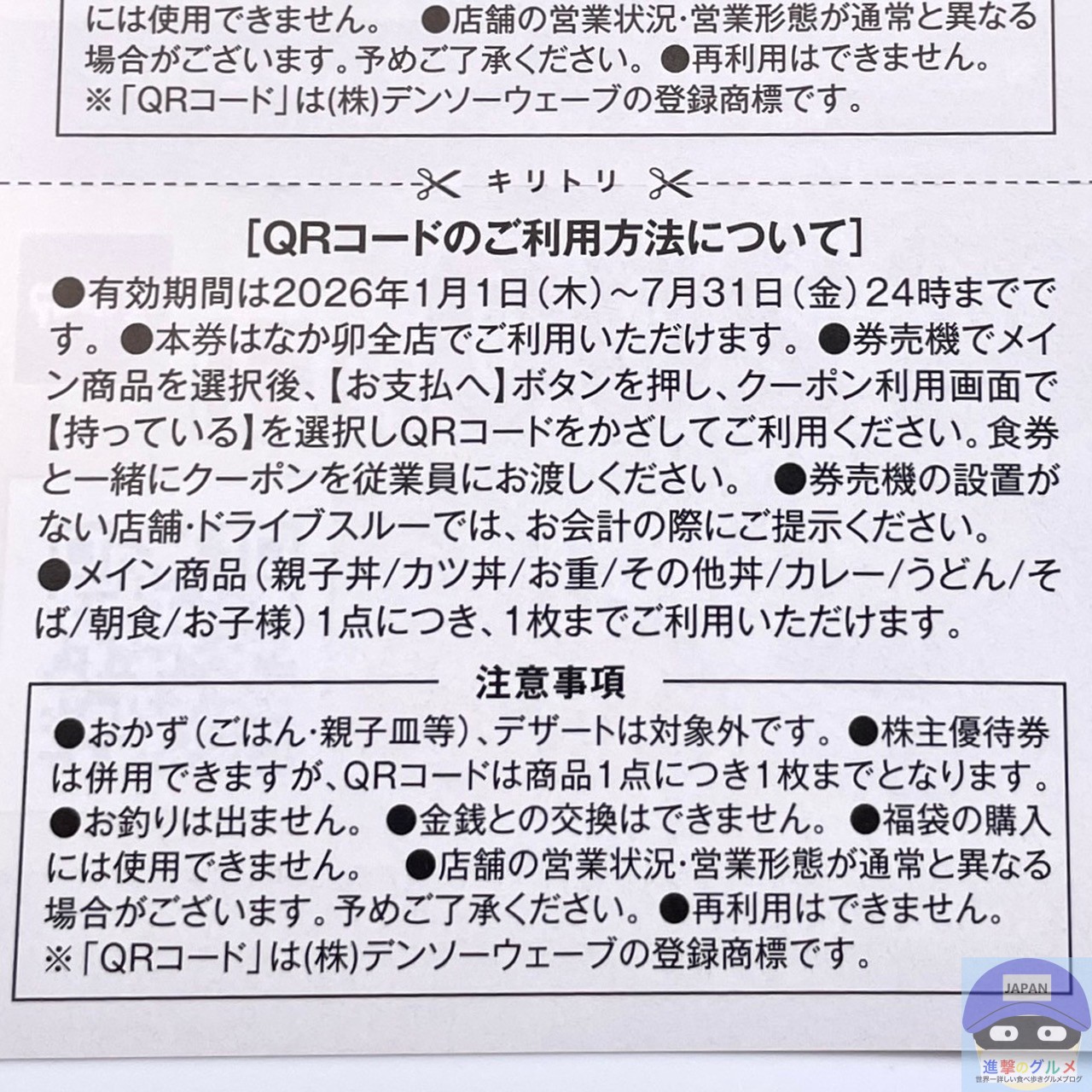 食券機のクーポン利用画面でQRコードをかざして利用し、有効期間は、2026年1月1日から2026年7月31日までです。