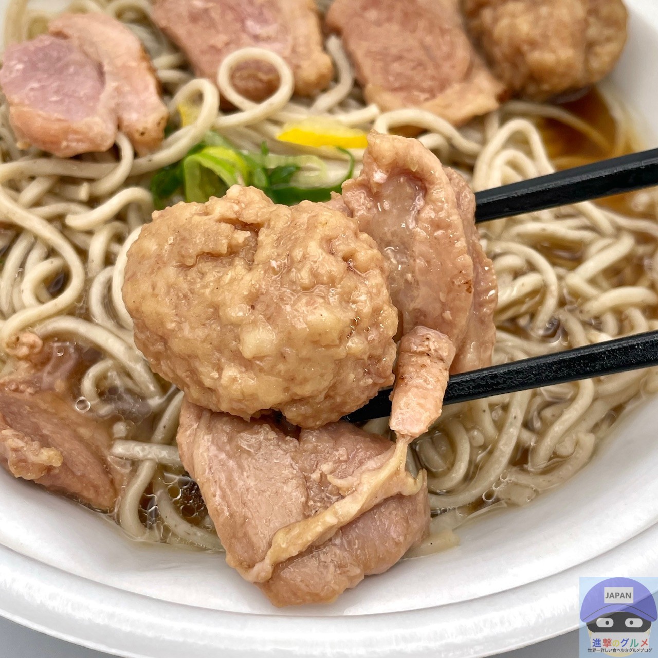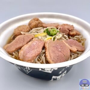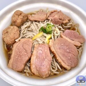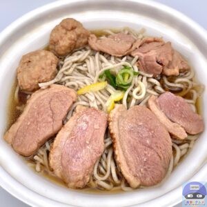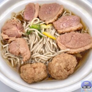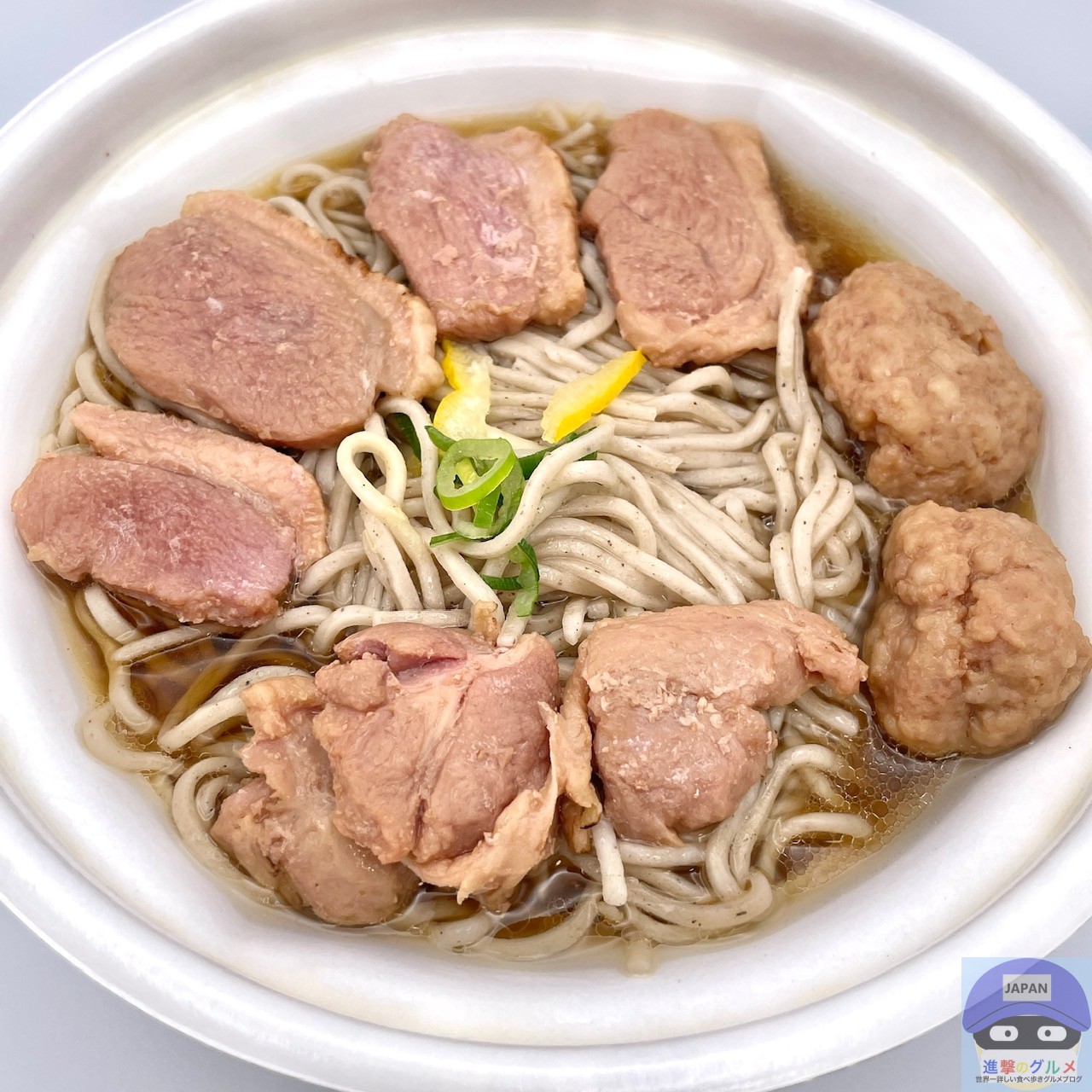 大盛りそばに、鴨むね肉・鴨もも肉・鴨肉団子・青ねぎ・柚子皮をトッピングしています。