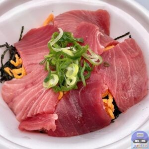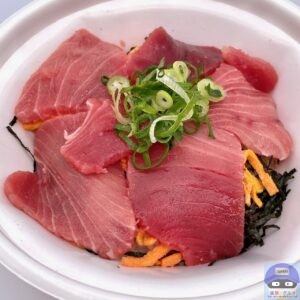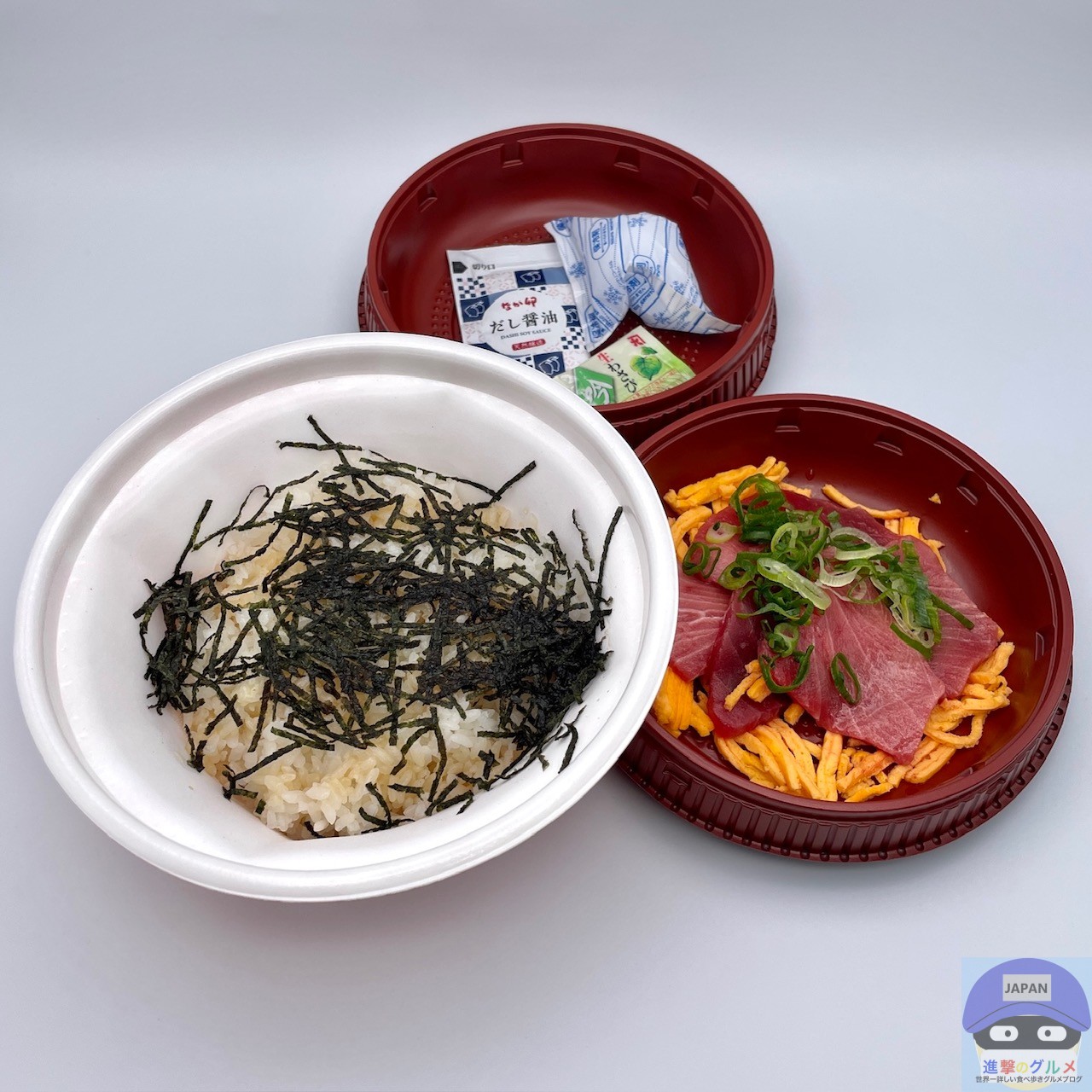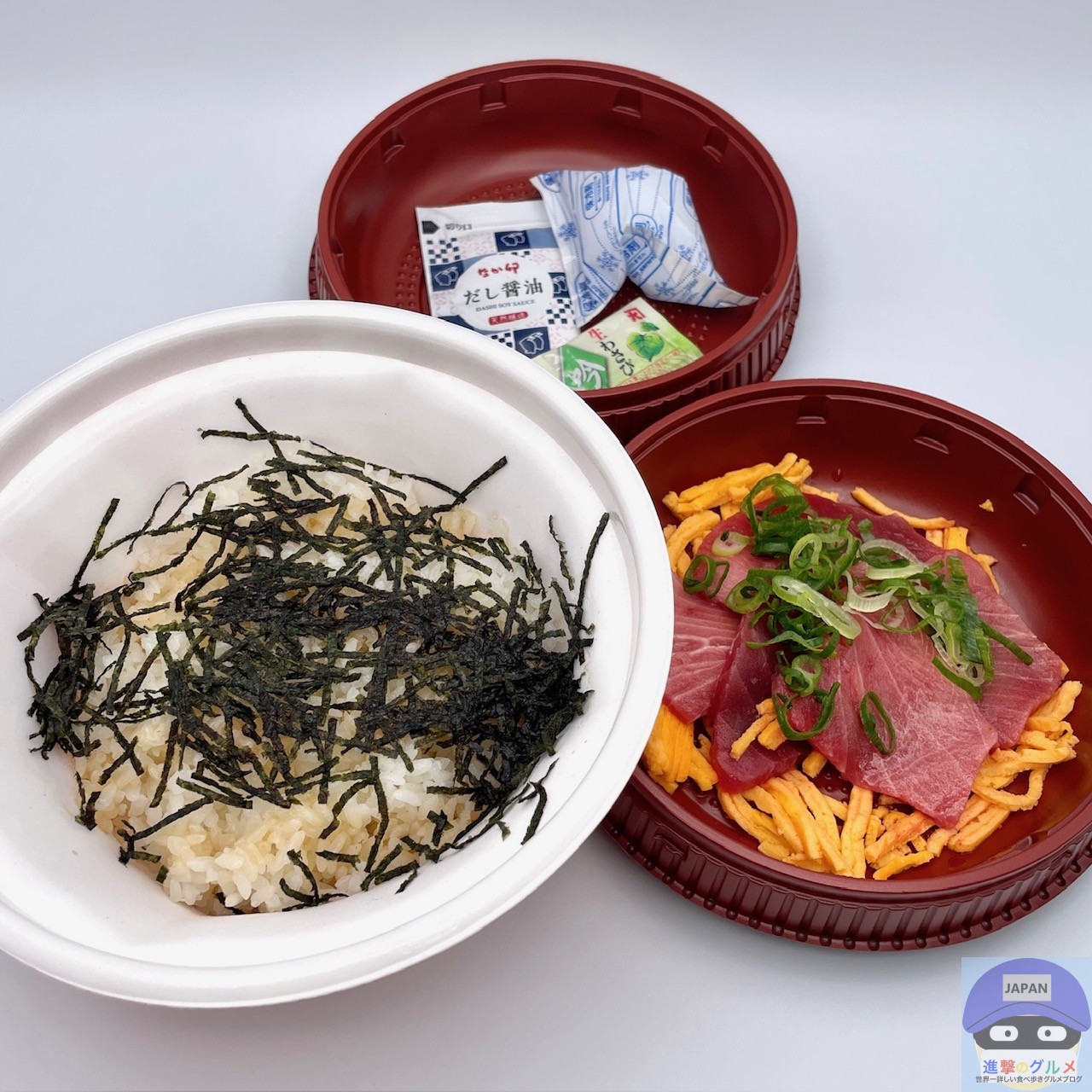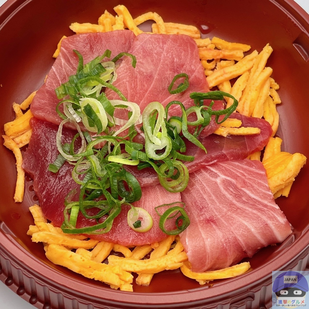 本まぐろ(6切れくらい)、錦糸卵、ねぎ、きざみ海苔、醤油たれ、ごはんで作られています。