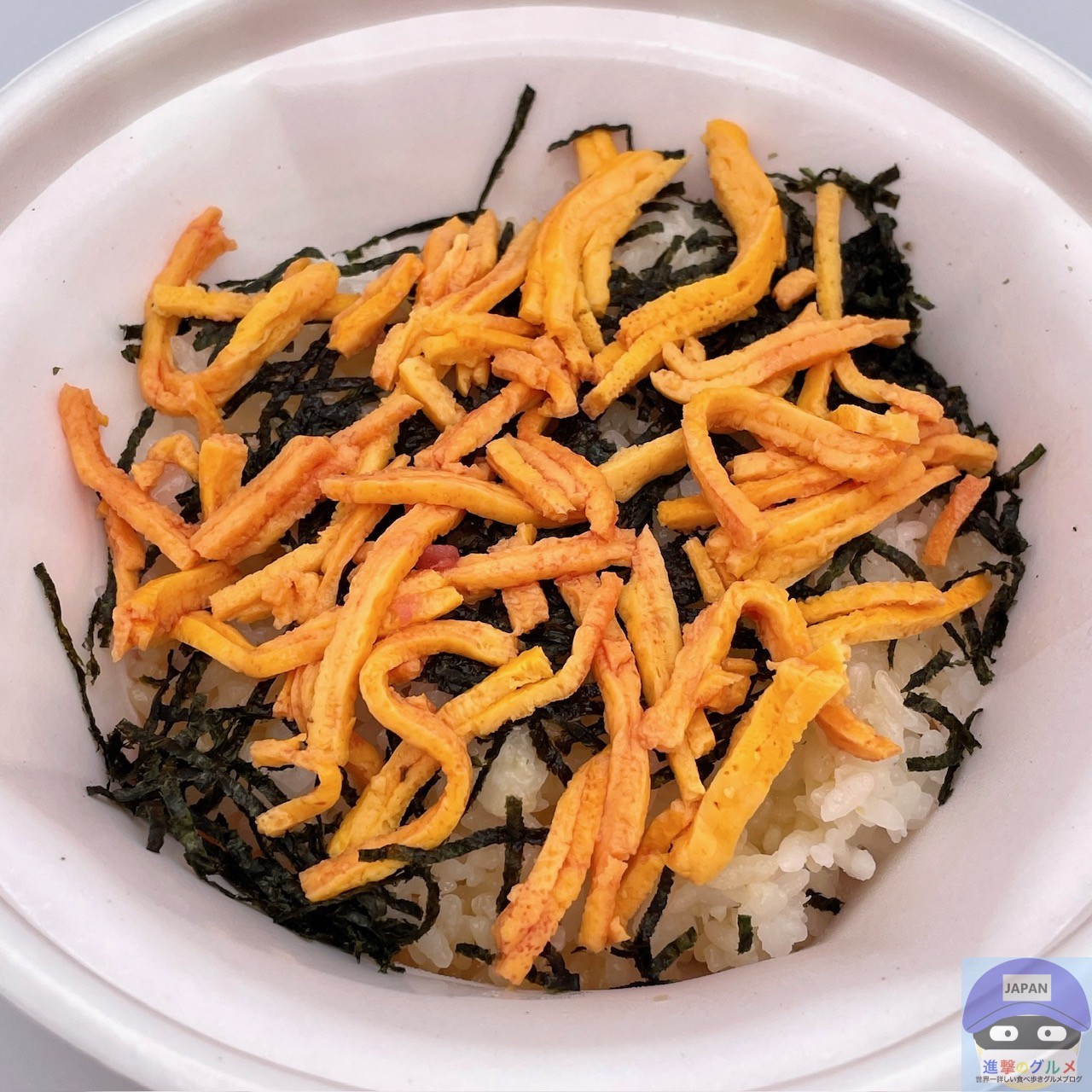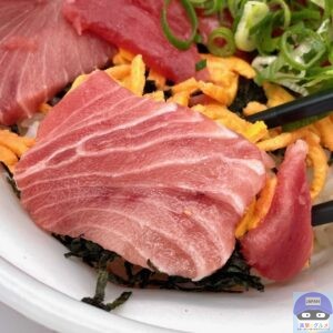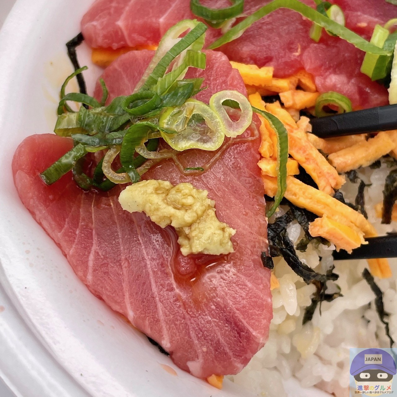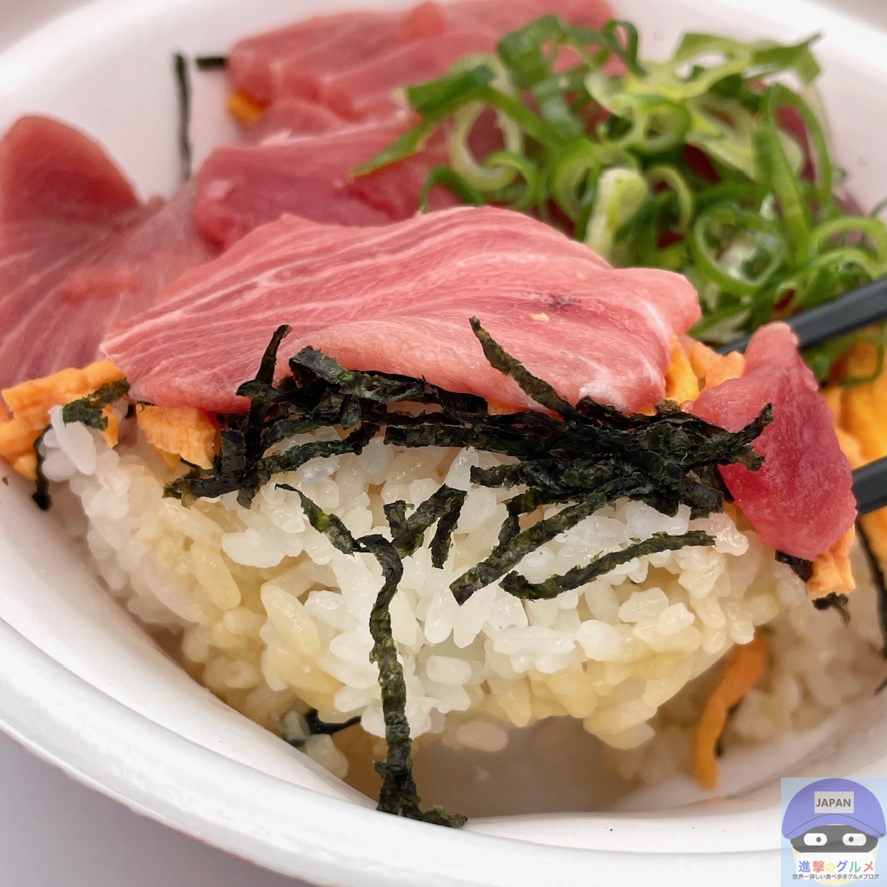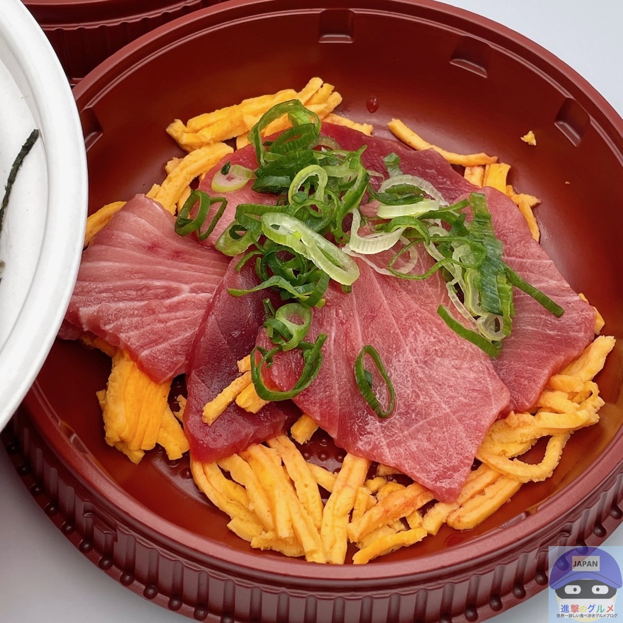 ごはんに少し酢の効いた醤油たれがかかっているため、きざみ海苔と合わせて本まぐろと相性よく、錦糸卵は味わい・食感ともにあまり存在感がありません。