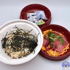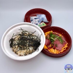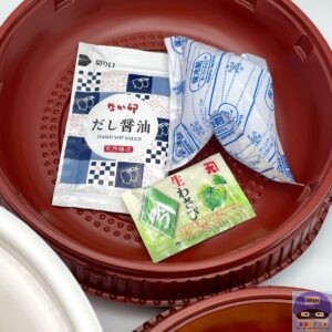 ごはん、具材、保冷剤、だし醤油、わさびが分かれています。