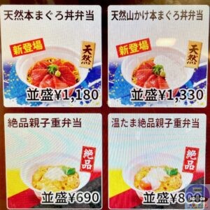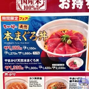 メニューは、「天然本まぐろ丼・並盛(1180円)」、「山かけ天然本まぐろ丼・並盛(1330円)」、まぐろ2倍・ごはん大盛り「特盛(+700円)」などがあります。