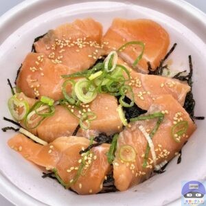 なか卯特製のタレに漬け込んだサーモンを贅沢に盛りつけた商品です。
