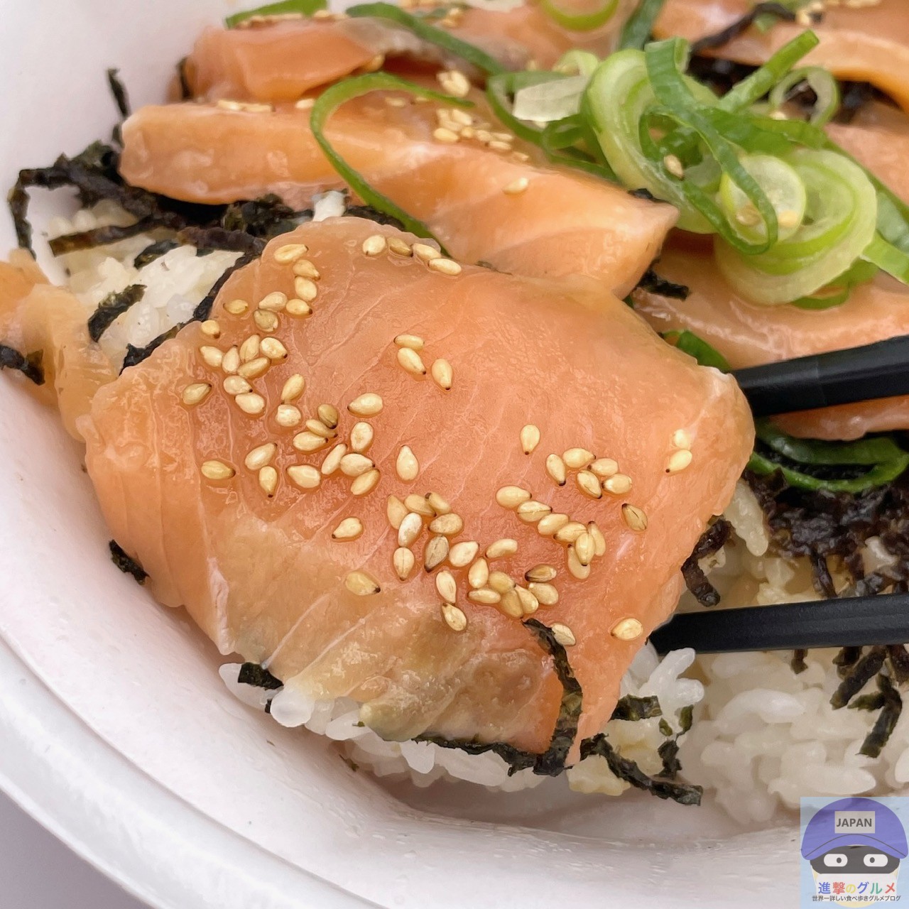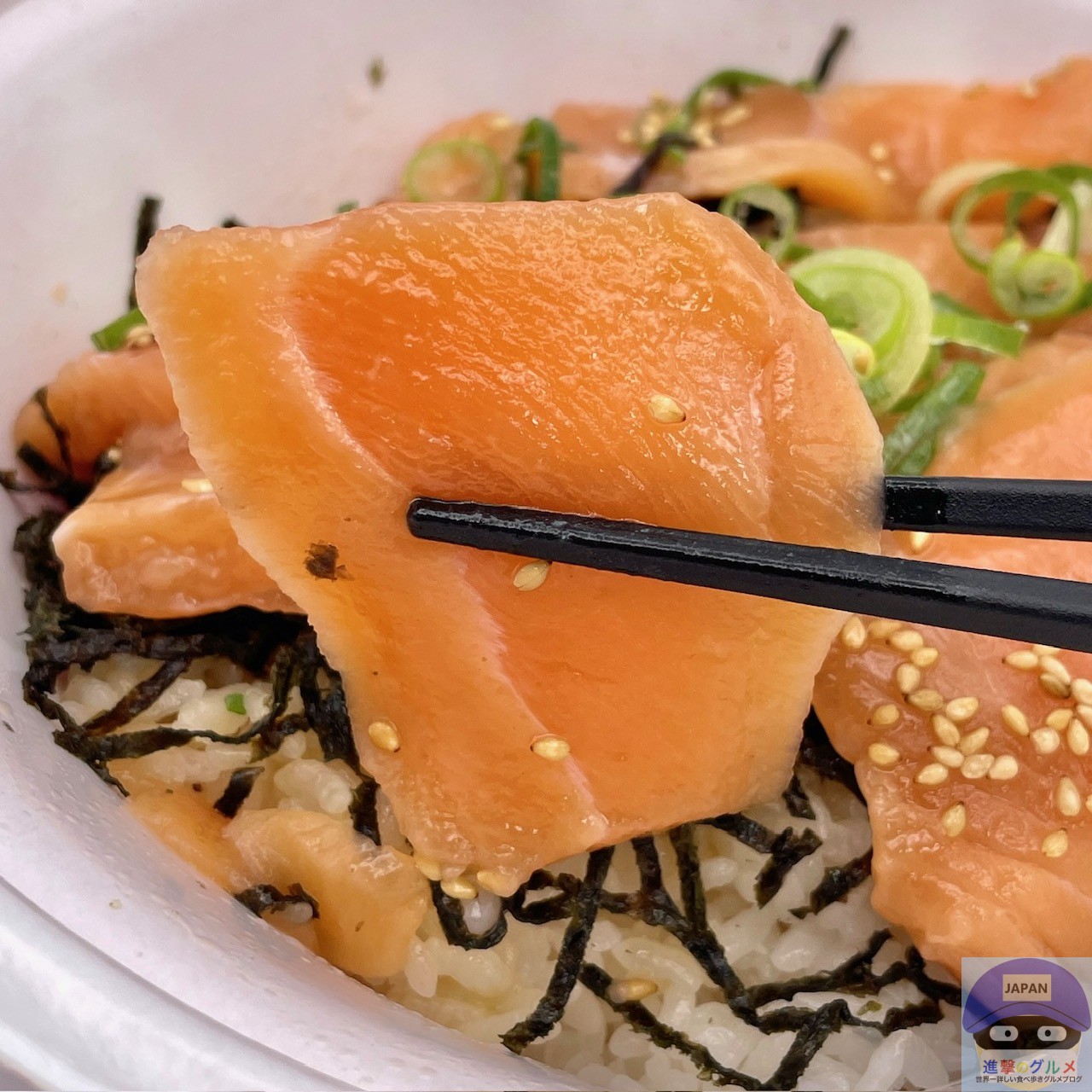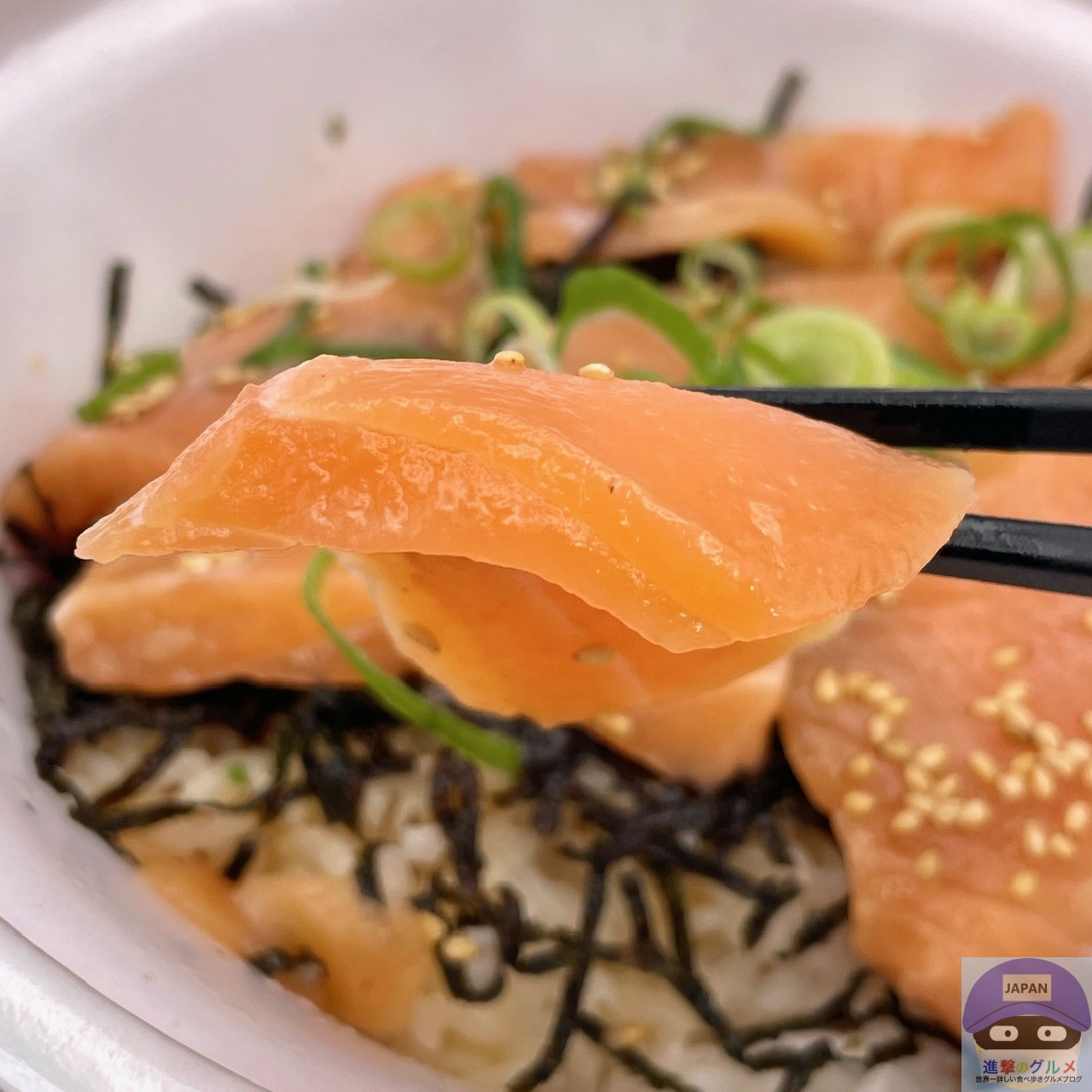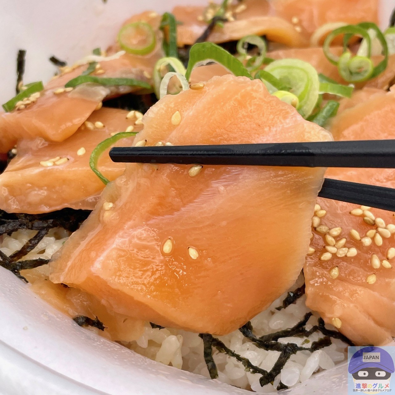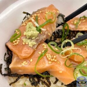 ごはんには、少し酢の効いた醤油たれがかかっているため、漬けサーモンと合います。