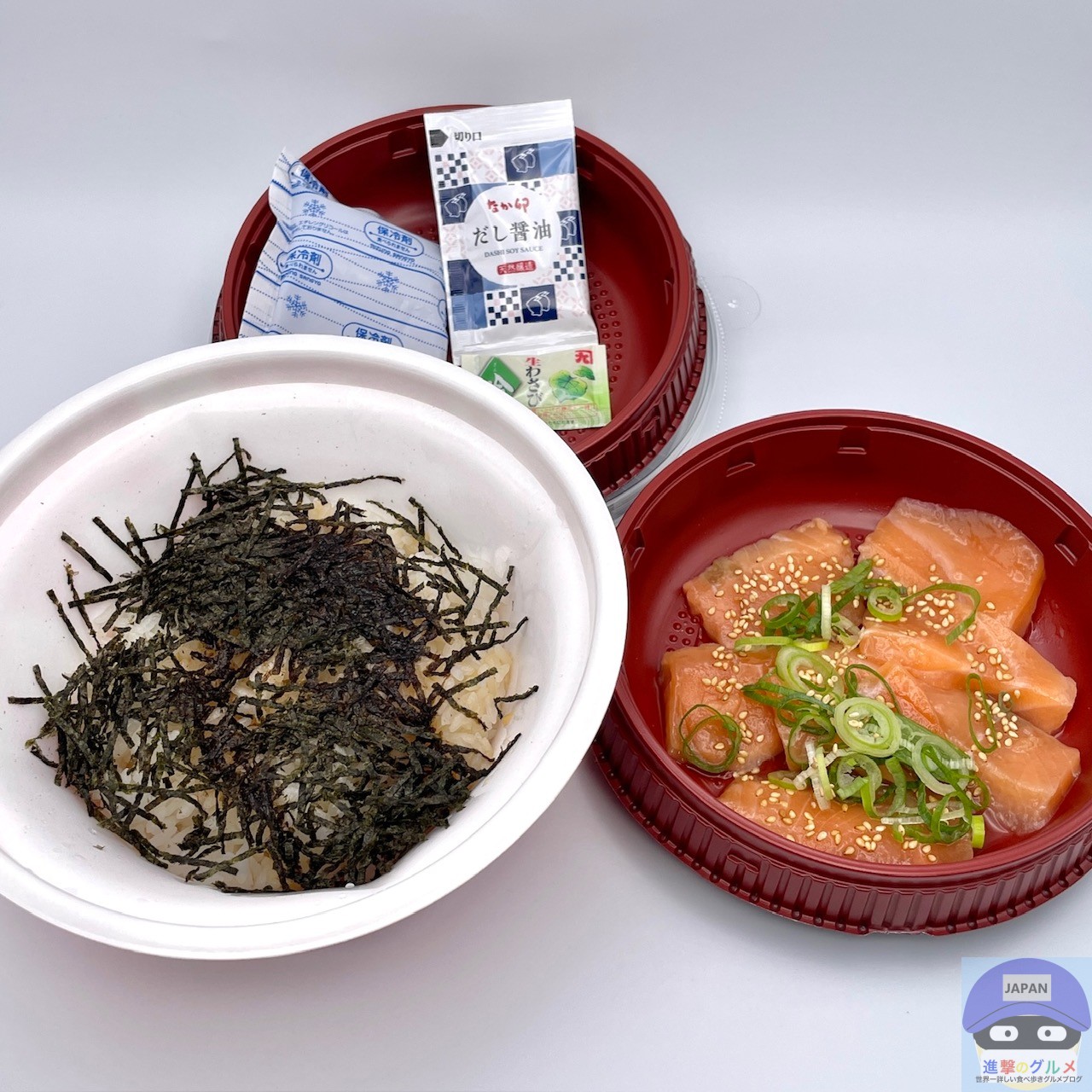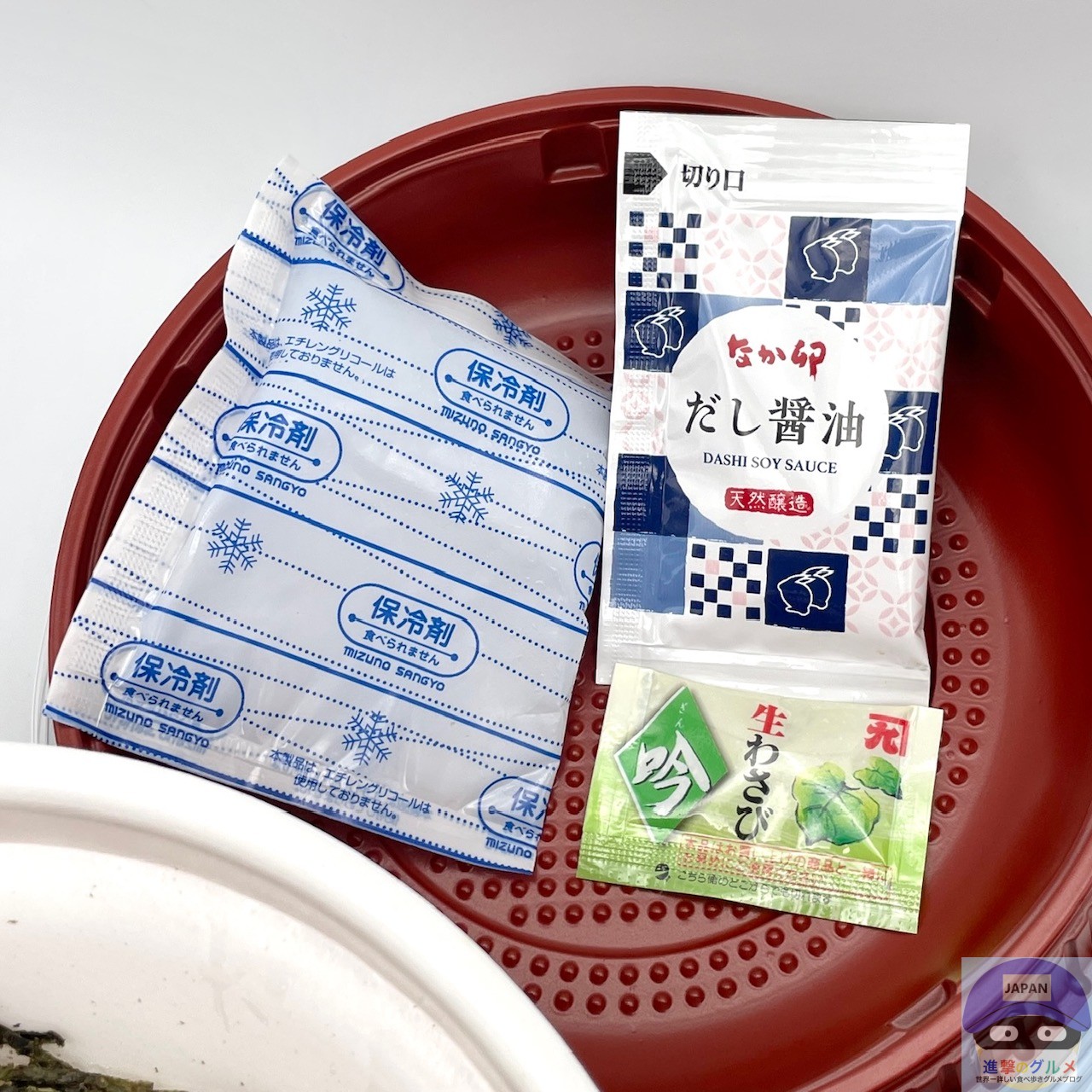ごはん、具材、保冷剤、だし醤油、わさびが分かれています。