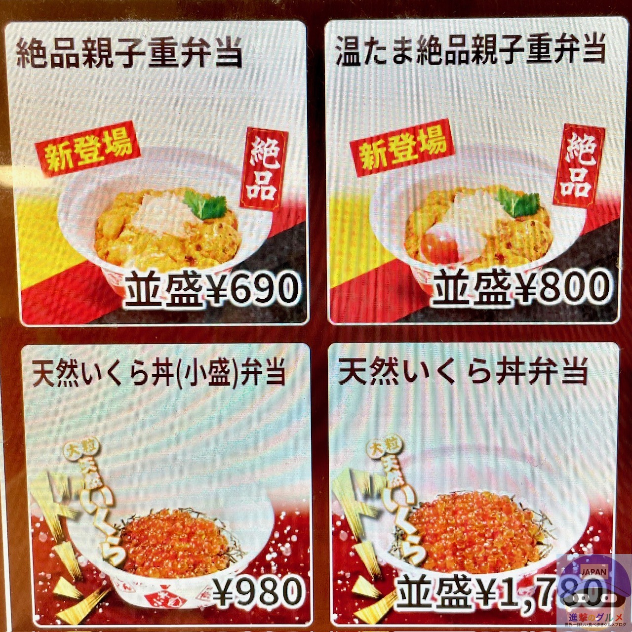 メニューは、「絶品親子重・並盛(690円)」、「温たま絶品親子重・並盛(800円)」、「ごはん大盛り(+90円)」があります。