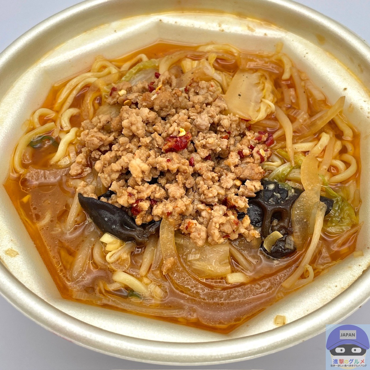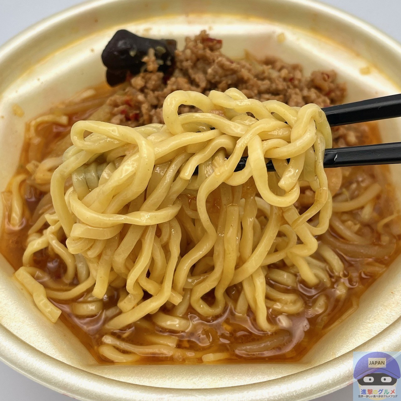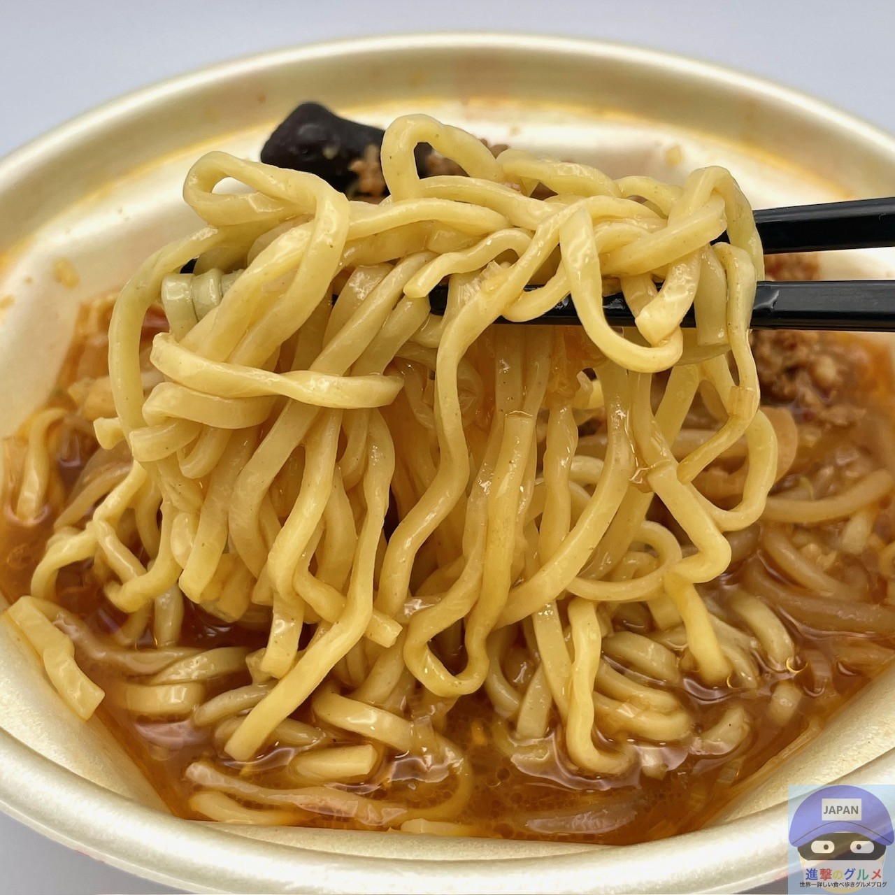 四川山椒と香味辣油が効いた味噌ベースのスープ、具材(挽き肉・唐辛子・白菜・もやし・玉ねぎ・ねぎ・きくらげなど)、平打ち麺で作られています。