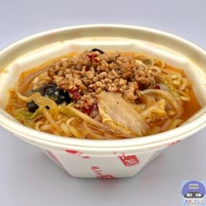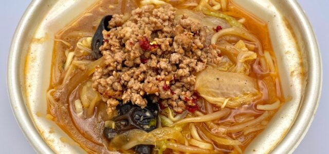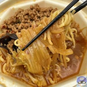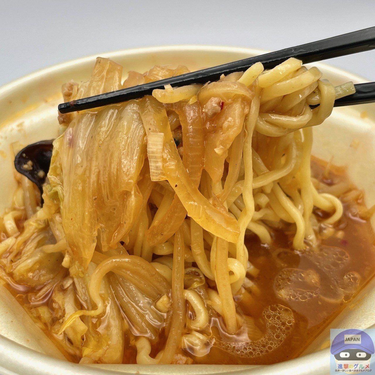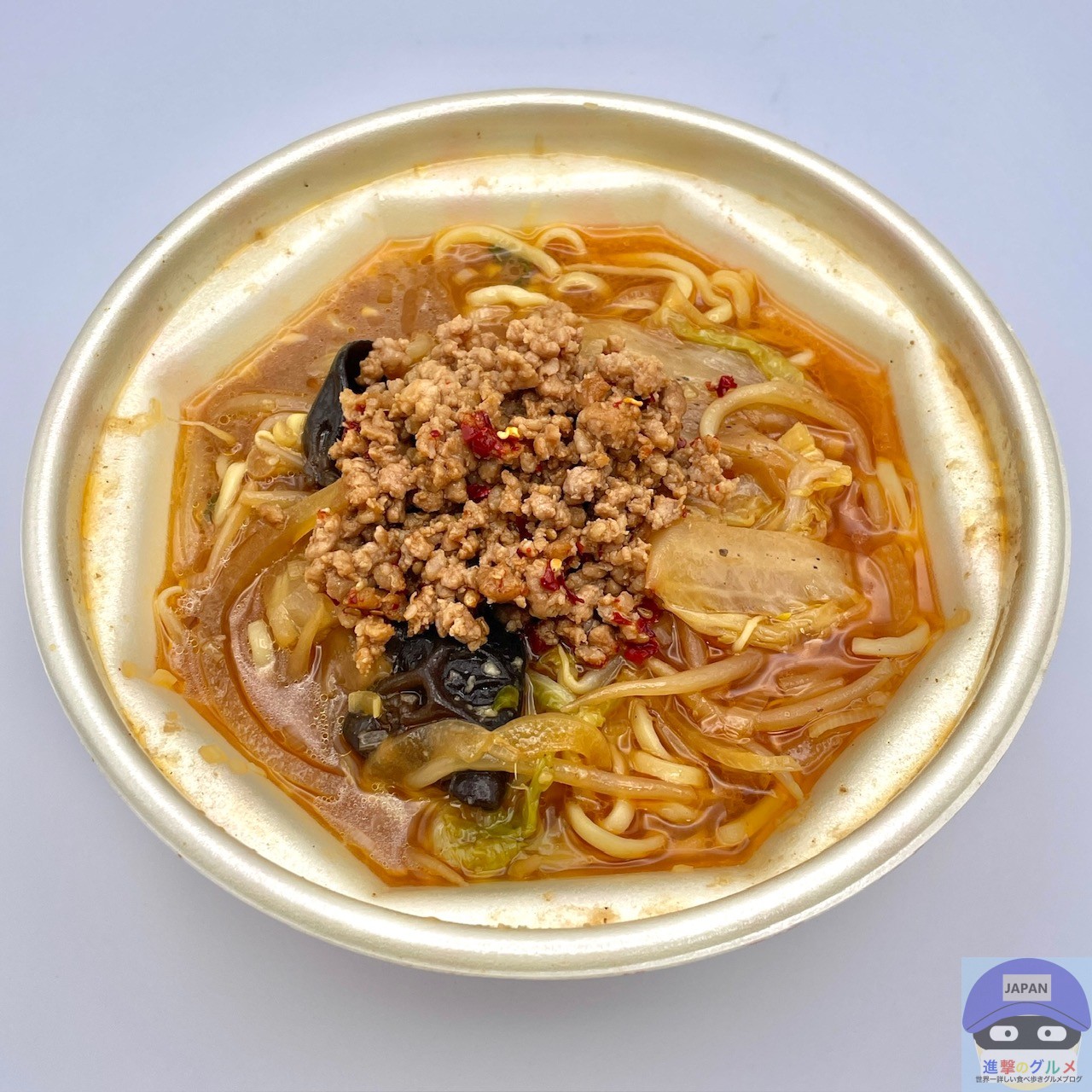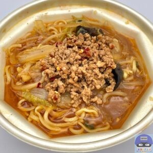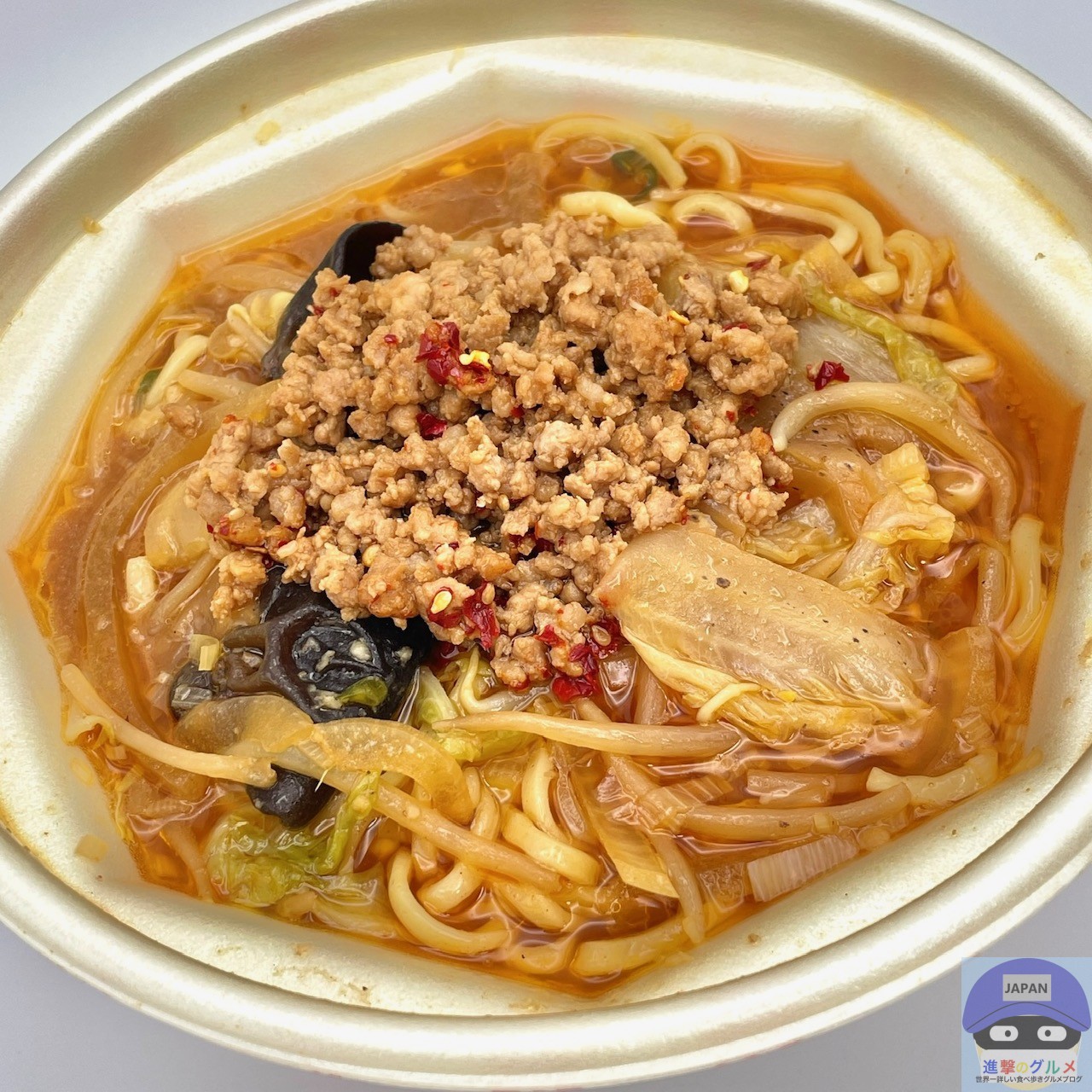 四川山椒と香味辣油が効いた味噌ベースのスープ、具材(挽き肉・唐辛子・白菜・もやし・玉ねぎ・ねぎ・きくらげなど)、平打ち麺で作られています。